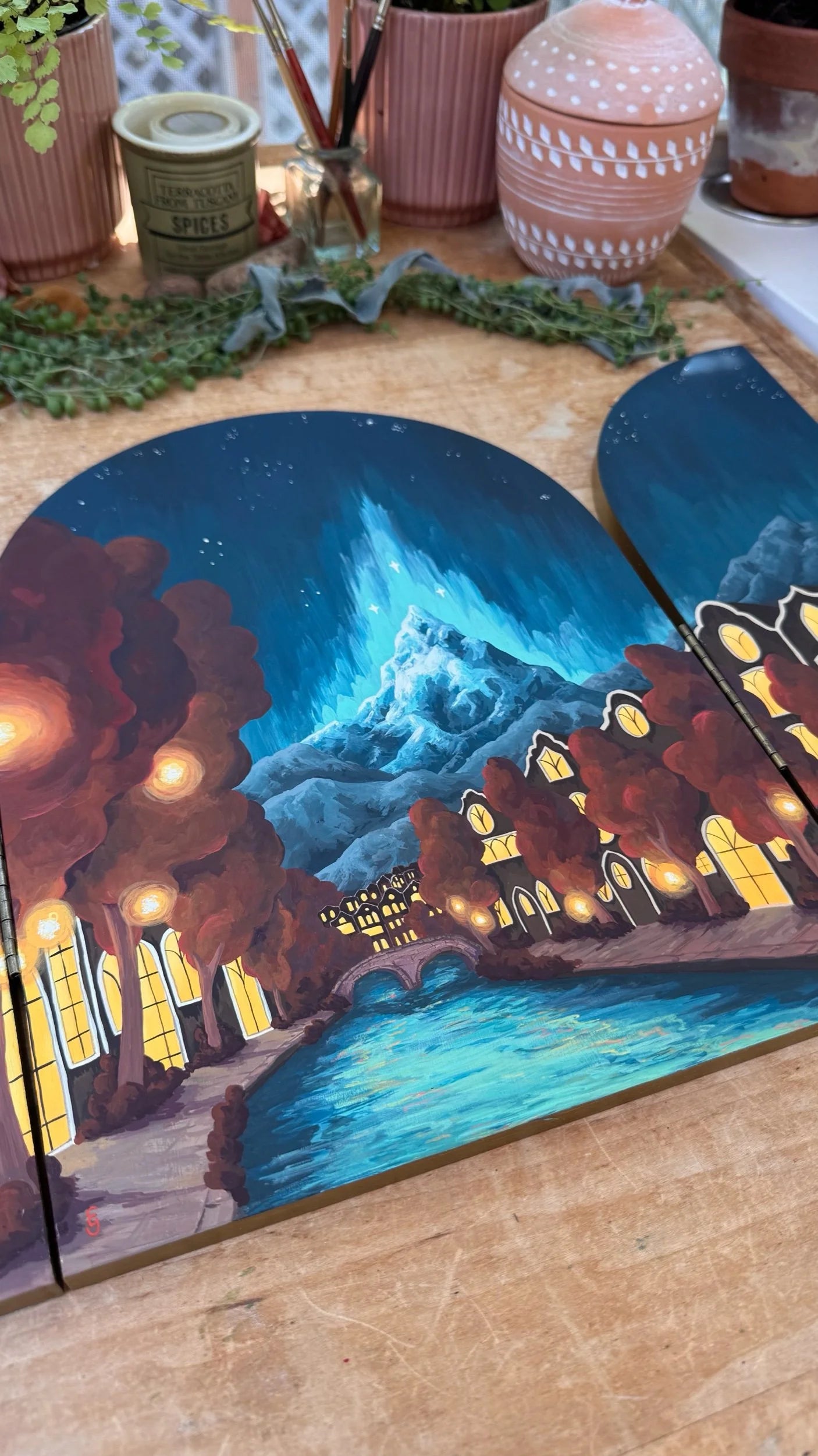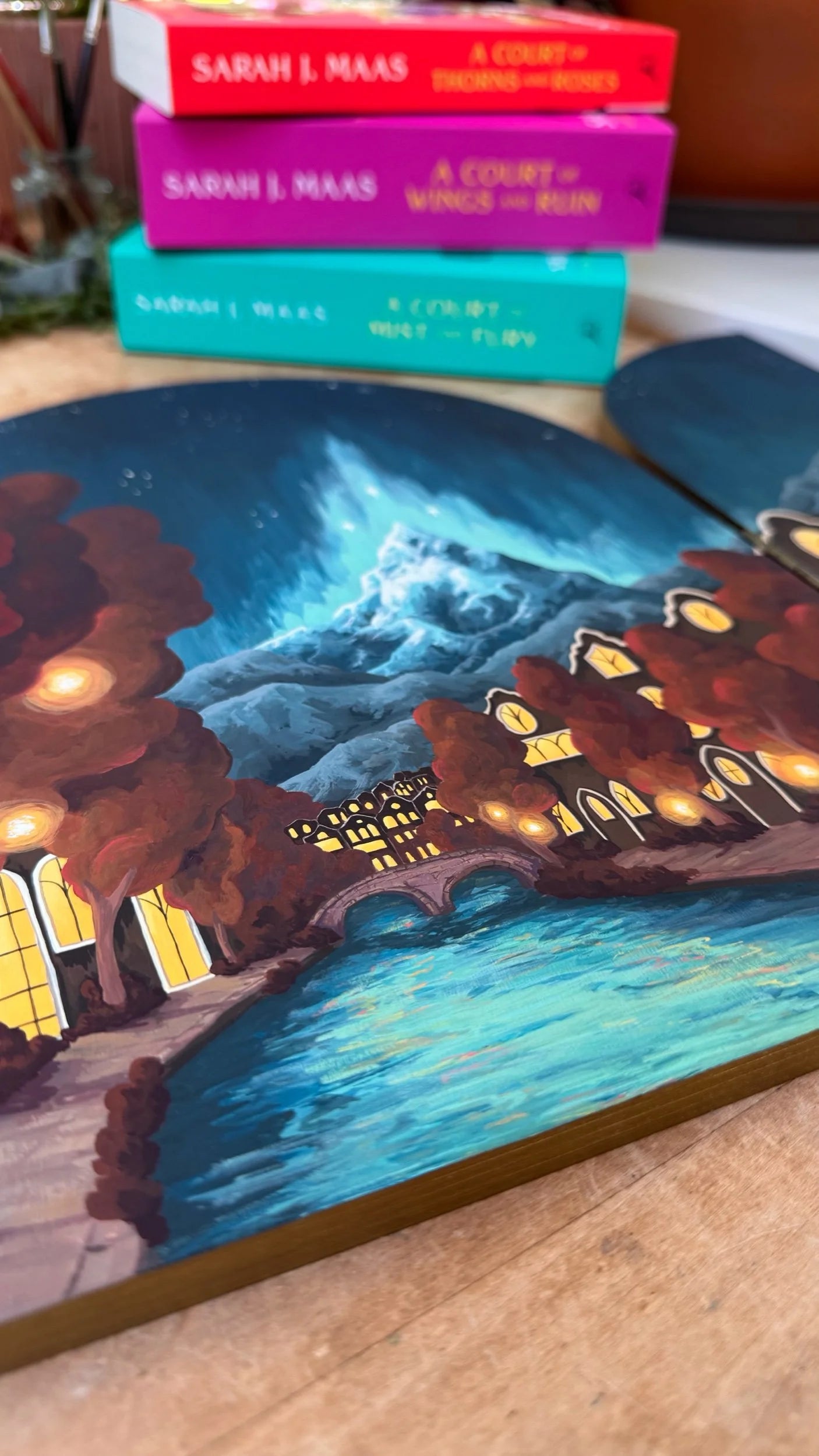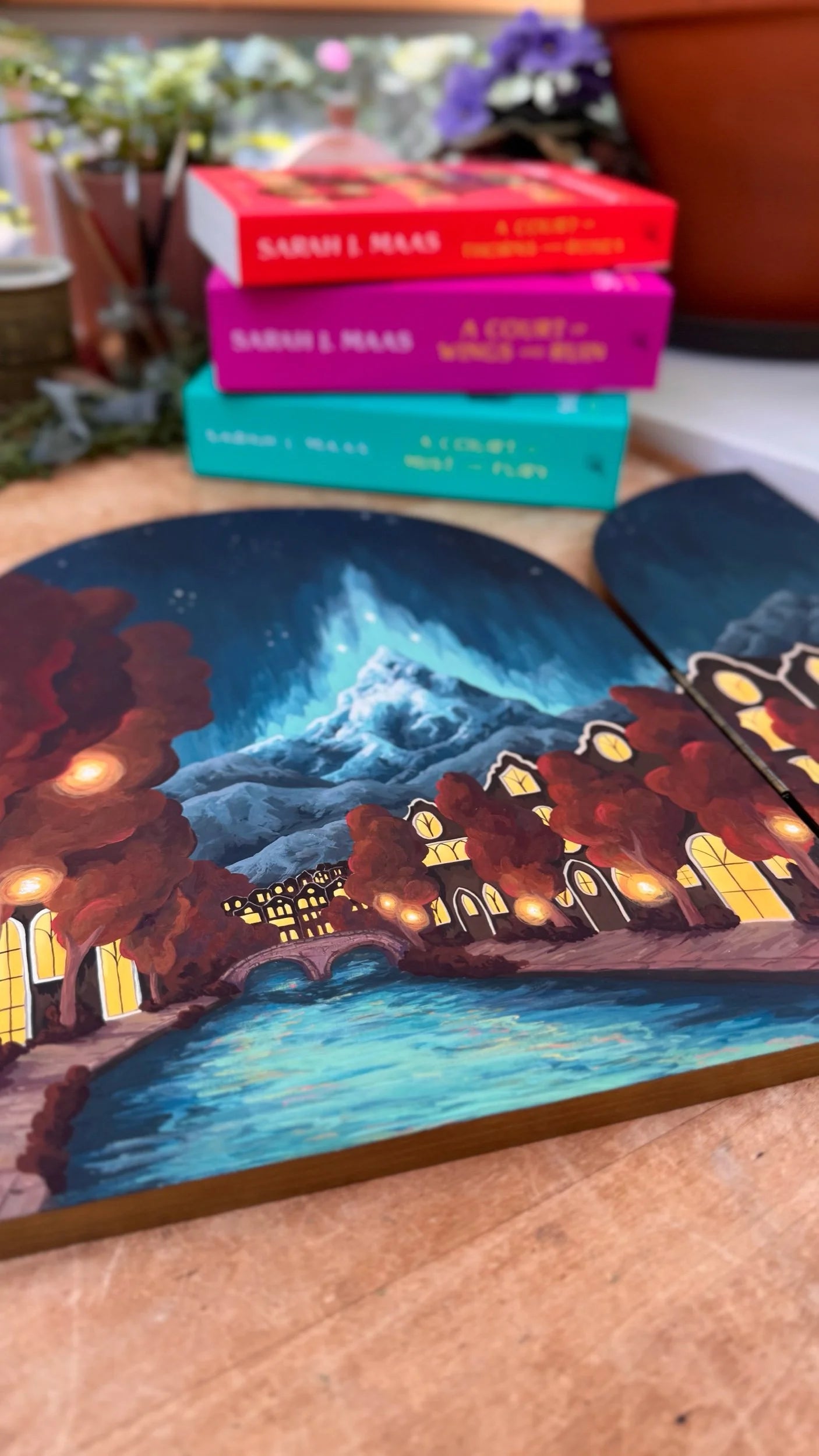 Original hand-painted illustration inspired by the A Court of Thorns and Roses series. This unique folding panel includes two paintings - on the outside, you’ll find the wolf in the snowy woods from the beginning of the series, but when you open it to reveal the inside, you’ll see Velaris, the City of Starlight. I wanted the painting to feel like the viewer had stepped into the story to explore the city, so the view shows the iconic mountain and stars from the brightly lit streets.