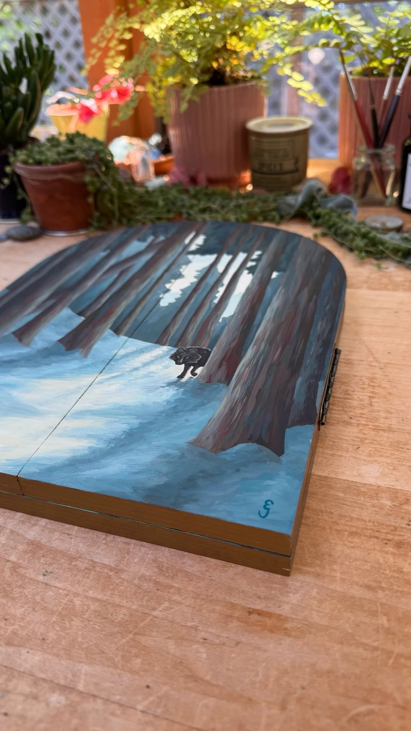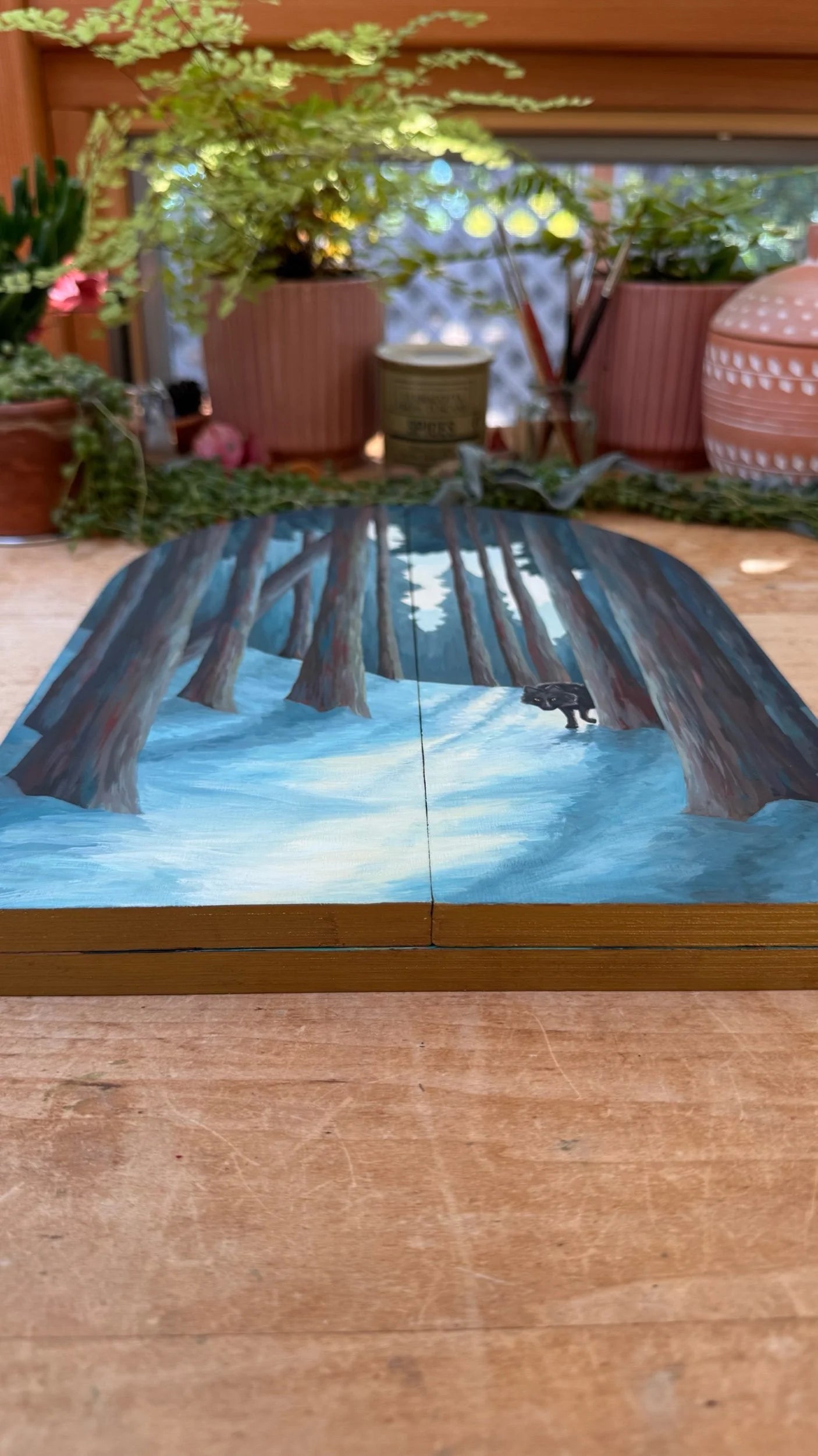 The painting has a keyhole cutout in the back so it can be hung on the wall using a nail. Please note, when hanging on a wall, the folding pieces may not sit completely closed, but instead hang slightly apart, inviting the viewer to open the panel and discover the second painting. It can also be displayed standing up on a shelf, and would make a delightful addition to a bookshelf or reading nook.