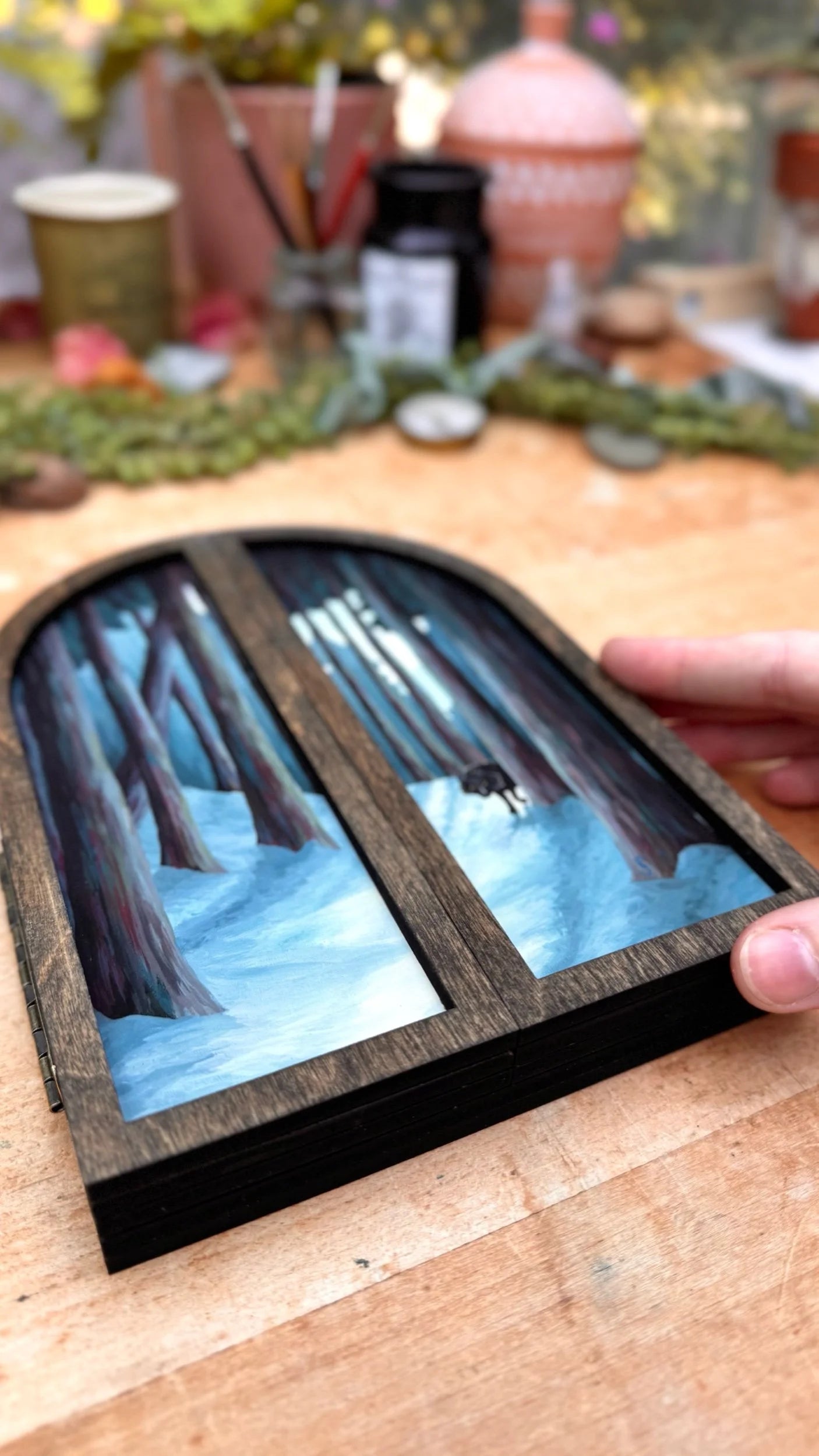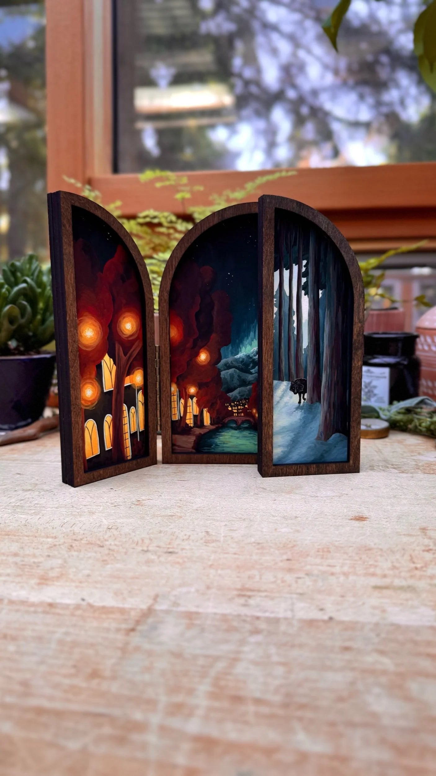 This unique framed, folding print is made from my original hand-painted illustration inspired by the A Court of Thorns and Roses series. The folding design includes two illustrations - on the outside face, you’ll find the wolf in the snowy woods from the beginning of the series, but when you open it to reveal the inside, you’ll see Velaris, the City of Starlight. I wanted the painting to feel like the viewer had stepped into the story to explore the city, so the view shows the iconic mountain and stars from the brightly lit streets of the city.