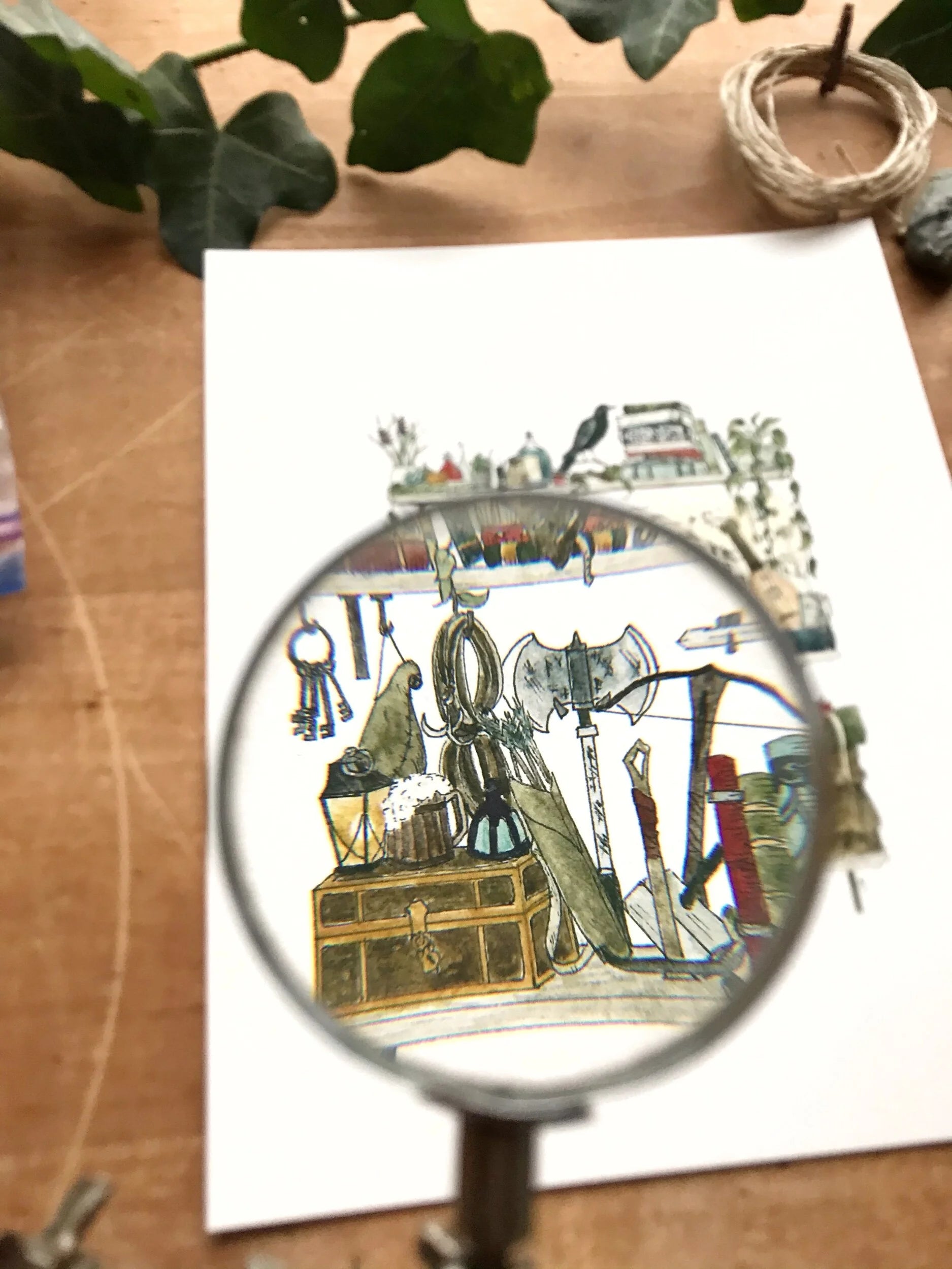 Giclée print featuring my original watercolor and ink illustration of the books, oddities, and useful trinkets tucked away in the shelves of an intrepid adventurer, including a tiny dragon and a rather talkative raven.