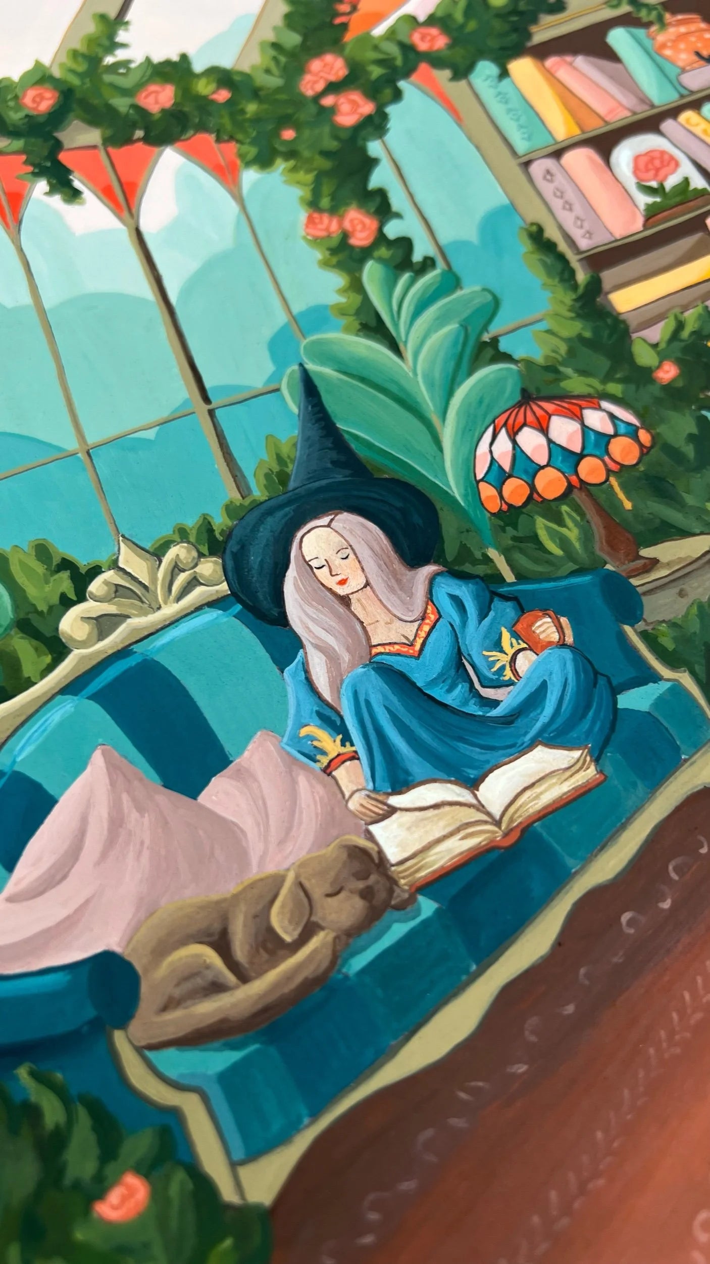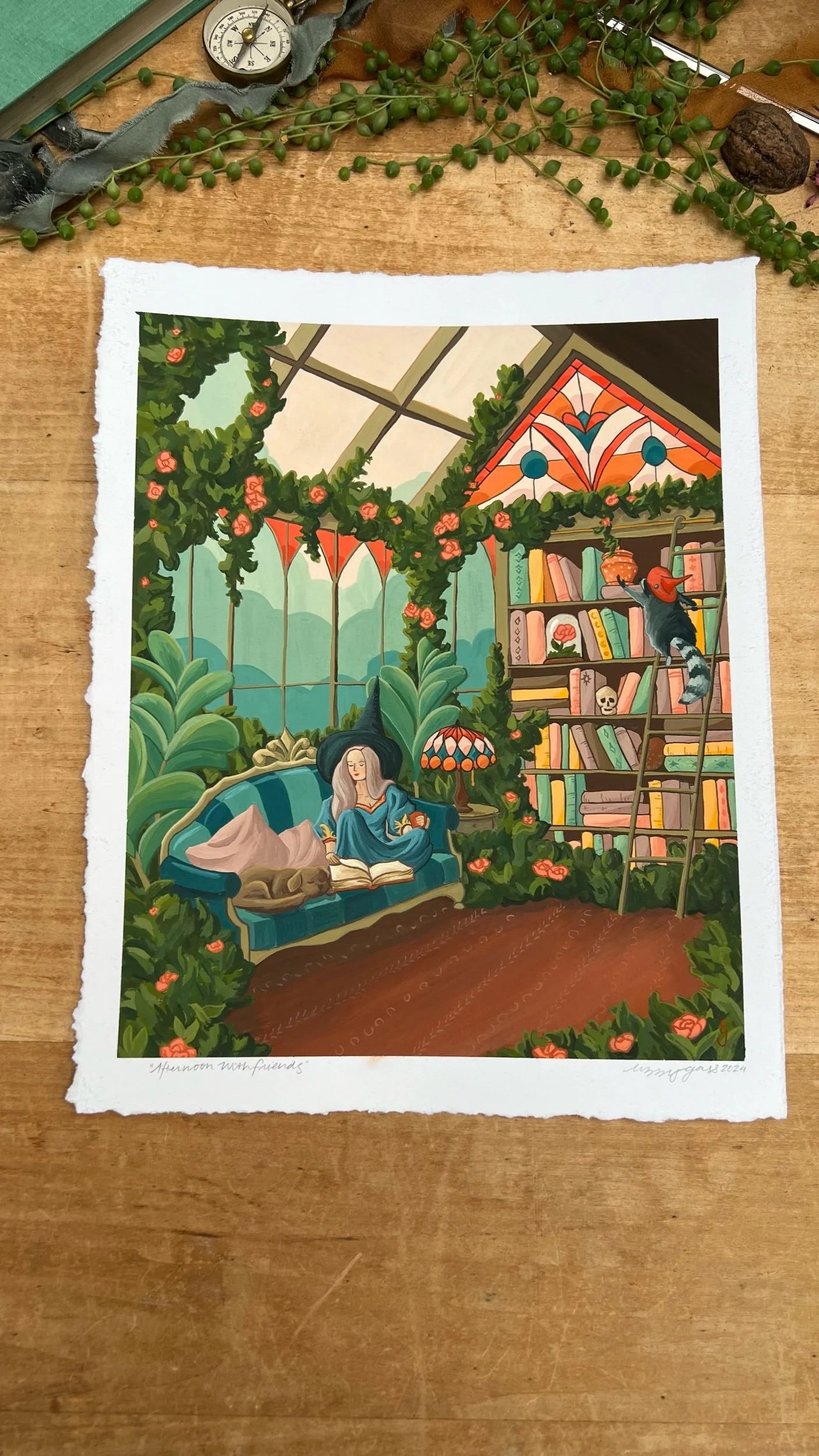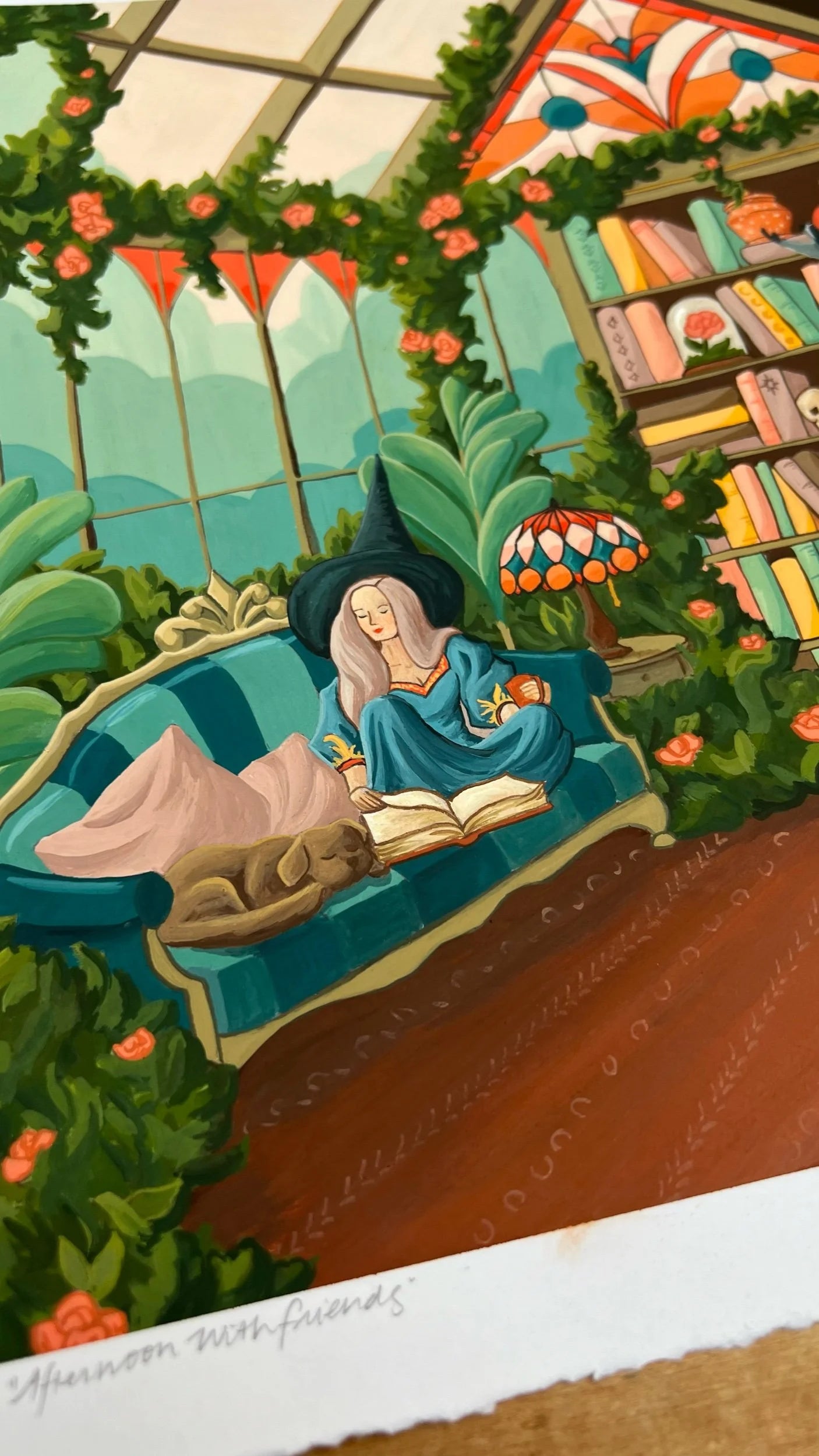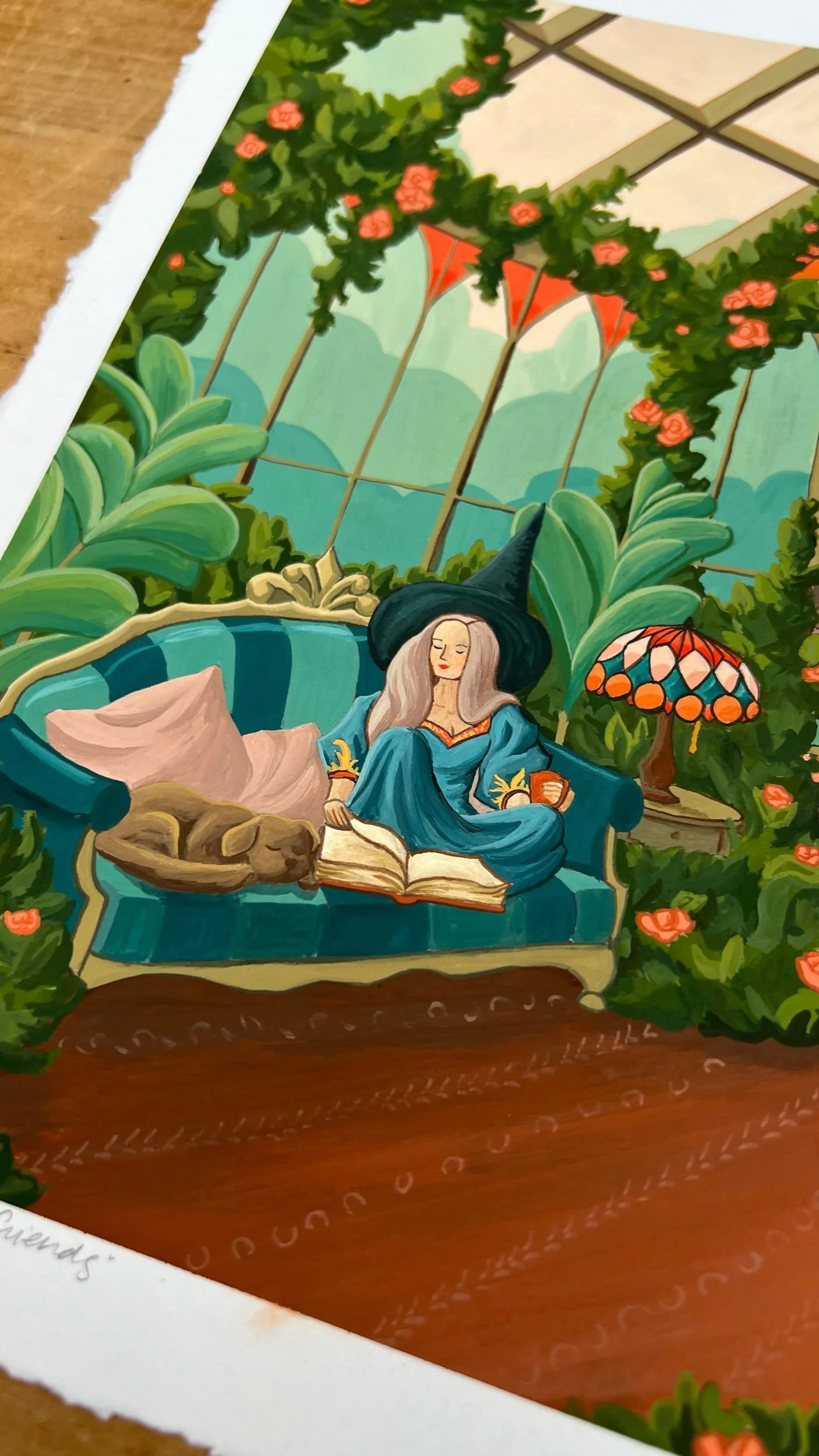 Original gouache illustration of a cozy greenhouse with stained glass accents, full of sunshine, flowers, a reading witch, and her delightful friends. You’ll find a loyal dog curled up happily on the sofa and a mischievous raccoon climbing high on a library ladder to reach a jar of cookies.