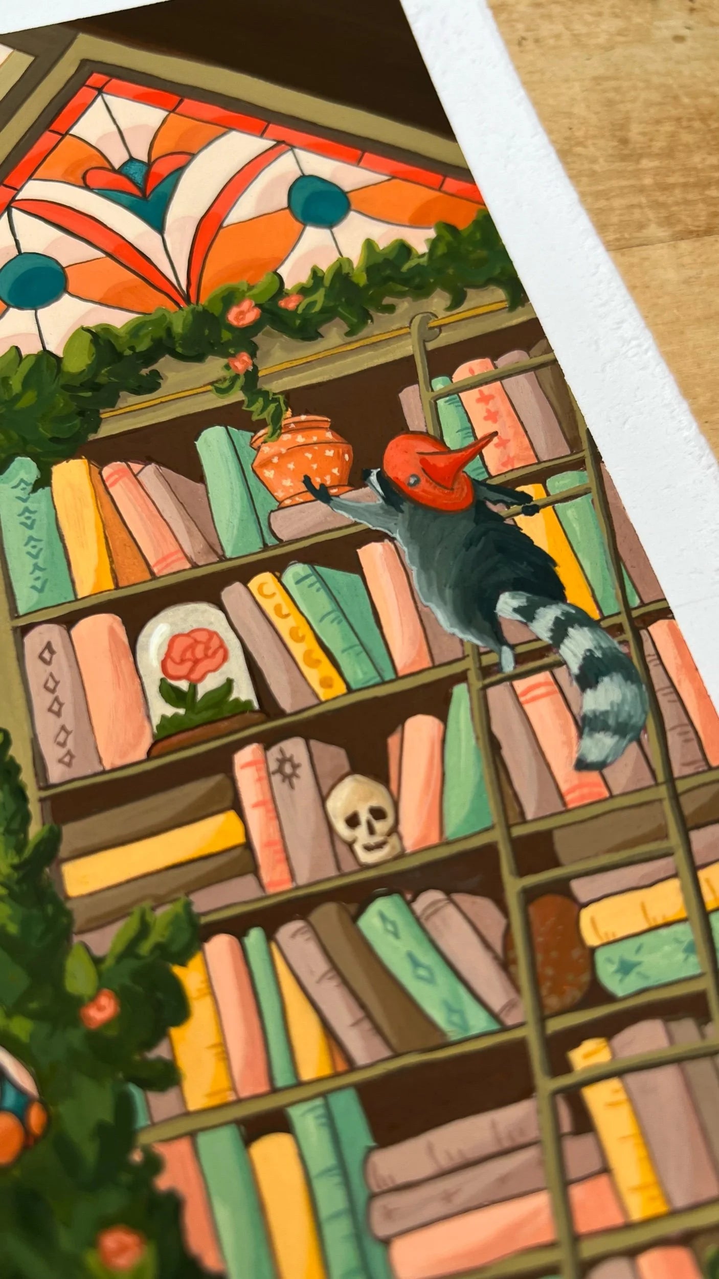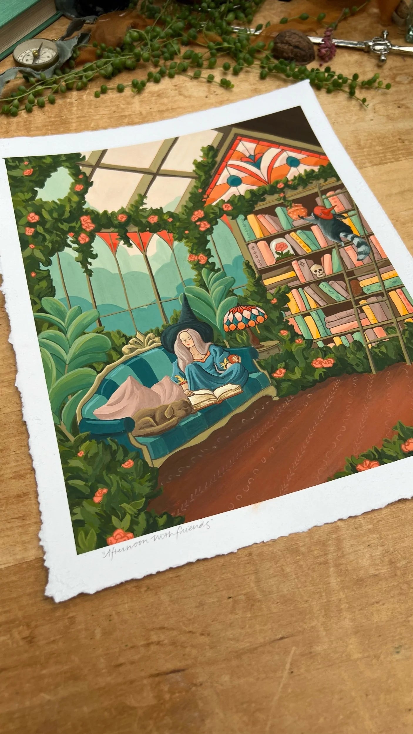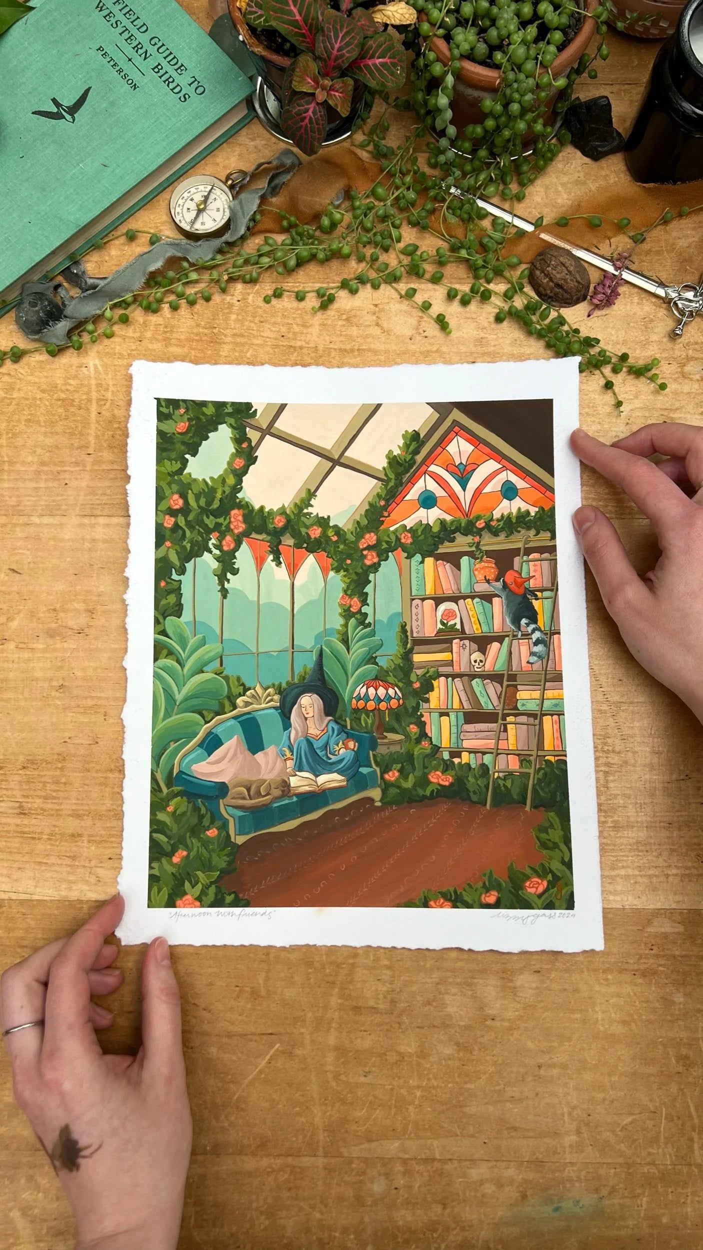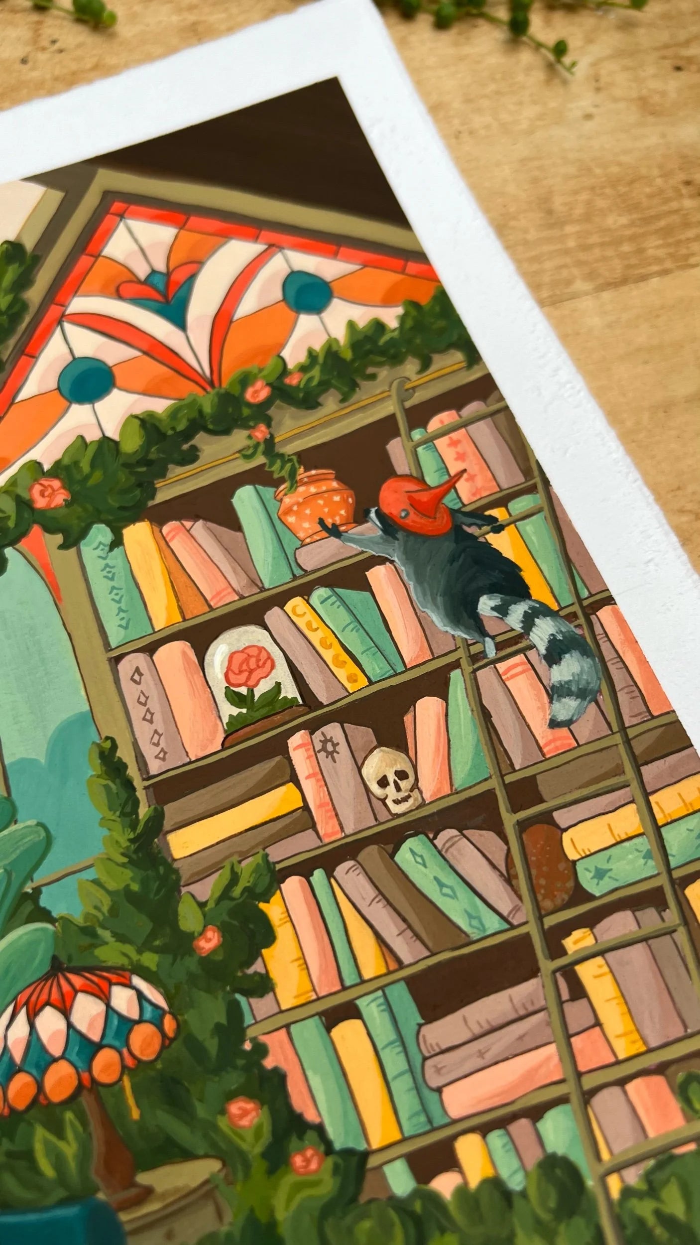Original gouache illustration of a cozy greenhouse with stained glass accents, full of sunshine, flowers, a reading witch, and her delightful friends. You’ll find a loyal dog curled up happily on the sofa and a mischievous raccoon climbing high on a library ladder to reach a jar of cookies.