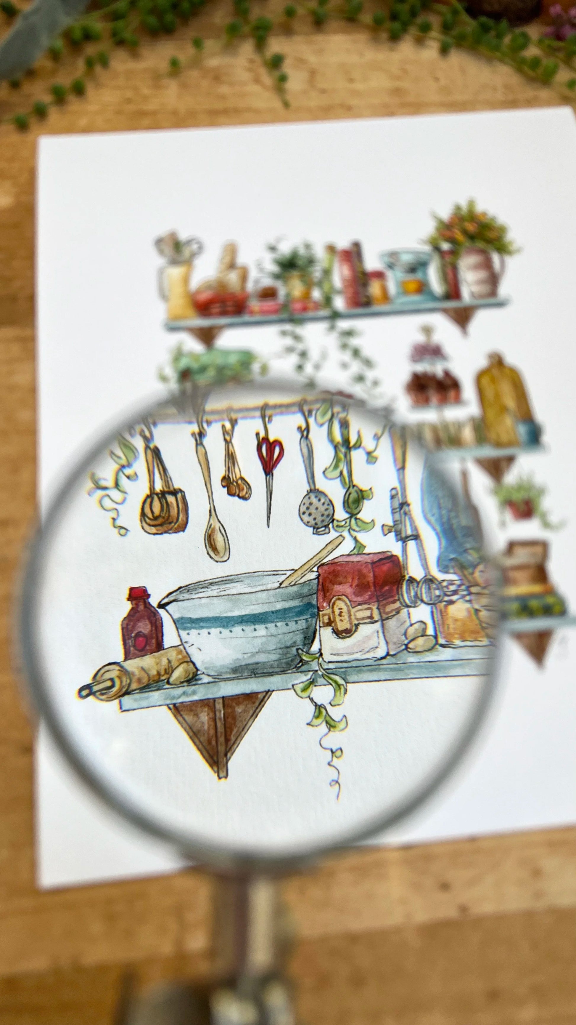 Giclée print featuring my original watercolor and ink illustration of the oddities, books, and tools tucked away in the shelves of a baker, including a well-loved recipe book, a mixing bowl, and a tower of tasty treats.