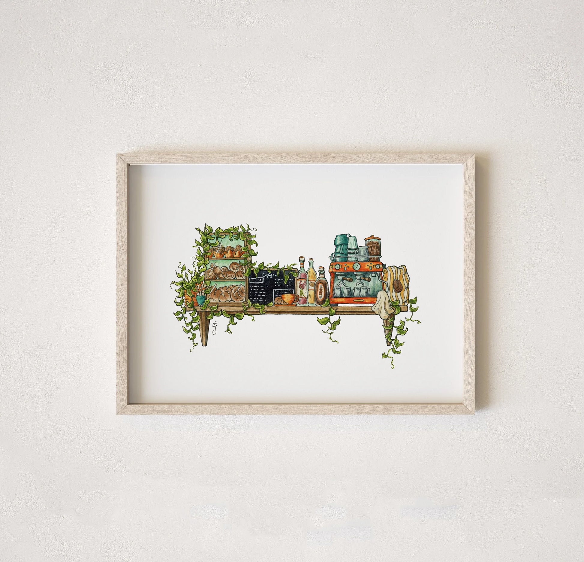 Giclée print featuring my original watercolor and ink illustration of the delicious baked goods, neatly stacked mugs, and shining espresso machine on the shelf of a barista.