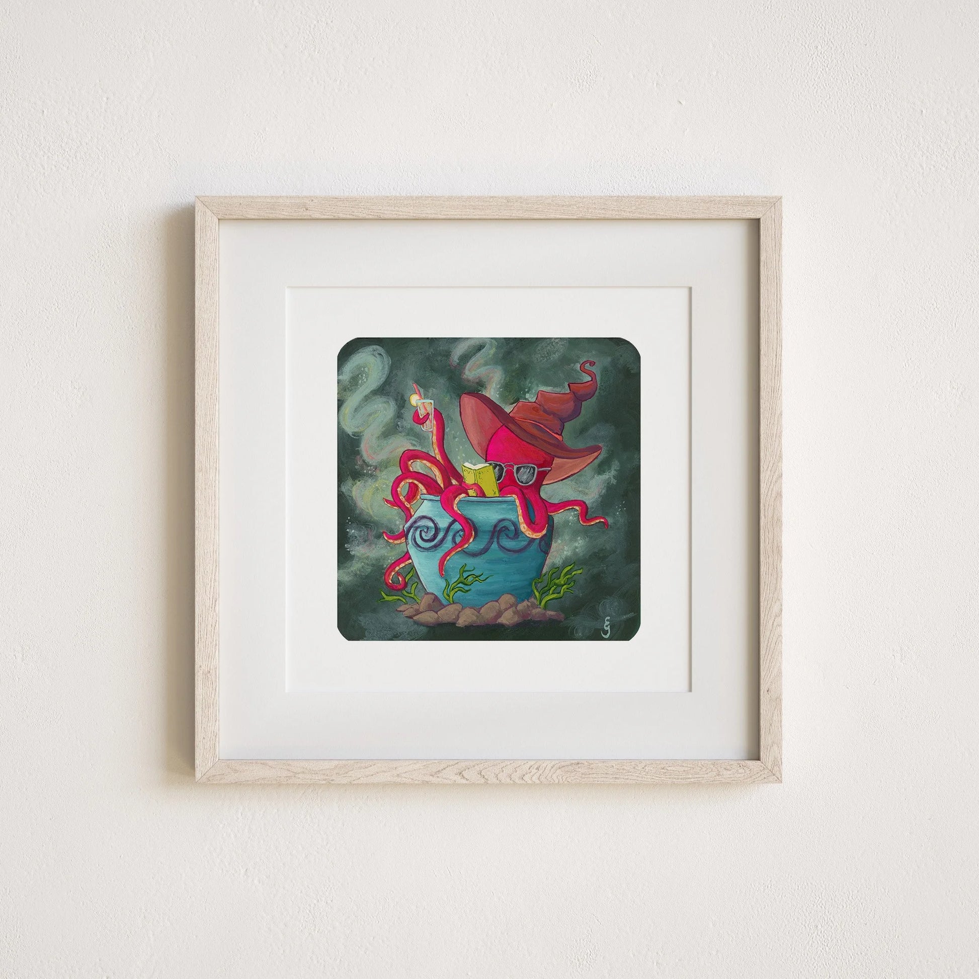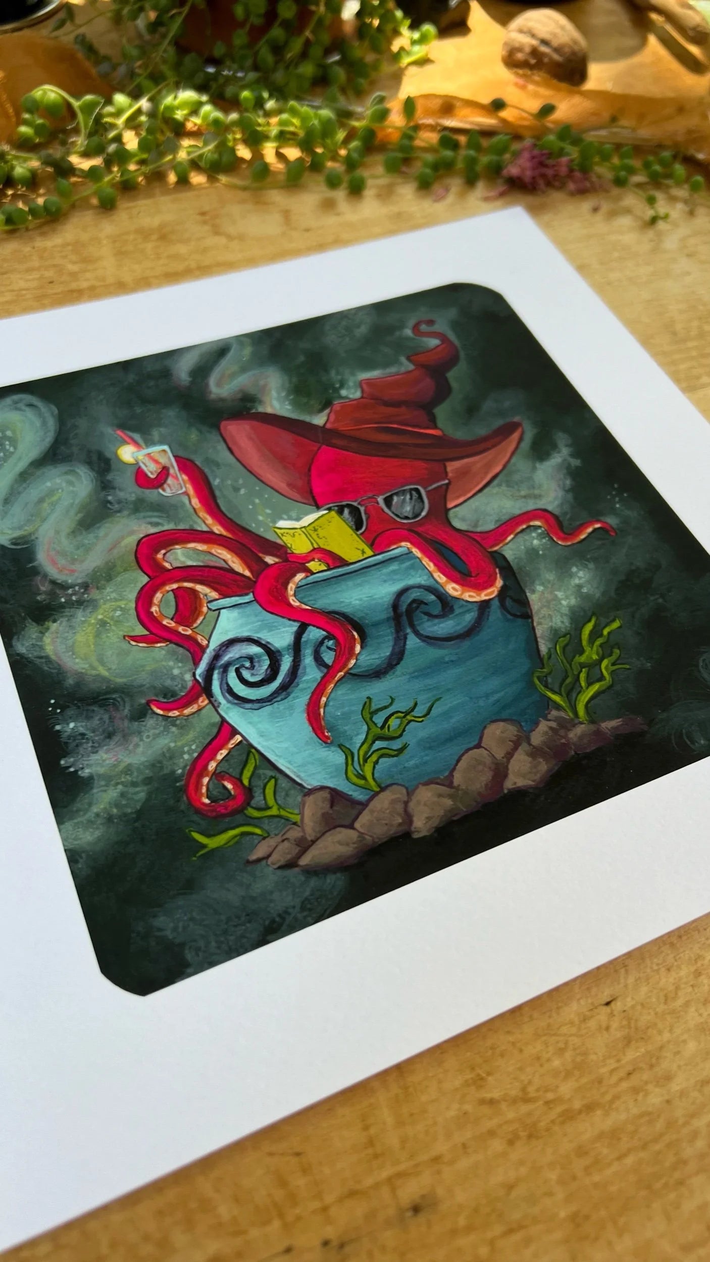 Giclée fine art print of my original, hand-painted acrylic gouache illustration of a bright red octopus in a witch hat, enjoying a book and a cup of iced tea in a cauldron, as one does when spending a day at the beach.