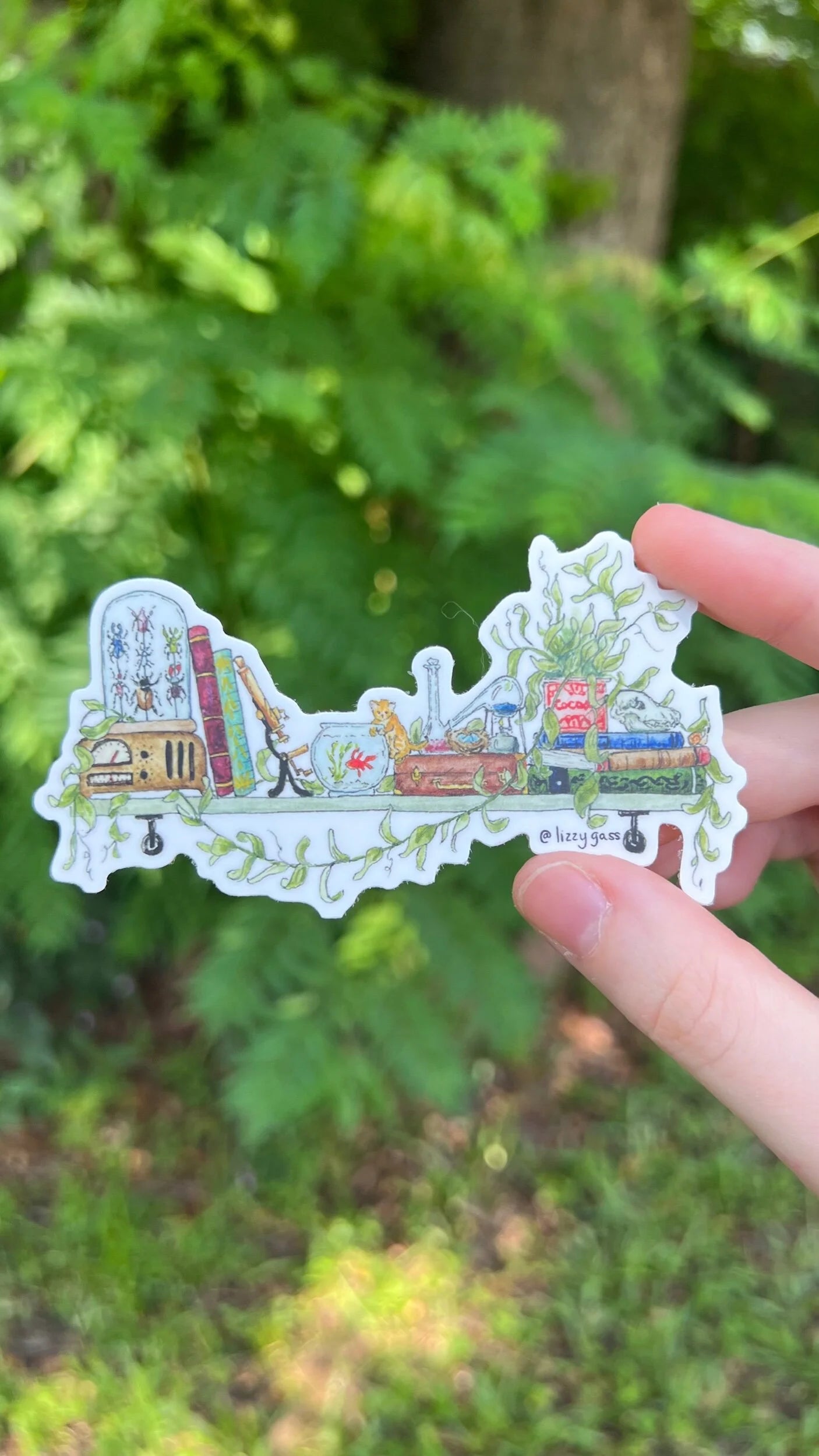 Matte vinyl sticker featuring my original watercolor and ink illustration of the oddities, books, and tools tucked away in the shelves of a vintage biologist, including a goldfish, an inquisitive kitten, and a vintage radio!