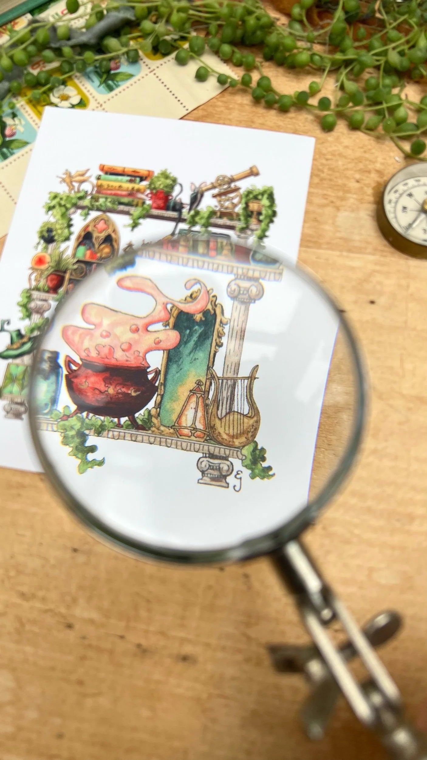 Postcard featuring my original watercolor and ink illustration of the oddities, tools, and mischievous creatures tucked away in the shelves of a celestial witch, including an inquisitive cat and a stargazing bat.