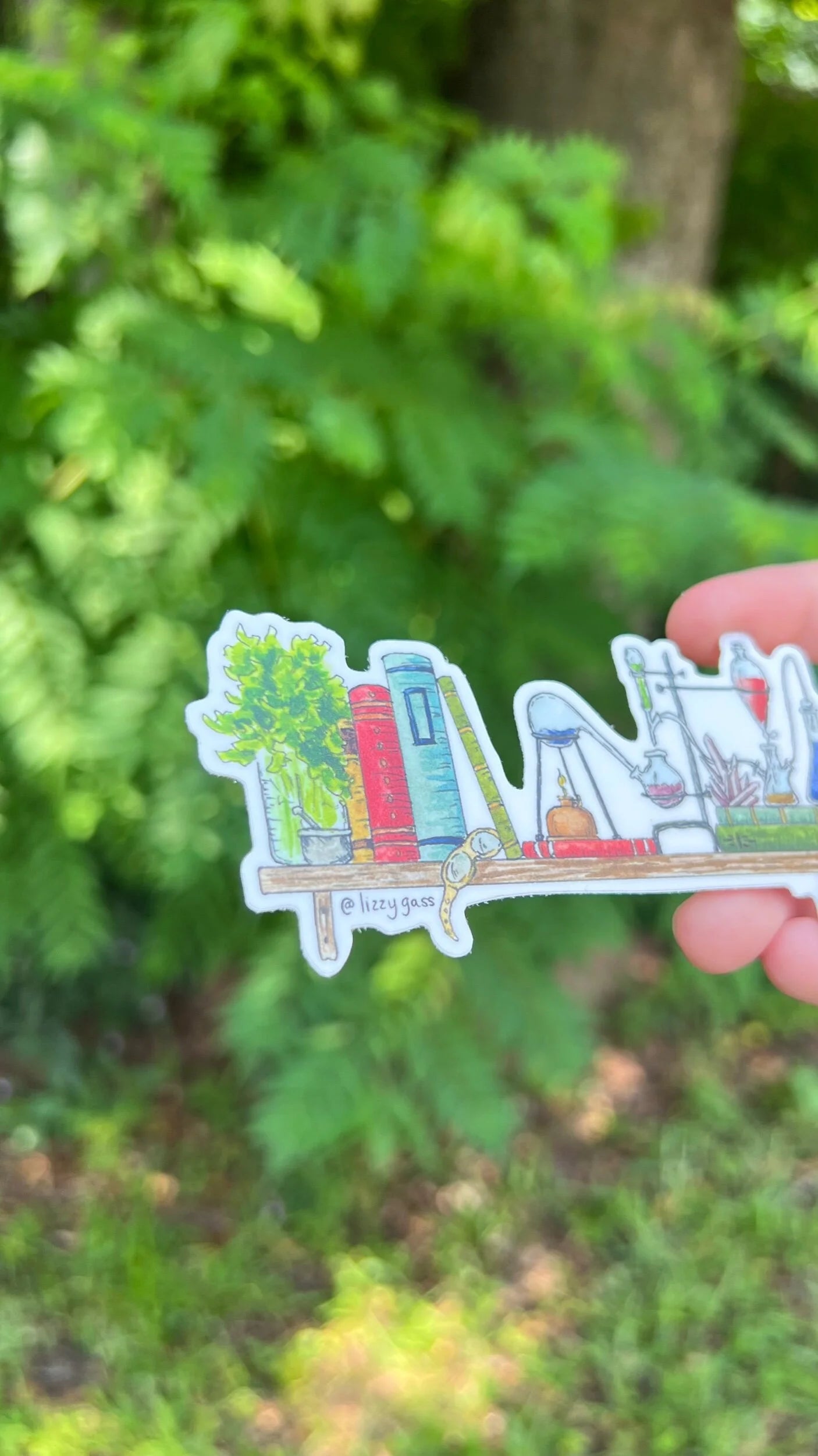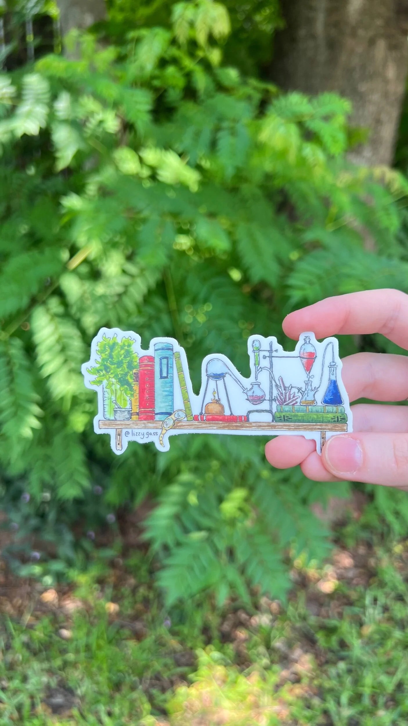 Matte vinyl sticker featuring my original watercolor and ink illustration of the oddities, books, and tools tucked away in the shelves of a vintage chemist.
