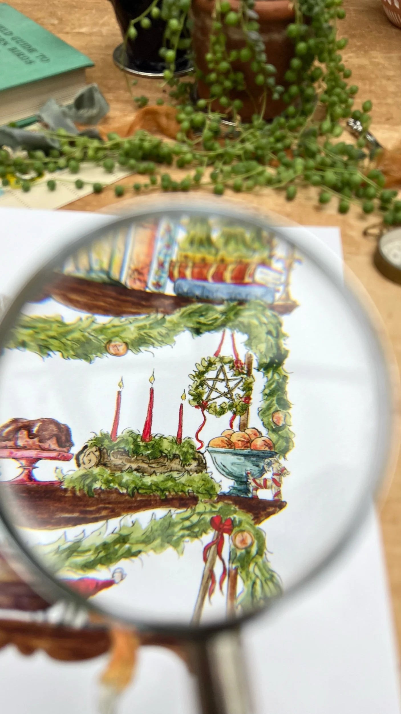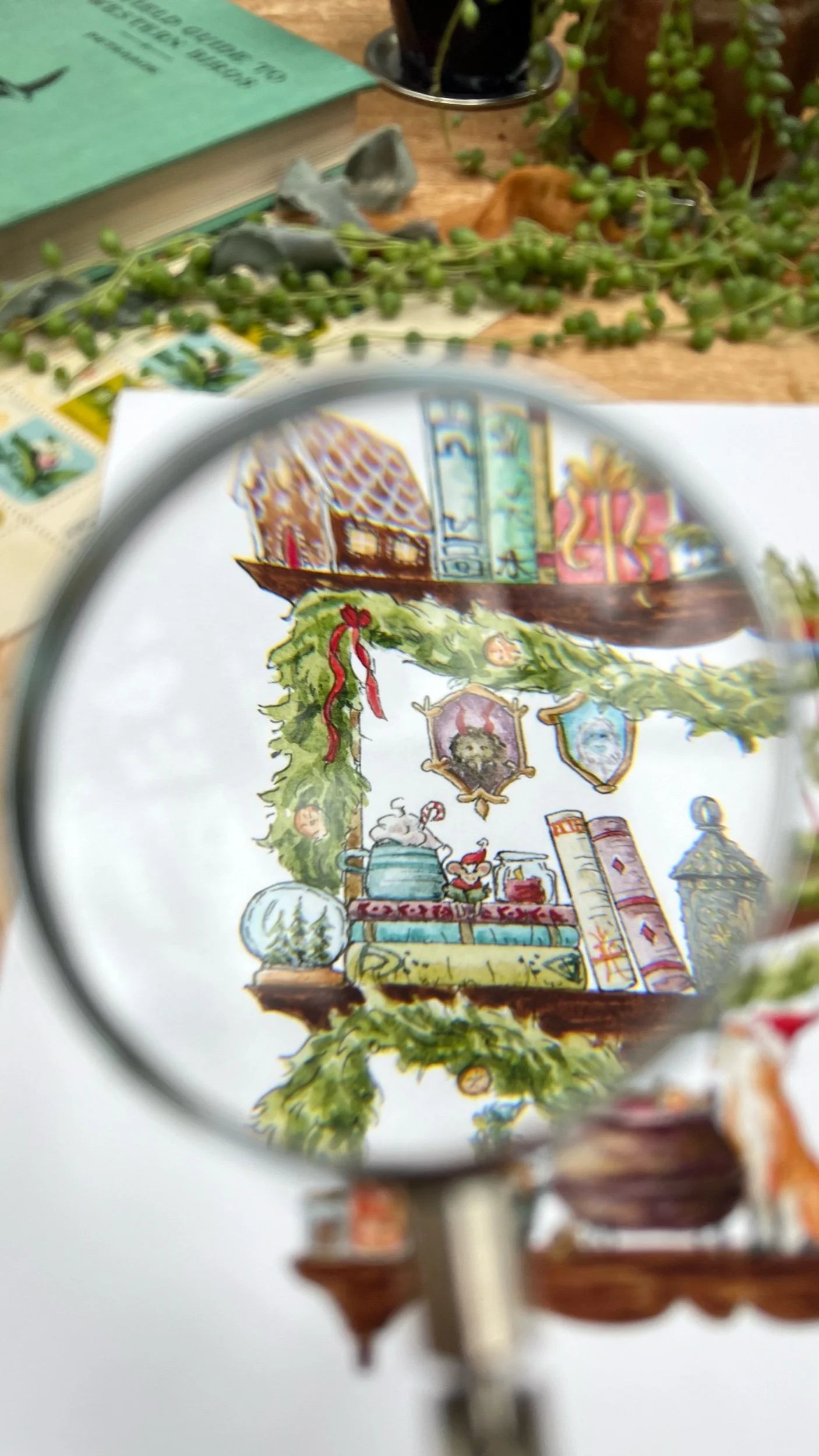 Giclée print featuring my original watercolor and ink illustration of the magical foxes and delightfully whimsical holiday items arranged on the shelves of a Christmas witch, including a tiny mouse reading a book, beautifully wrapped presents, and portraits of the witch's friends.