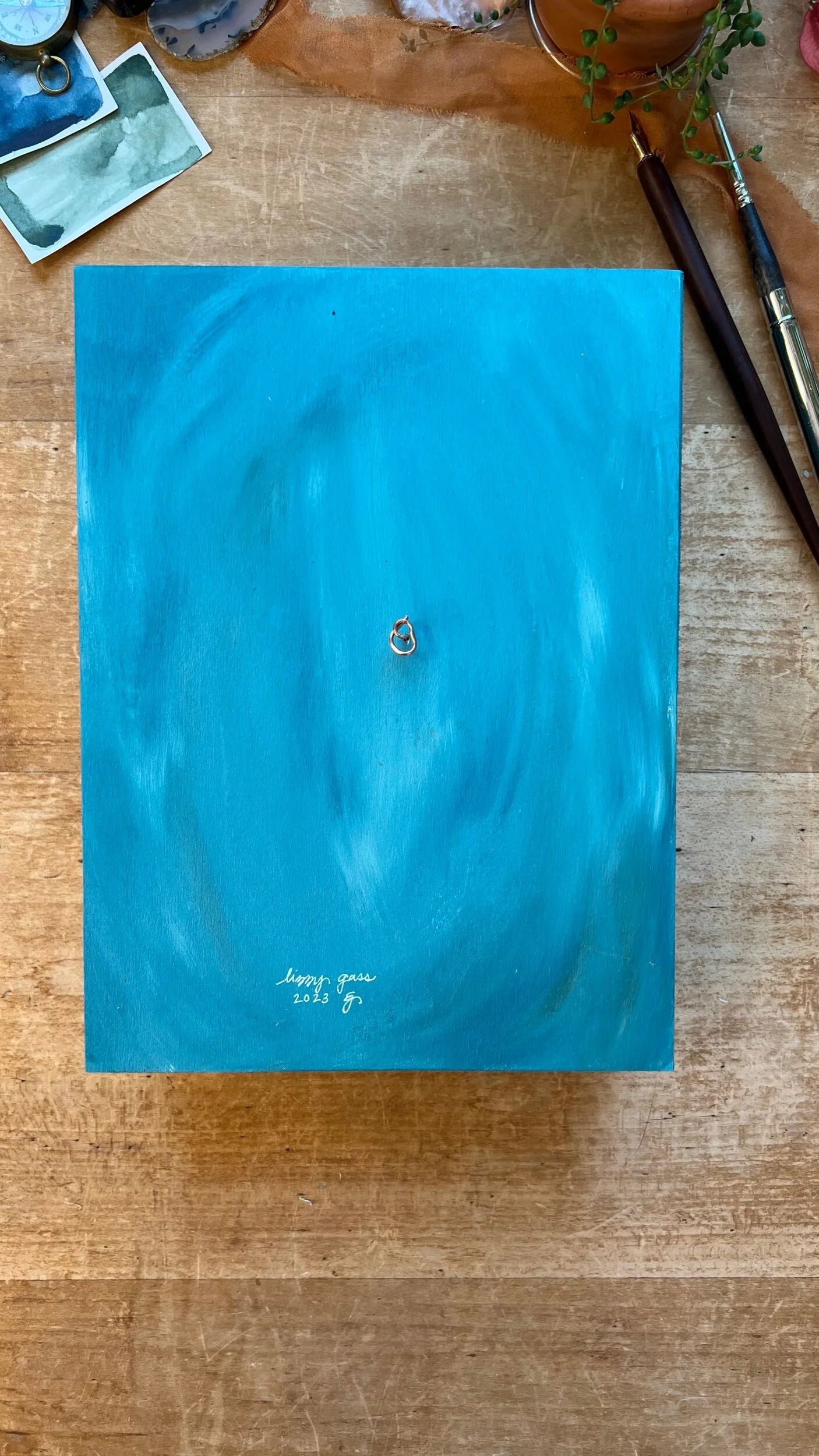 This whimsical dinosaur diorama was made from five layers of hand cut and painted watercolor paper, carefully assembled in a book-shaped wooden box. A small wire on the back of the box can be used to open and close the T-Rex’s mouth.