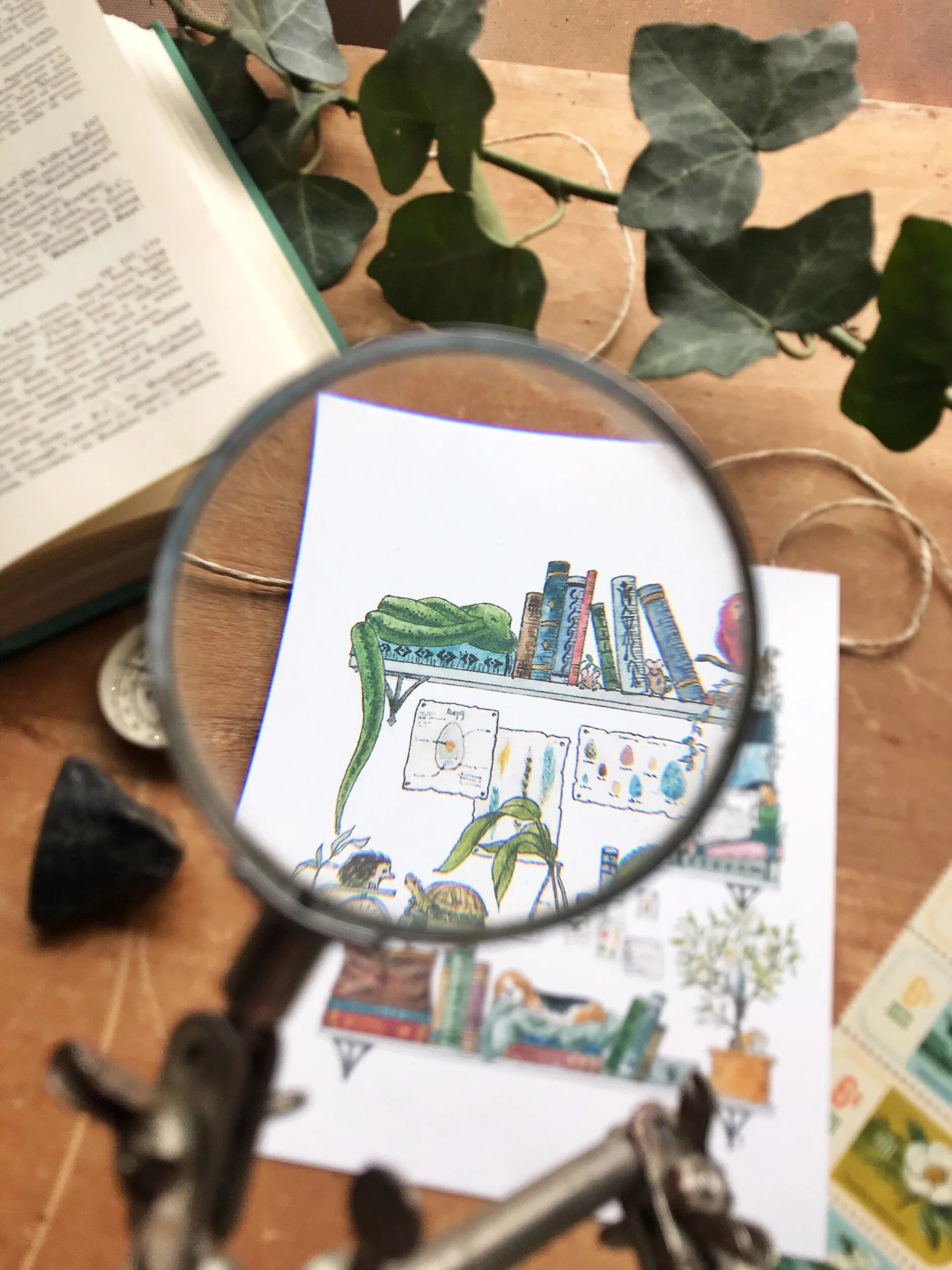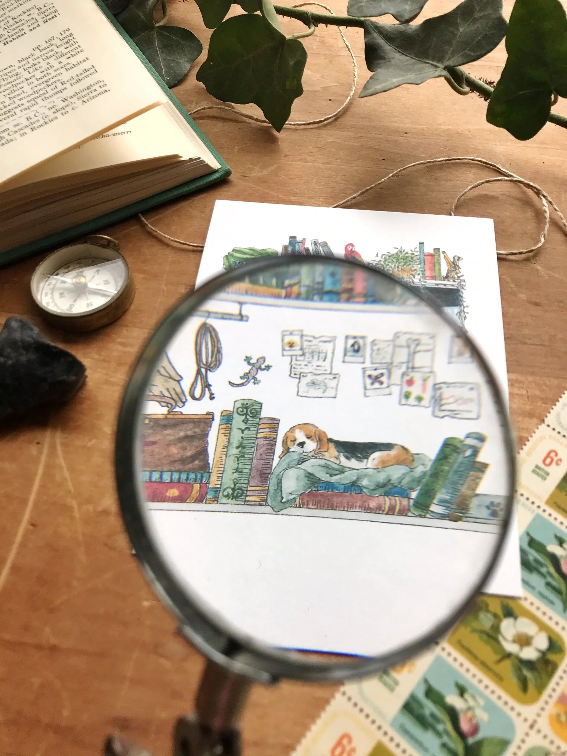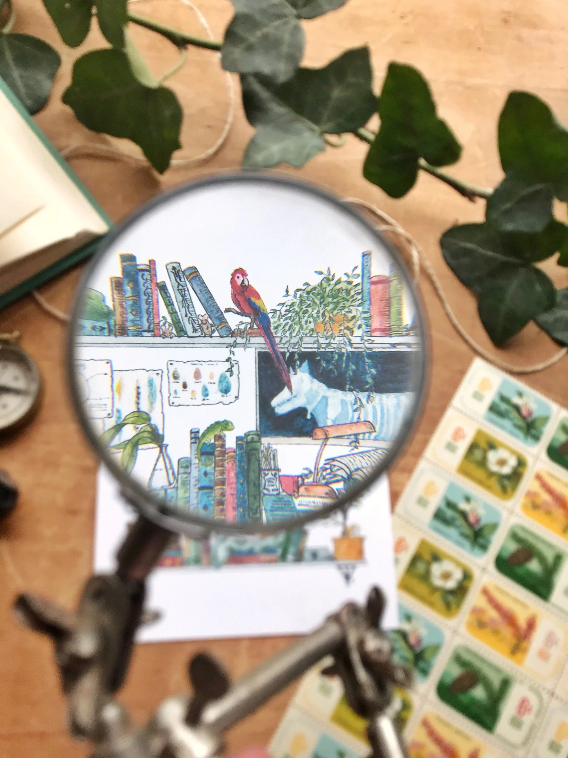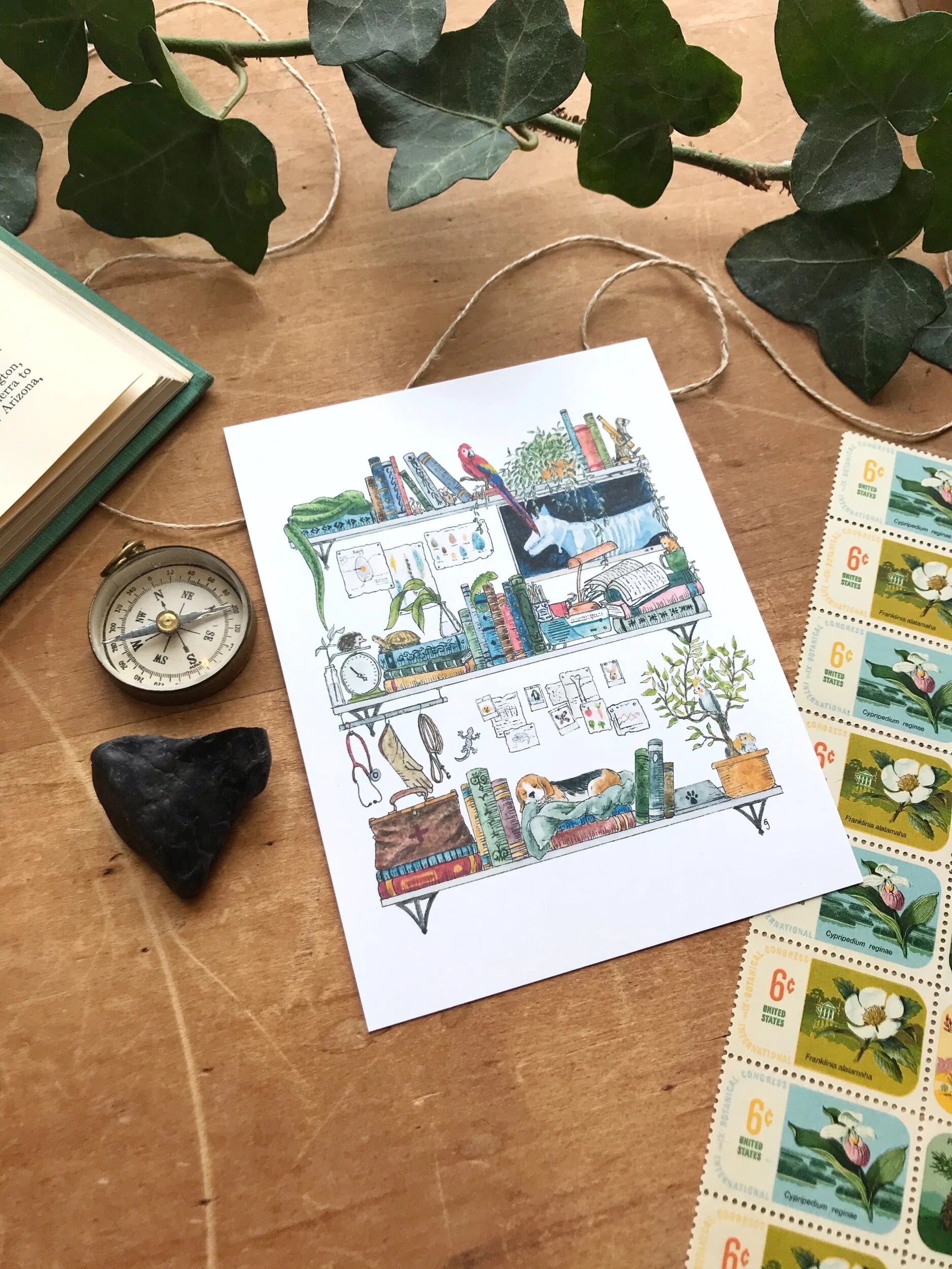 Postcard featuring my original watercolor and ink illustration of the vintage oddities and books tucked away in the shelves of a vet, including an opinionated parrot, a friendly turtle, and a napping beagle puppy.