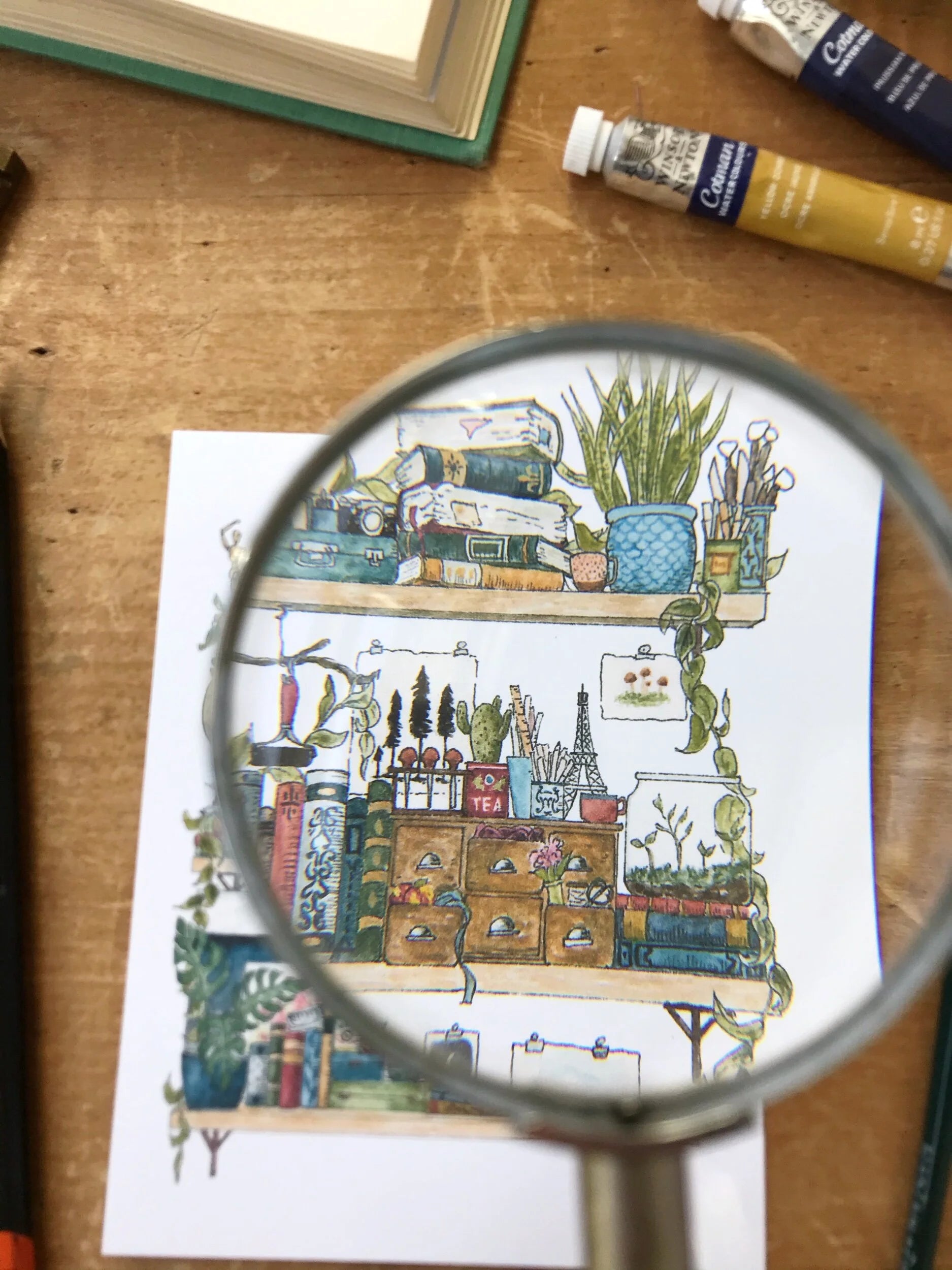Postcard featuring my original watercolor and ink illustration of the oddities and books tucked away in the shelves of an artist.
