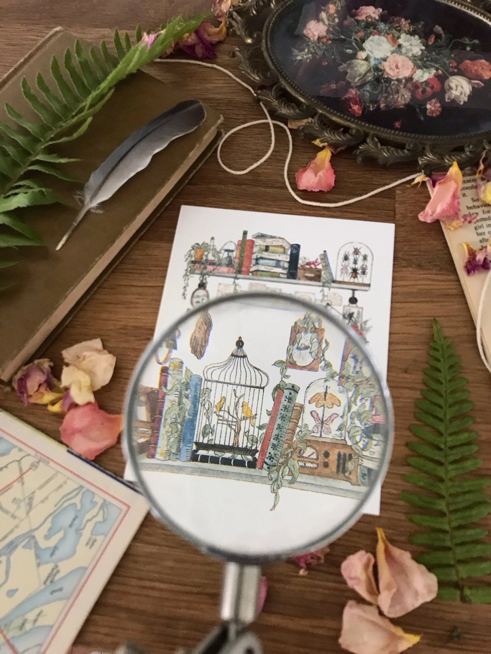 Postcard featuring my original watercolor and ink illustration of the vintage oddities and books tucked away in the shelves of a biologist. A goldfish, canaries, a vintage radio, and pictures of Sasquatch and Nessie are just a few of the details you'll find hidden in this painting!