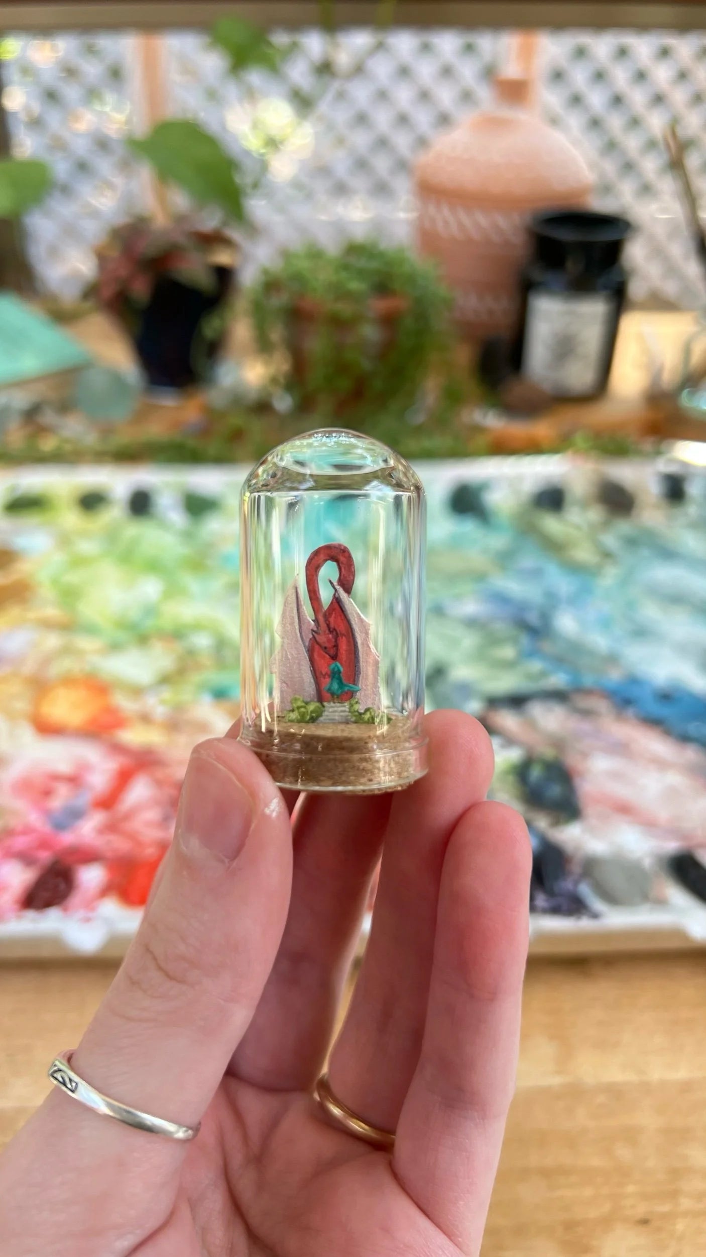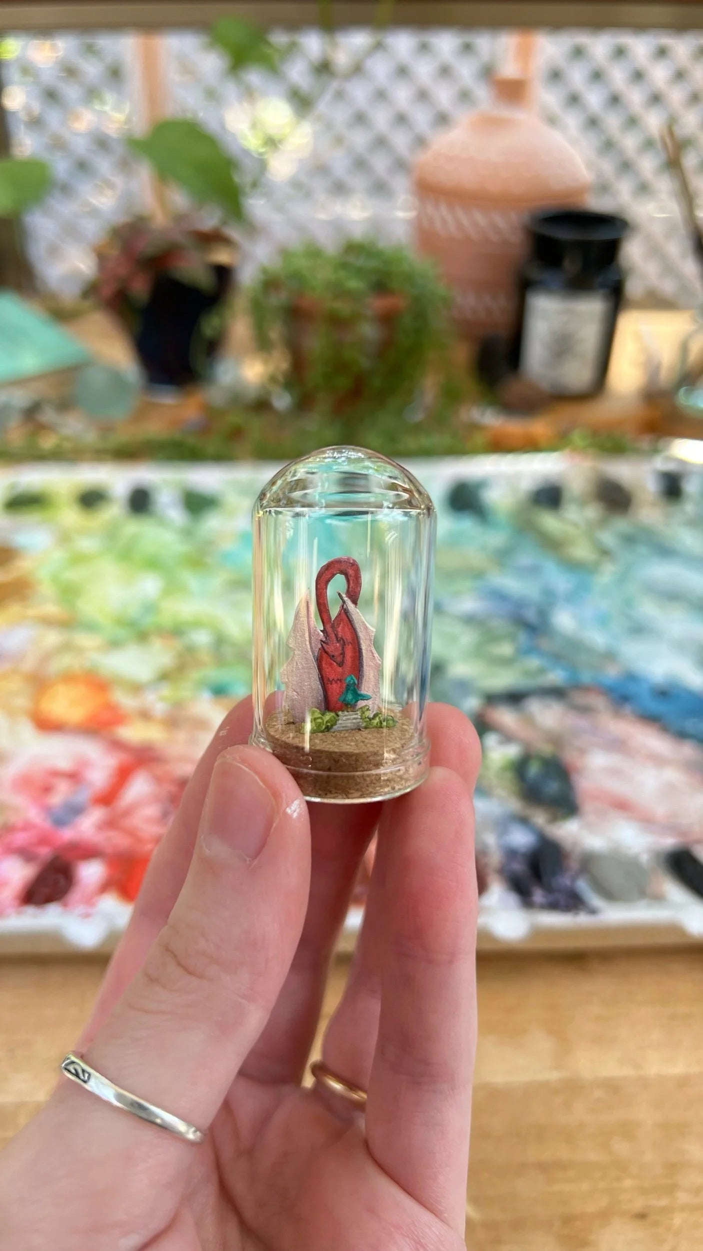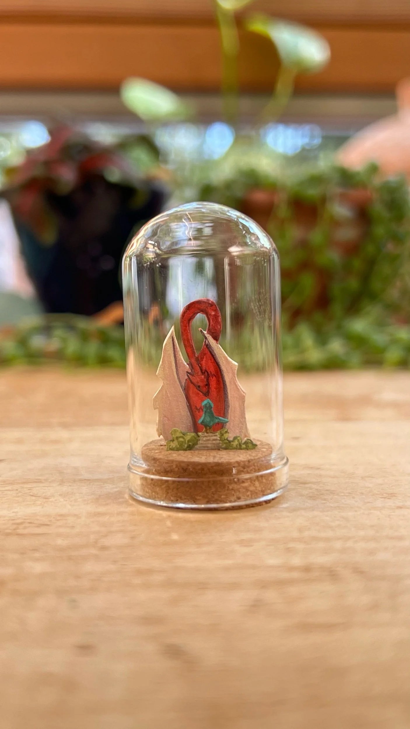 This tiny paper dragon and itty-bitty adventurer were both hand-cut and painted on watercolor paper, then carefully assembled in a small glass dome, which is perfect size to decorate a desk or bookshelf. The dragon is painted with a layer of shimmery gouache paint, so its scales and wings will sparkle gently in the light.