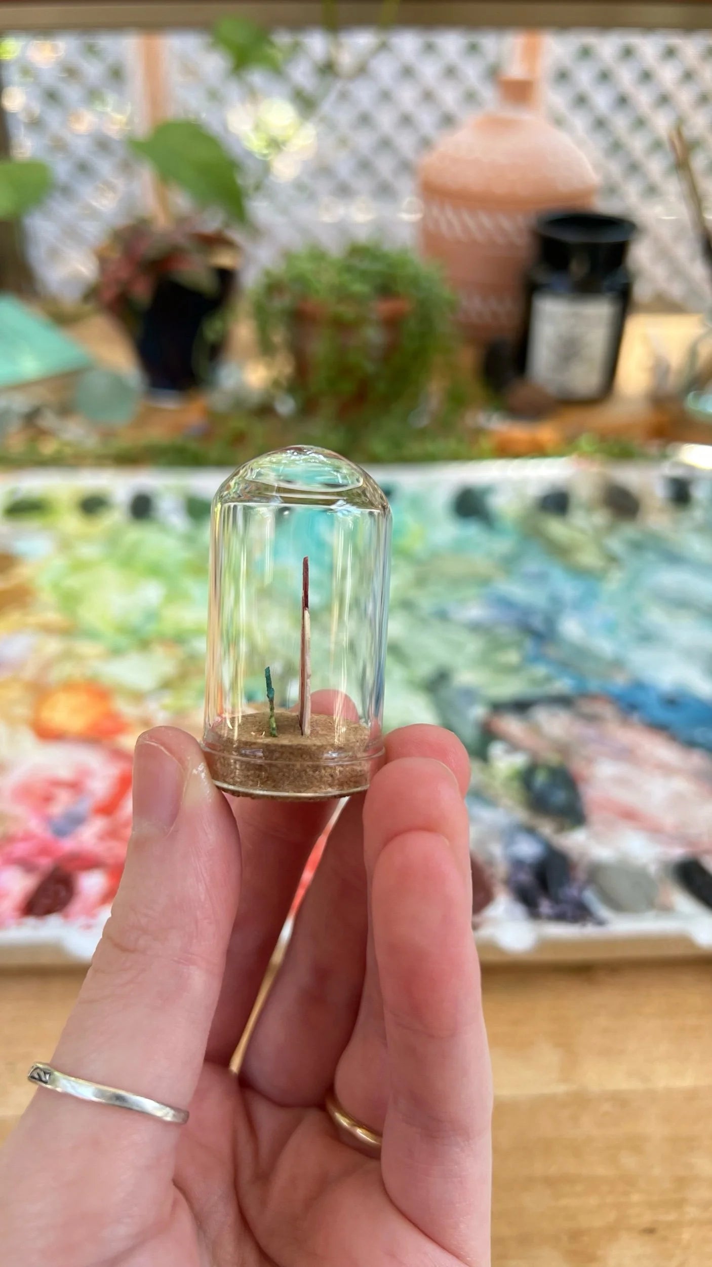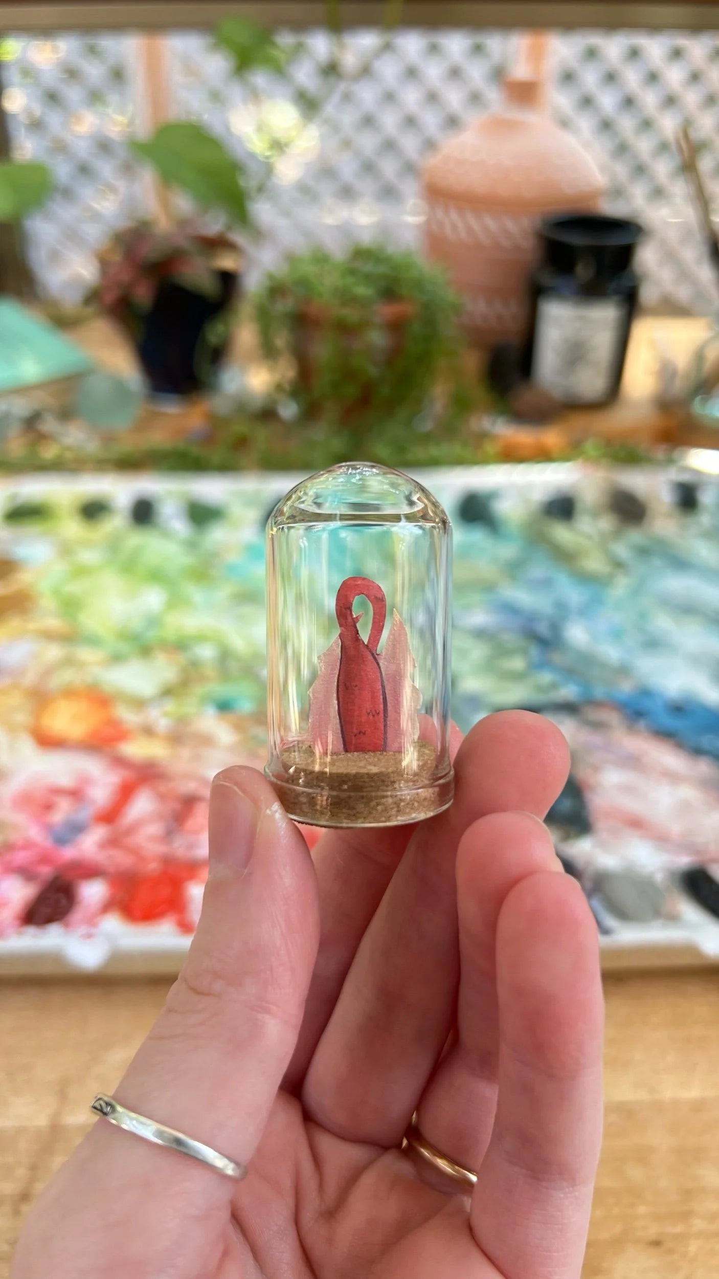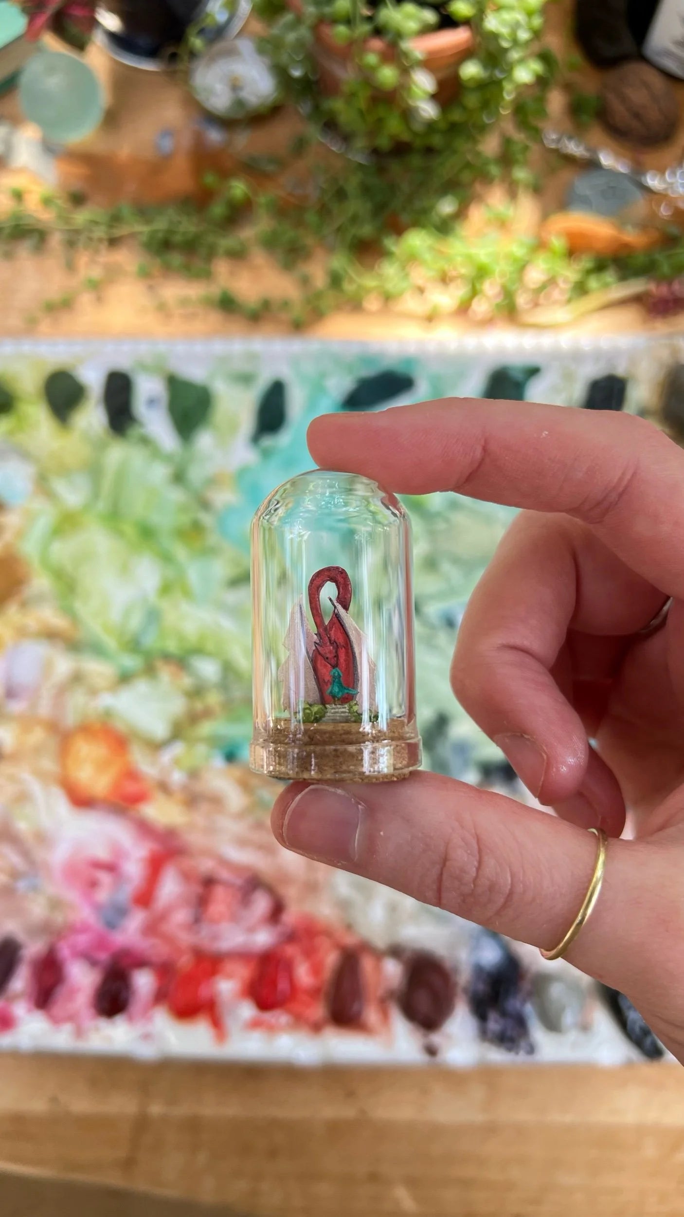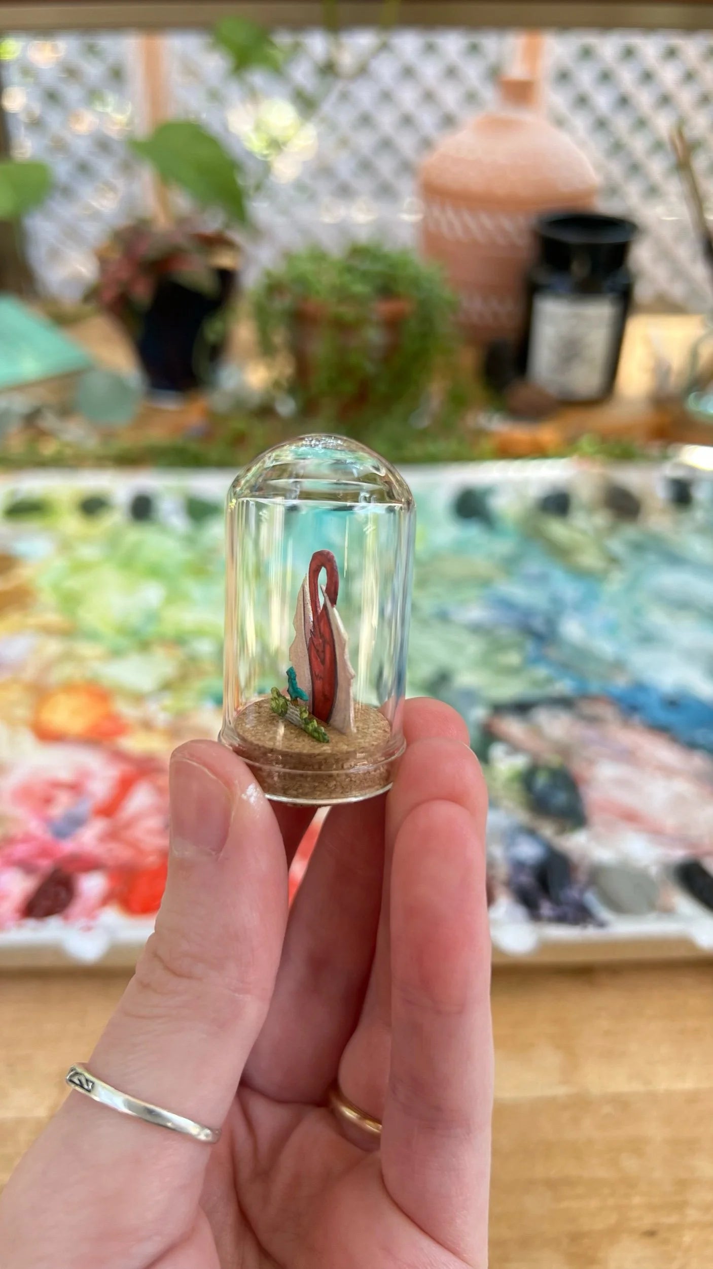 This tiny paper dragon and itty-bitty adventurer were both hand-cut and painted on watercolor paper, then carefully assembled in a small glass dome, which is perfect size to decorate a desk or bookshelf. The dragon is painted with a layer of shimmery gouache paint, so its scales and wings will sparkle gently in the light.