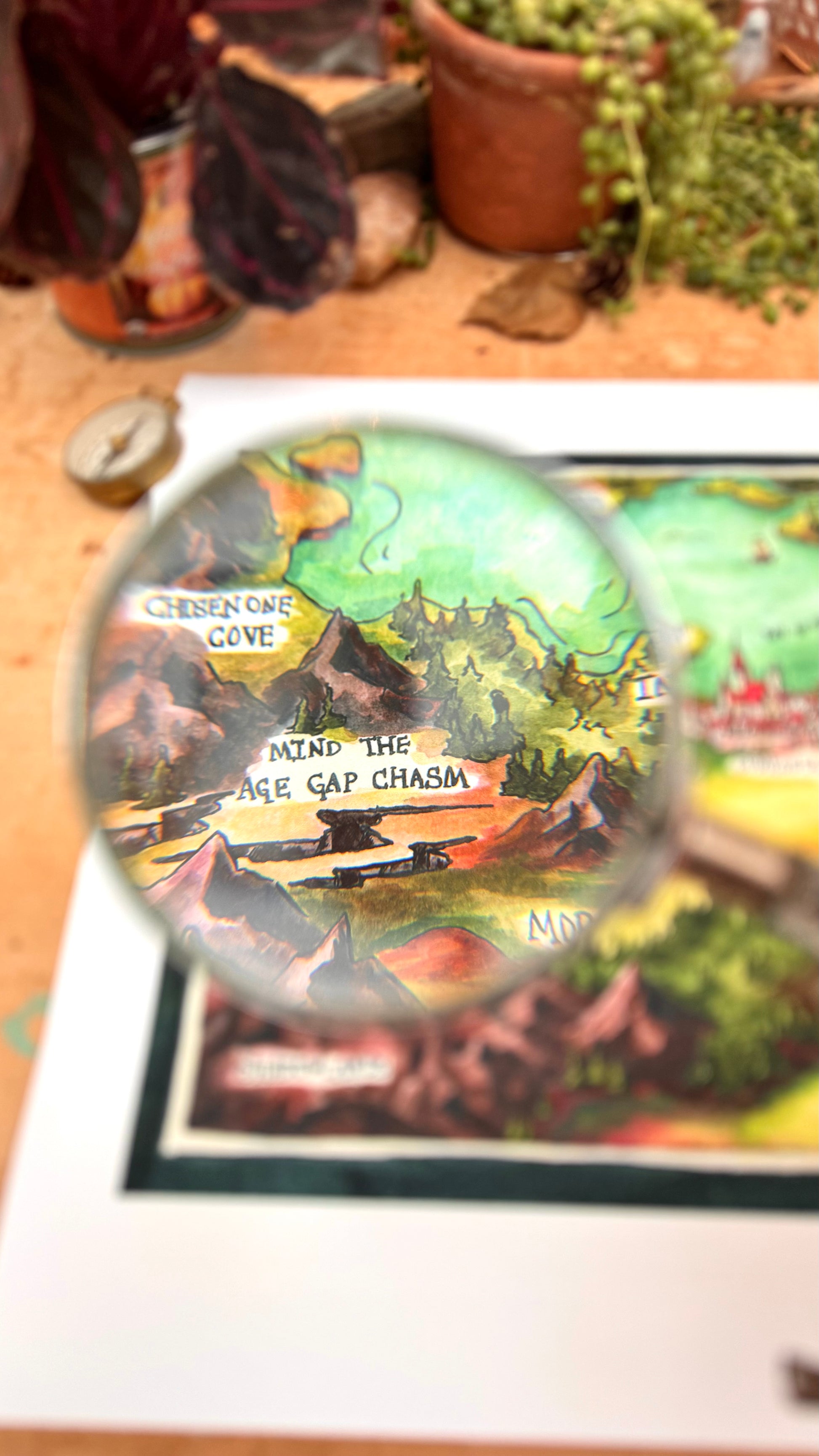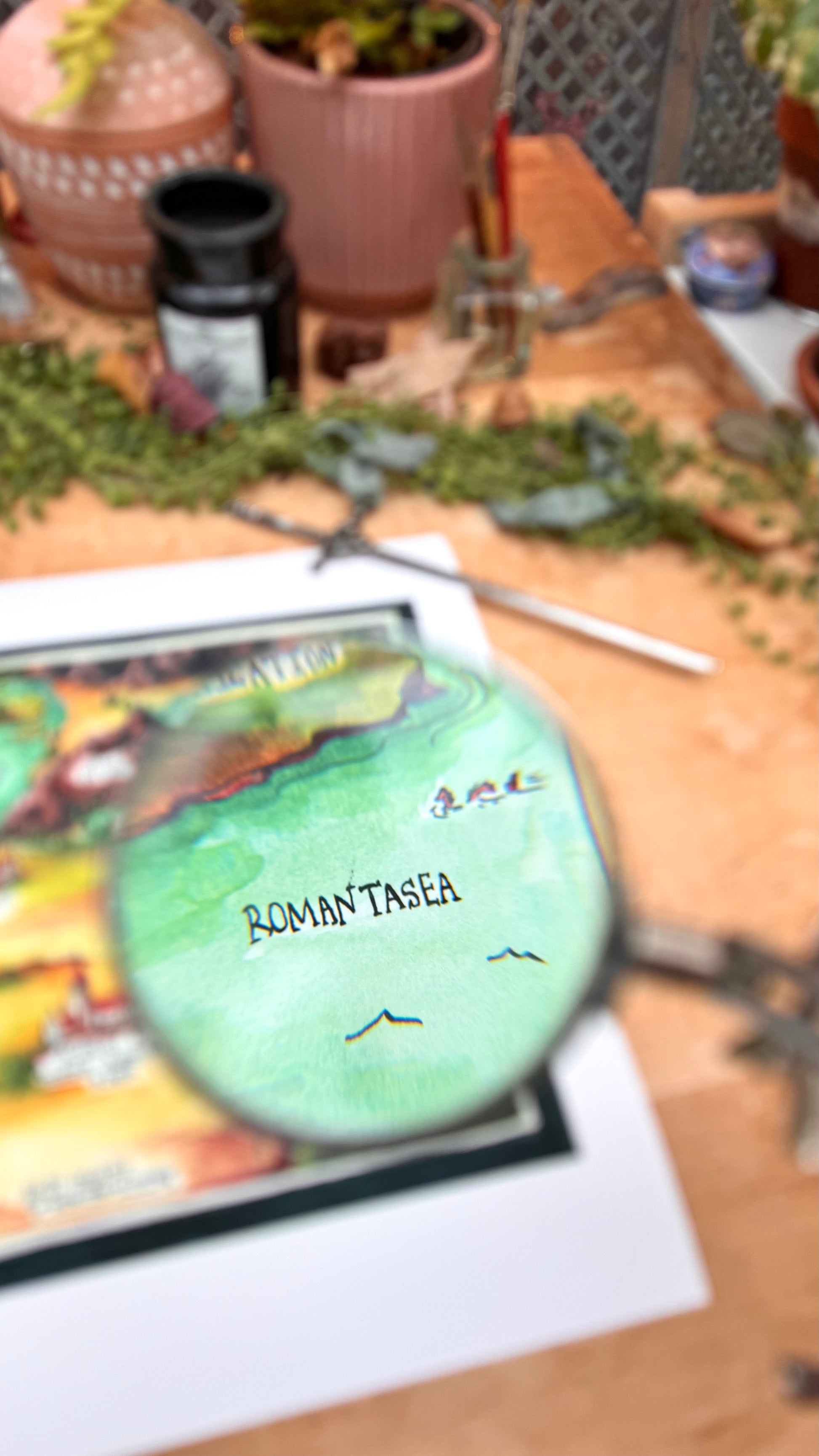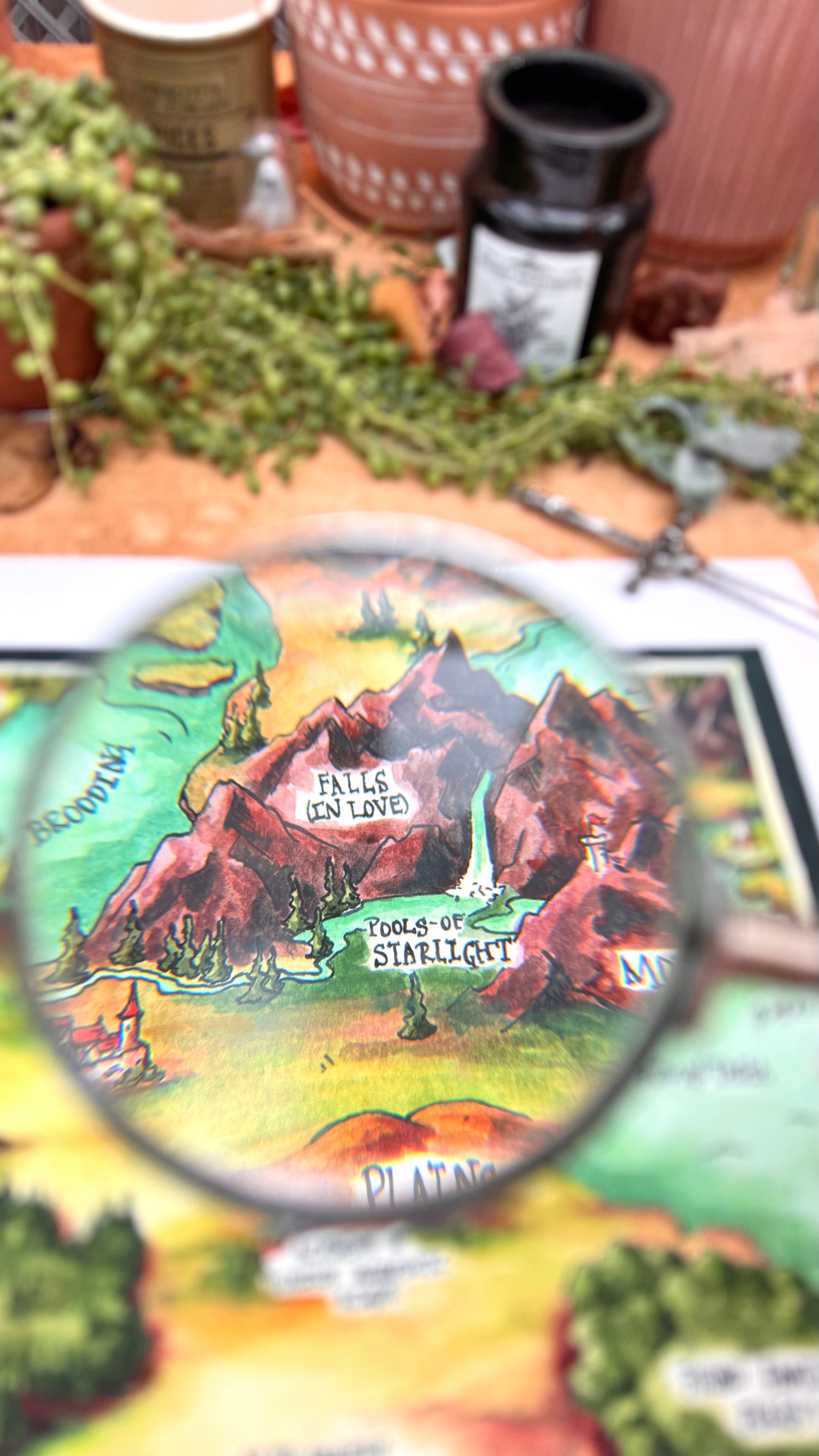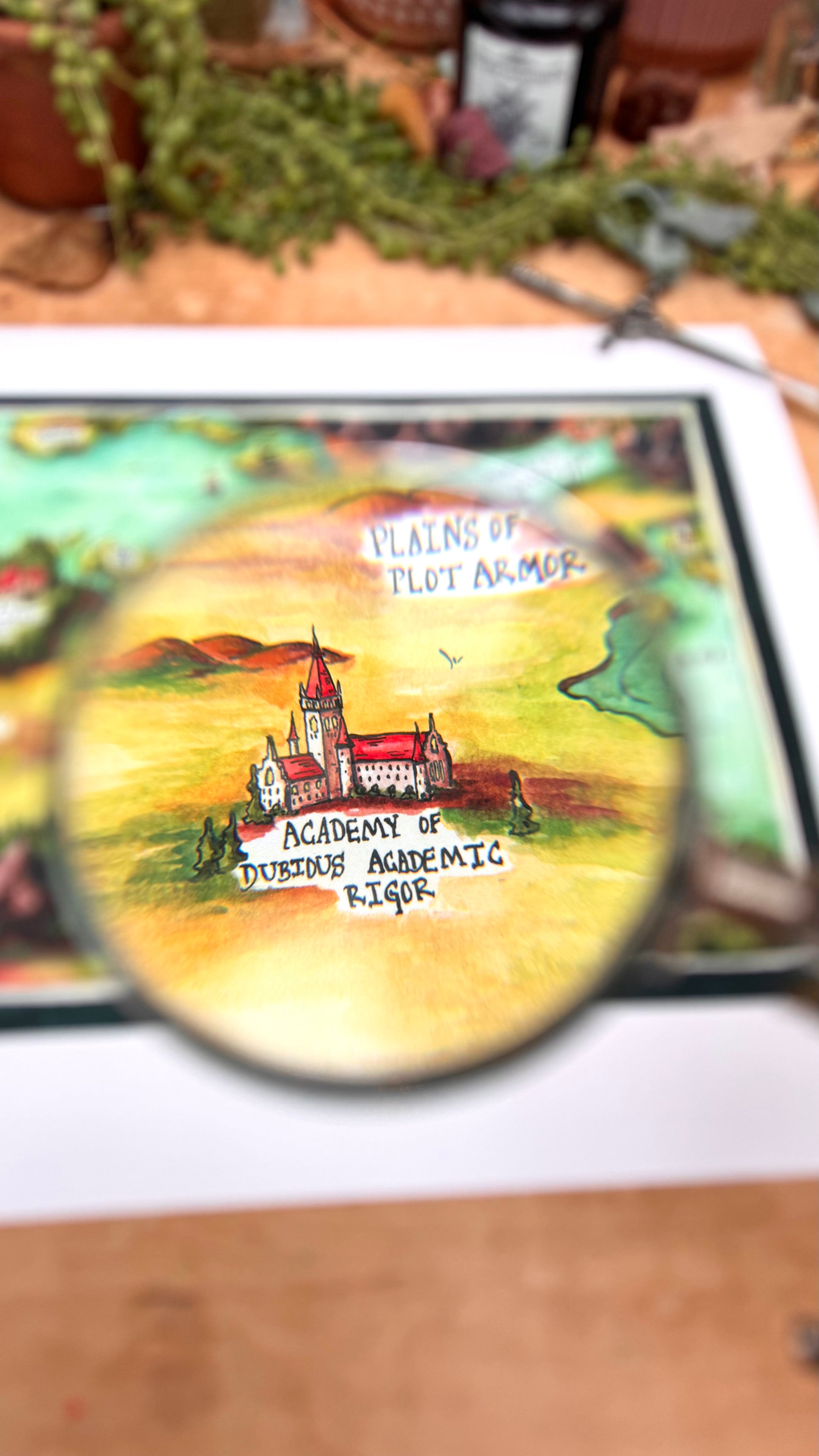 Giclée print featuring my original watercolor and ink illustration of a Dubious Map of Romantasy, the perfect companion to help you navigate all your favorite romantasy novels. As you explore the map, you'll find quintessential locations such as the Academy of Dubious Academic Rigor, the Mountains of Miscommunication, and my favorite pun, the Romantasea.