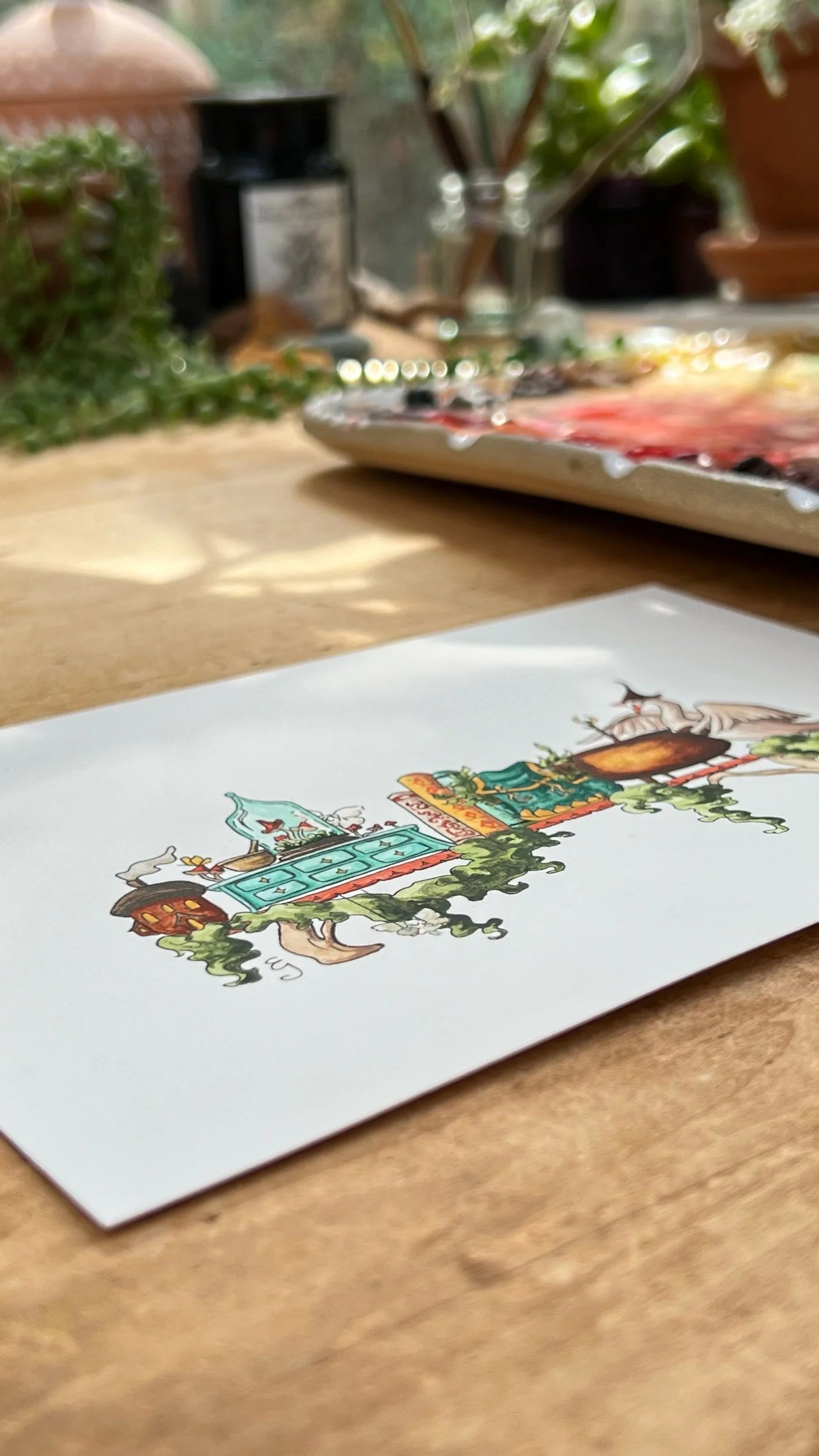 Original watercolor and ink illustration of the various magical creatures, tiny fairies, and enchanted items nestled on the shelf of a fairy witch.