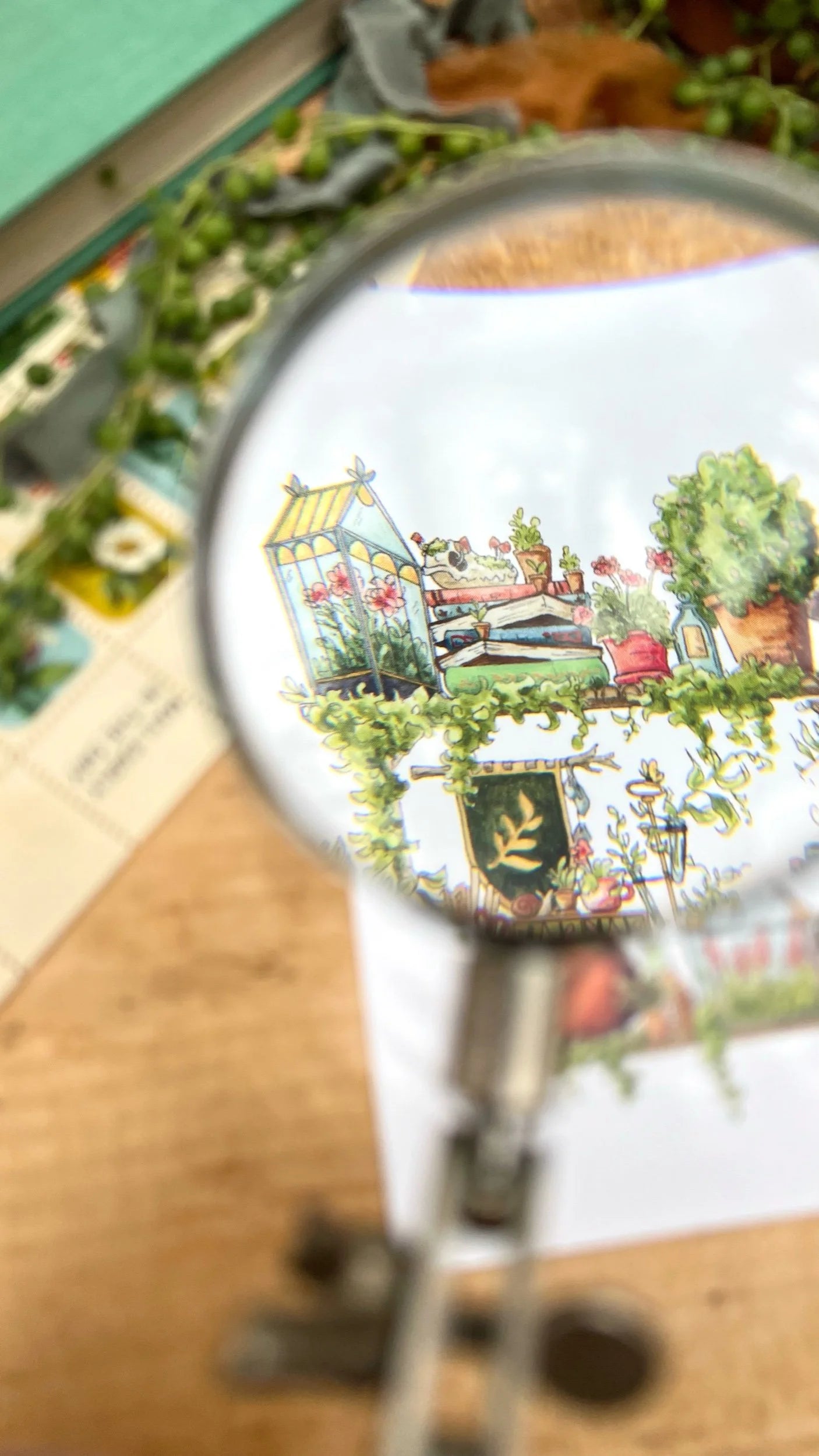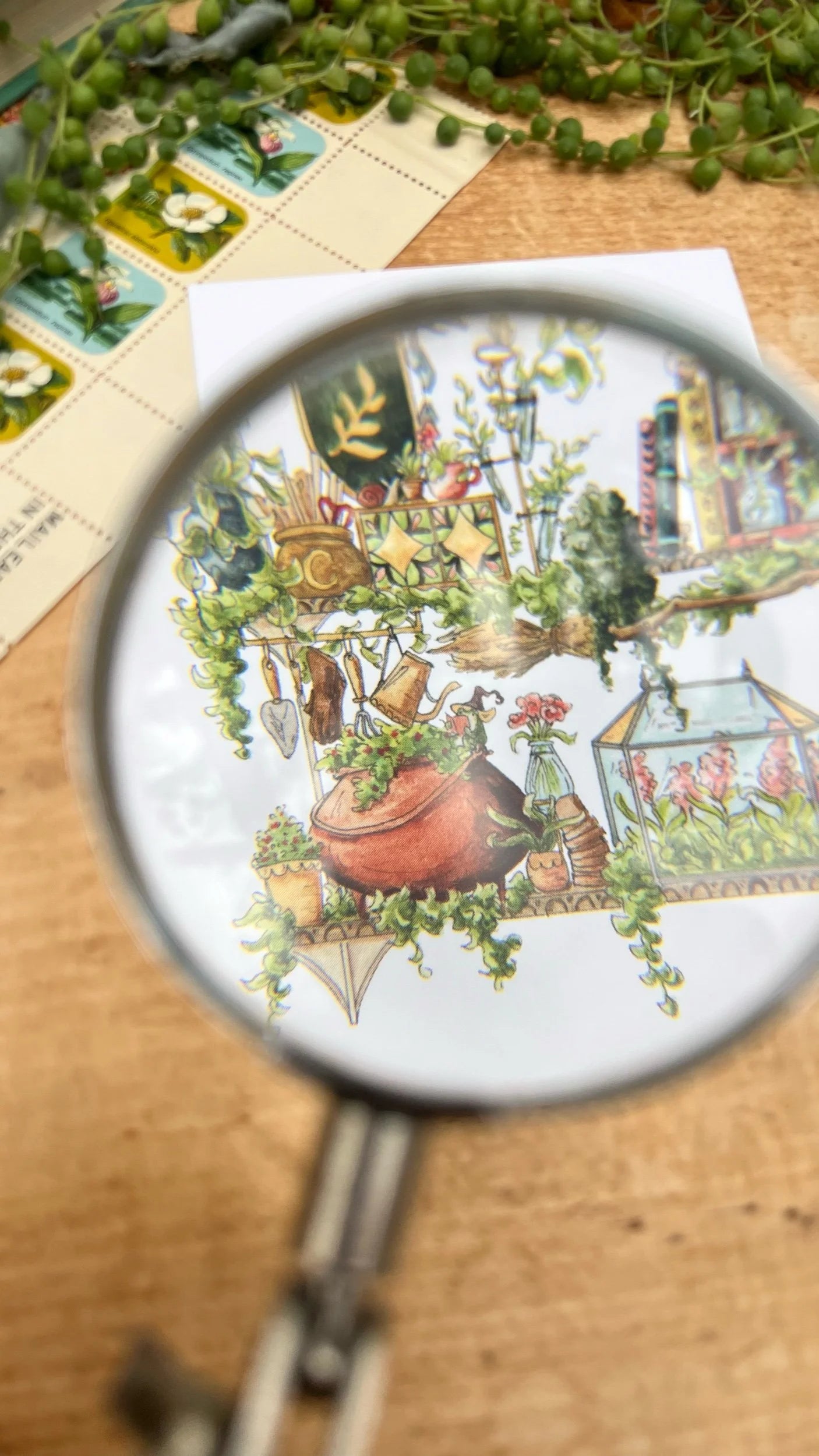 Postcard featuring my original watercolor and ink illustration of the various plants, creatures, and beautiful books nestled on the shelf of a garden witch, including a tiny frog and hedgehog enjoying some itty bitty books, stained glass greenhouses, and endless climbing vines.