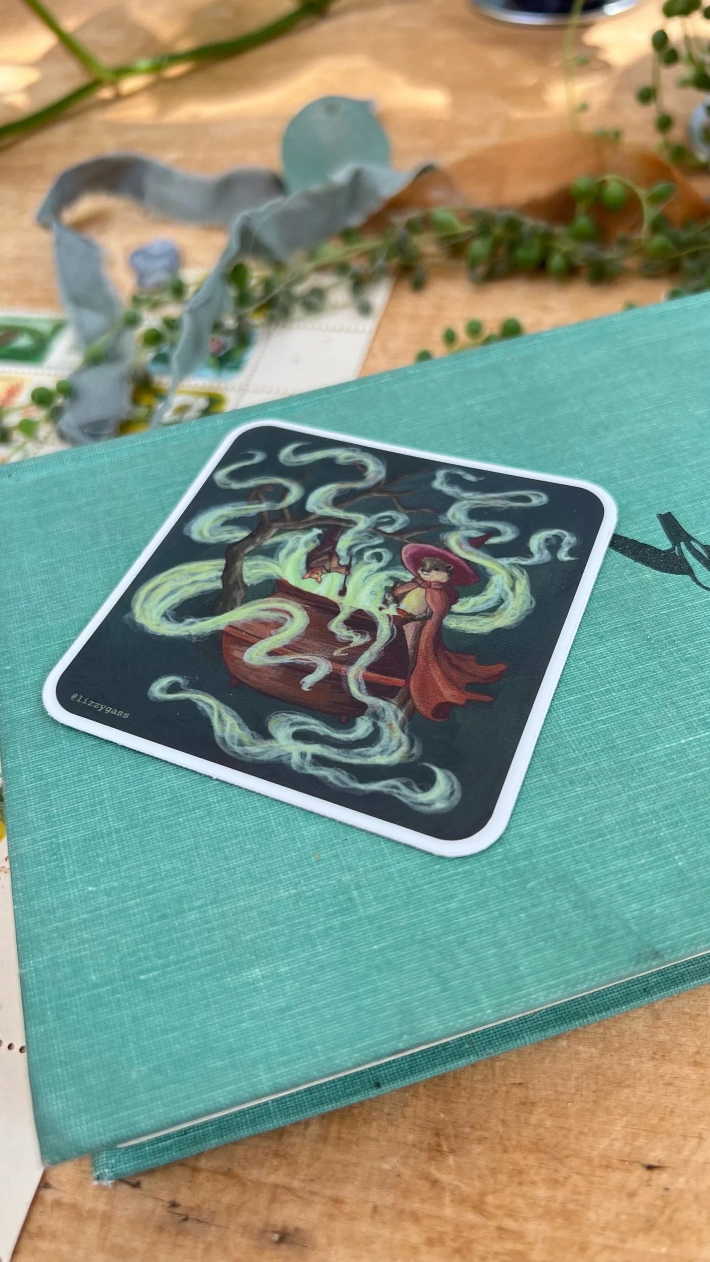 Matte vinyl sticker featuring my original, hand-painted acrylic gouache illustration of a mischievous otter and their bat companion, brewing up a glowing, magical potion.