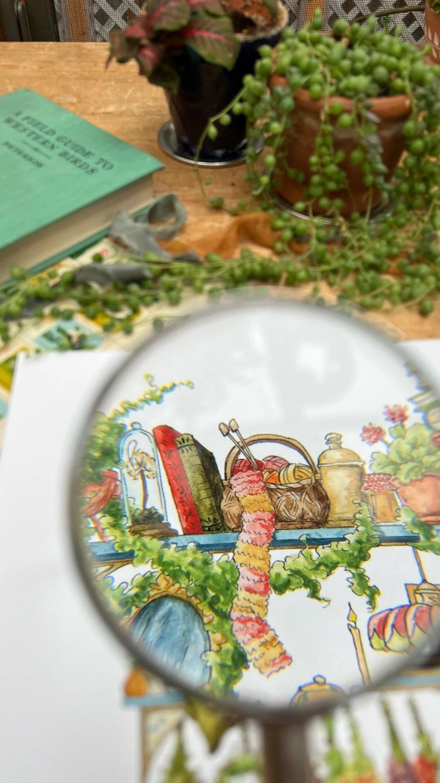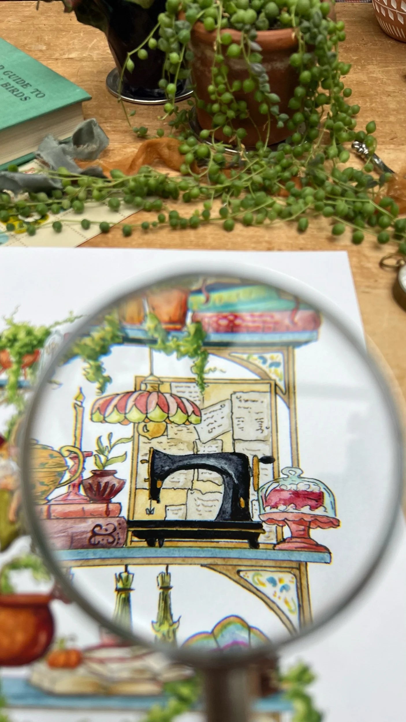 Giclée print featuring my original watercolor and ink illustration of the various magical creatures and enchanting items found on the shelves of a hedge witch, including a talkative corgi, napping cat, and gramophone that plays any song you can think of.