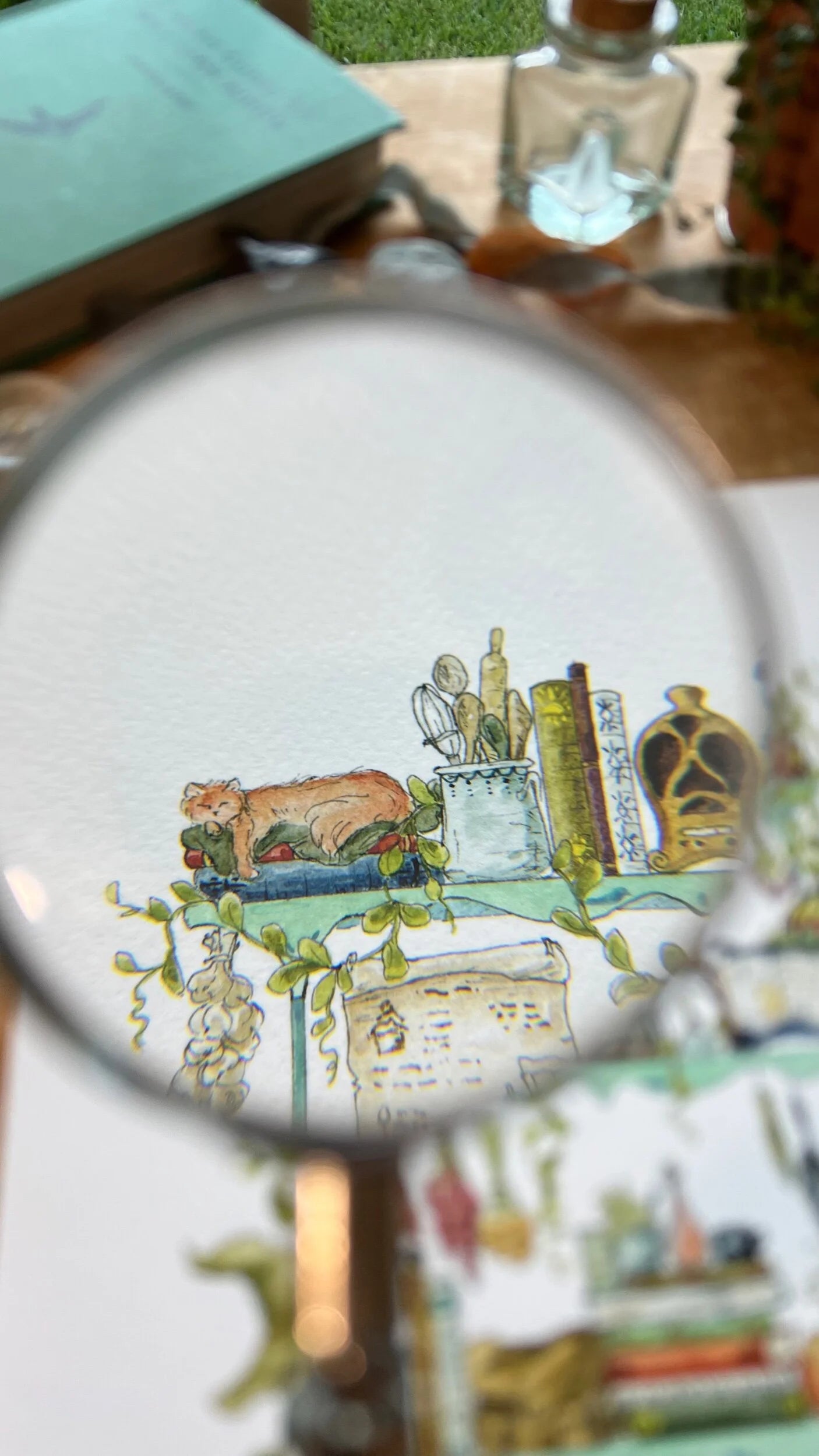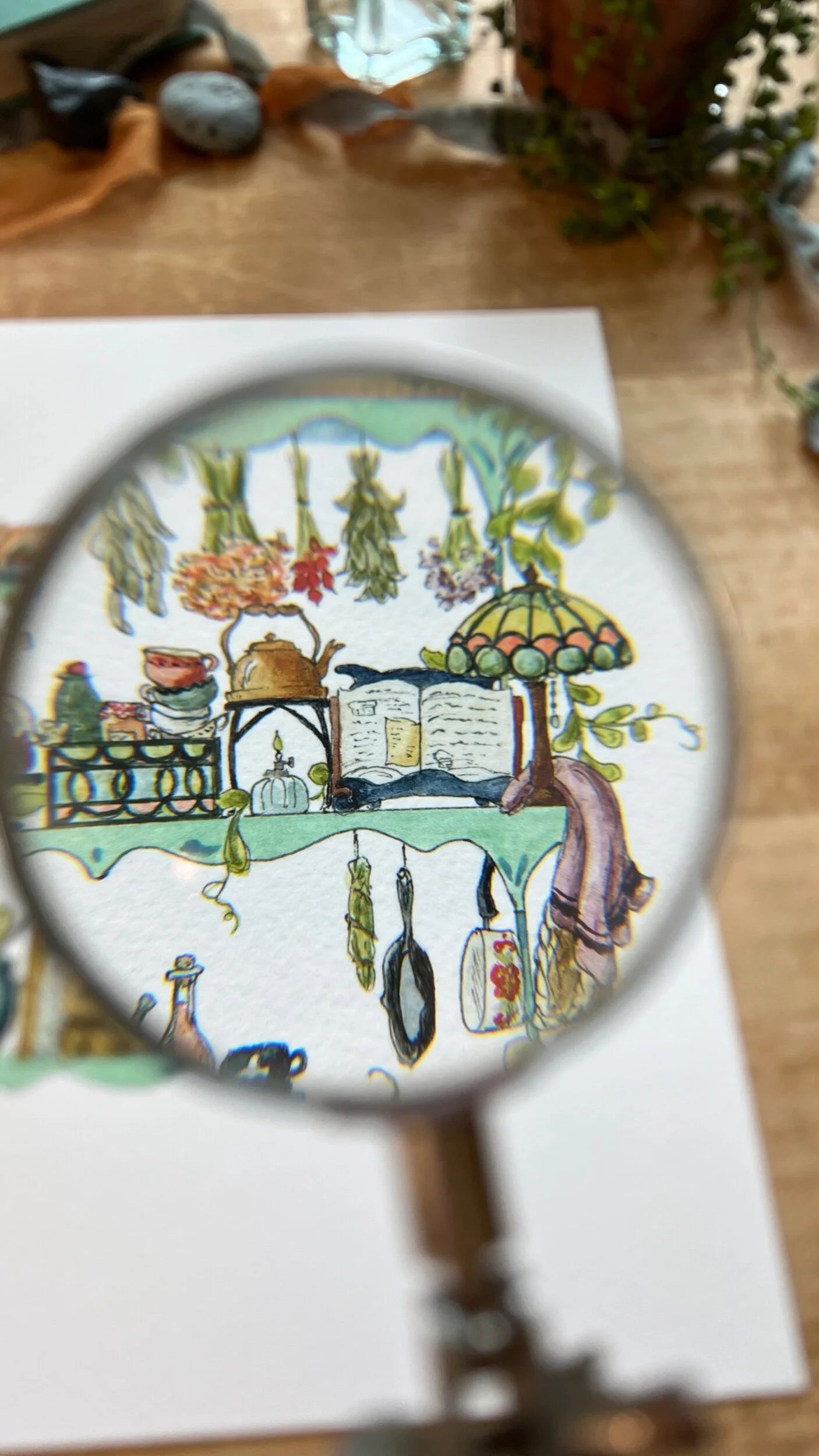 Giclée print featuring my original watercolor and ink illustration of the oddities, books, and baked goods tucked away in the shelves of a kitchen witch, including a sweet cat and a stained glass lamp.