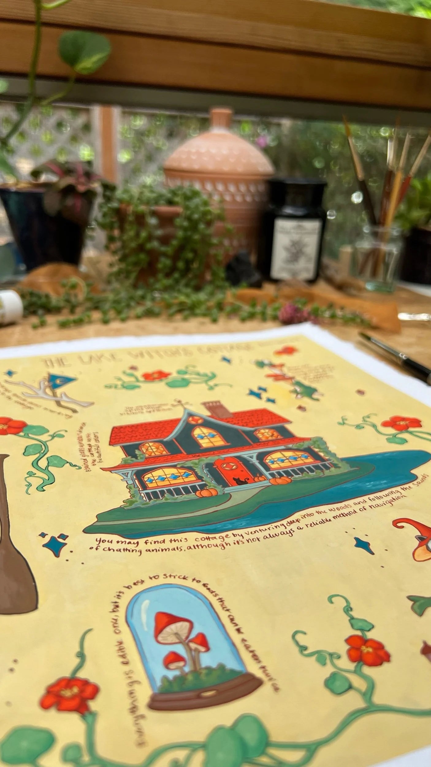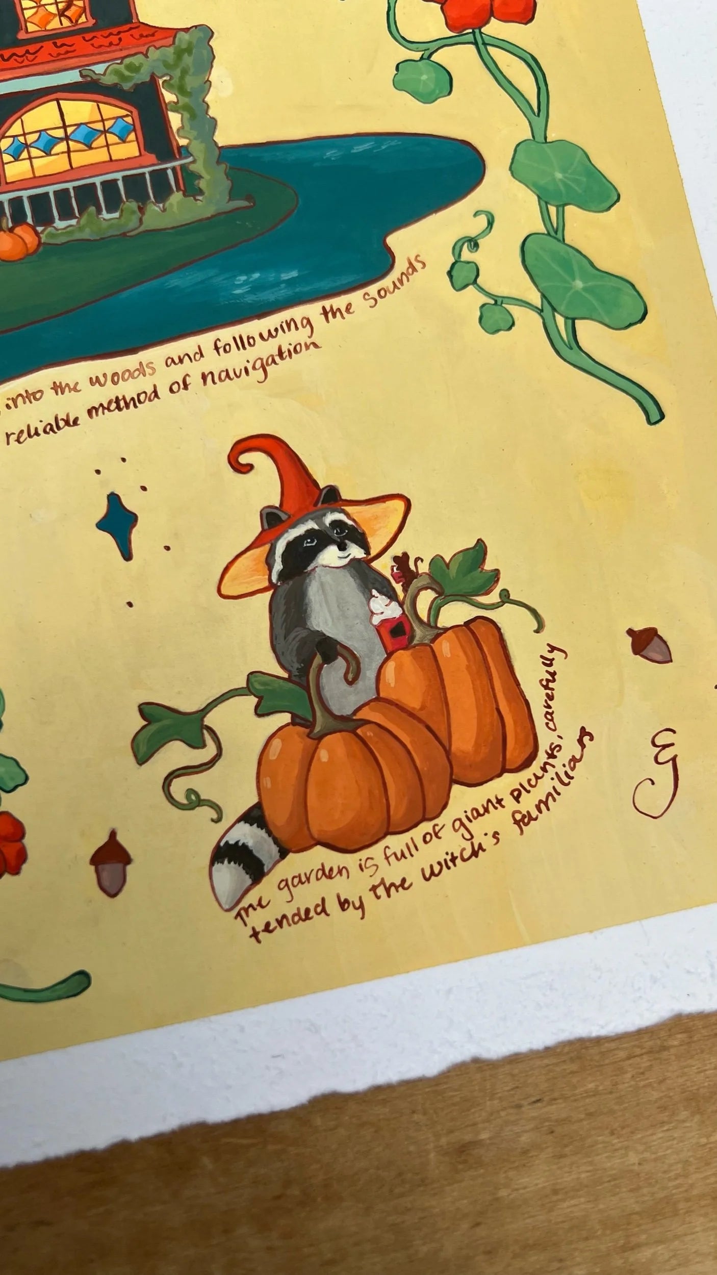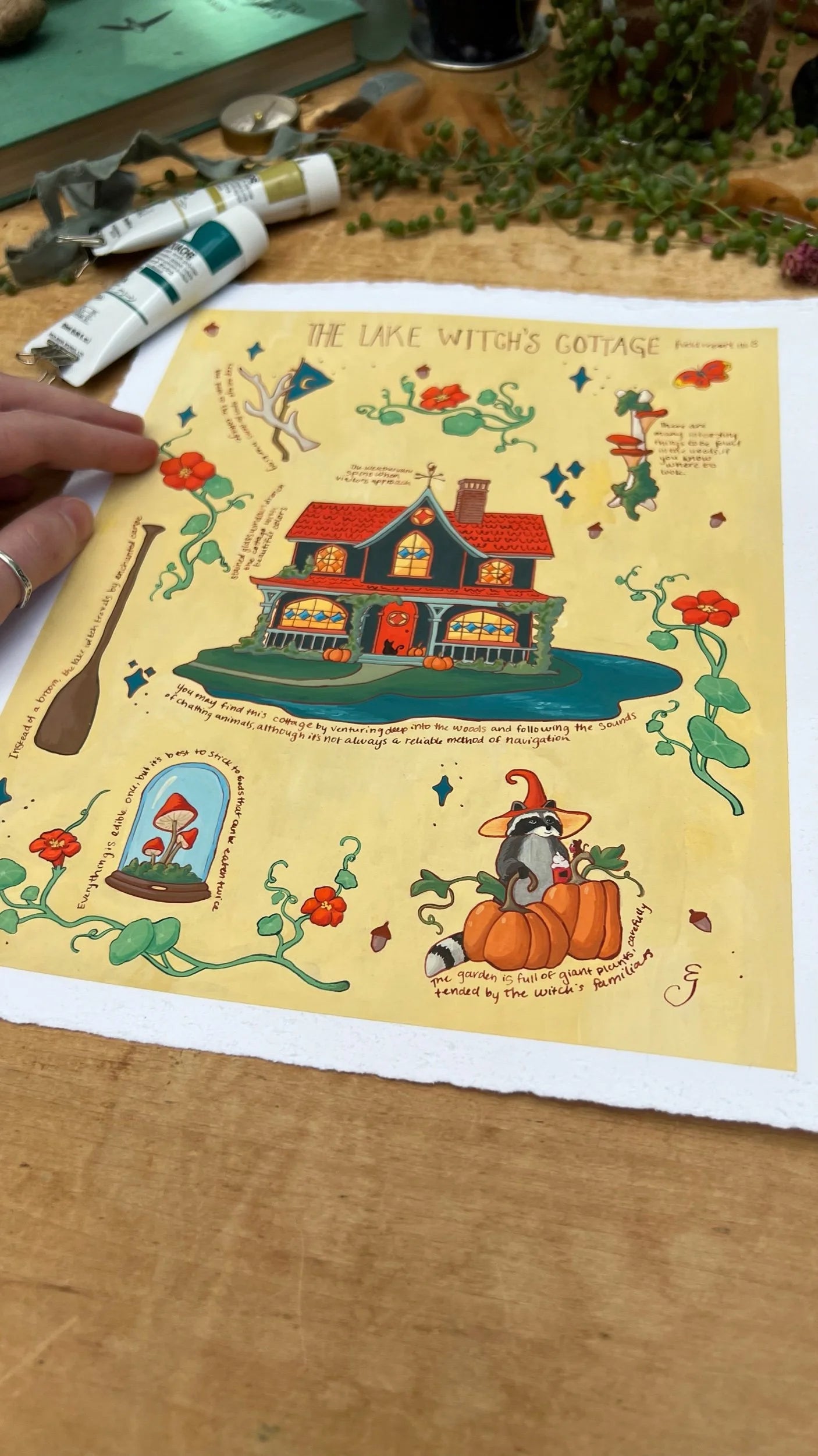 Original gouache field report on the Lake Witch's cottage, which is a delightful home full of magic, intrigue, and mischievous raccoons. Have you ever wondered about traveling via enchanted canoe, or wondered who tends the witch's garden? Look no further than this delightfully whimsical painting!