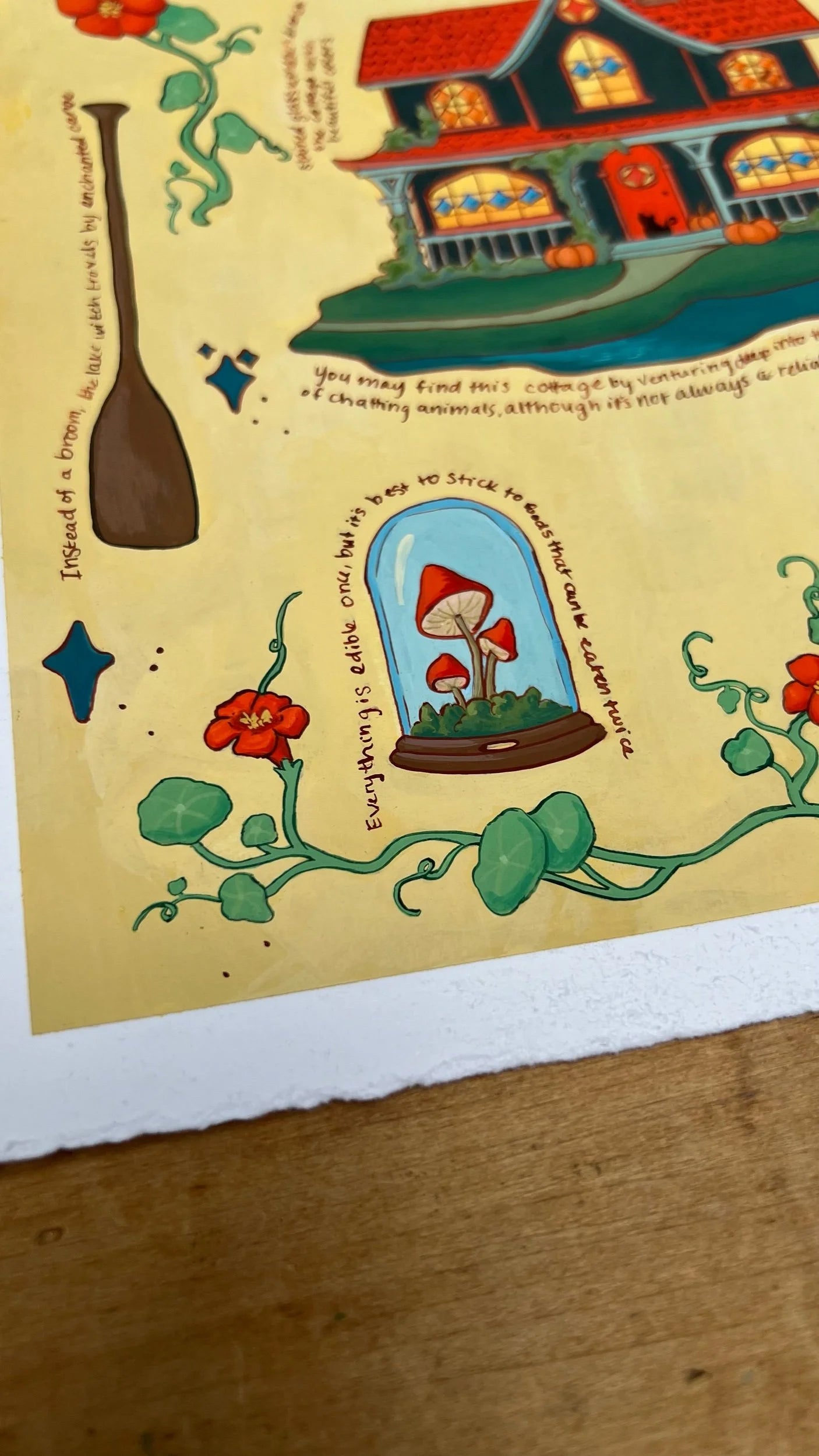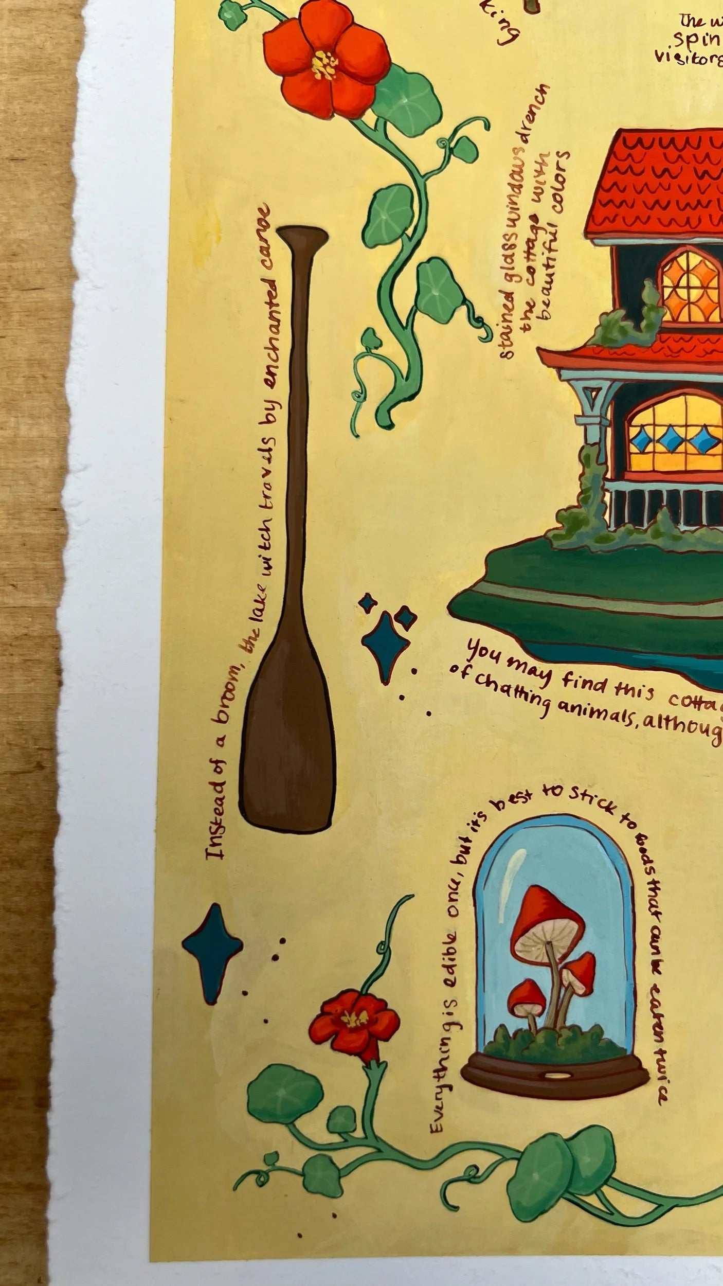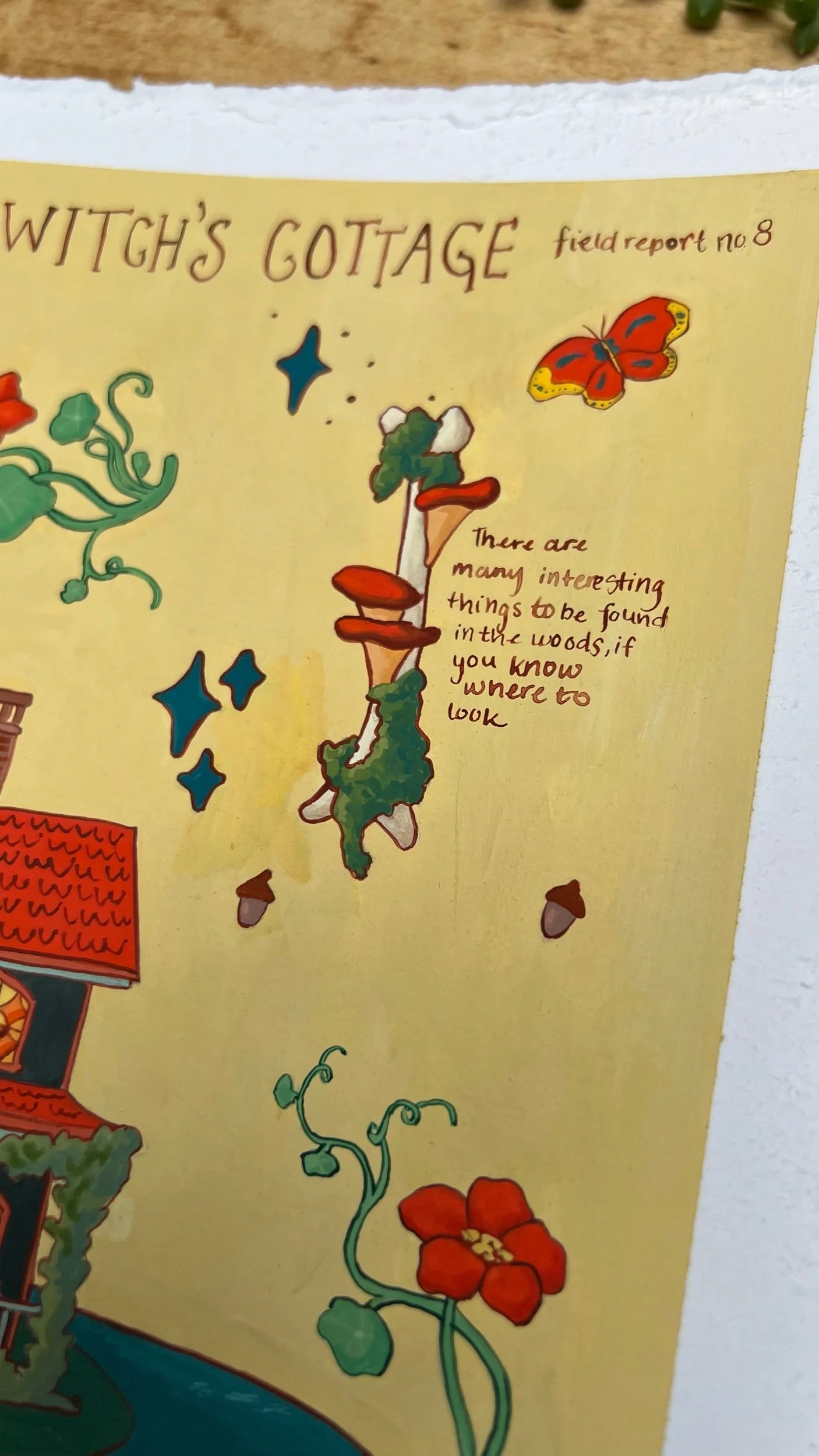 Original gouache field report on the Lake Witch's cottage, which is a delightful home full of magic, intrigue, and mischievous raccoons. Have you ever wondered about traveling via enchanted canoe, or wondered who tends the witch's garden? Look no further than this delightfully whimsical painting!