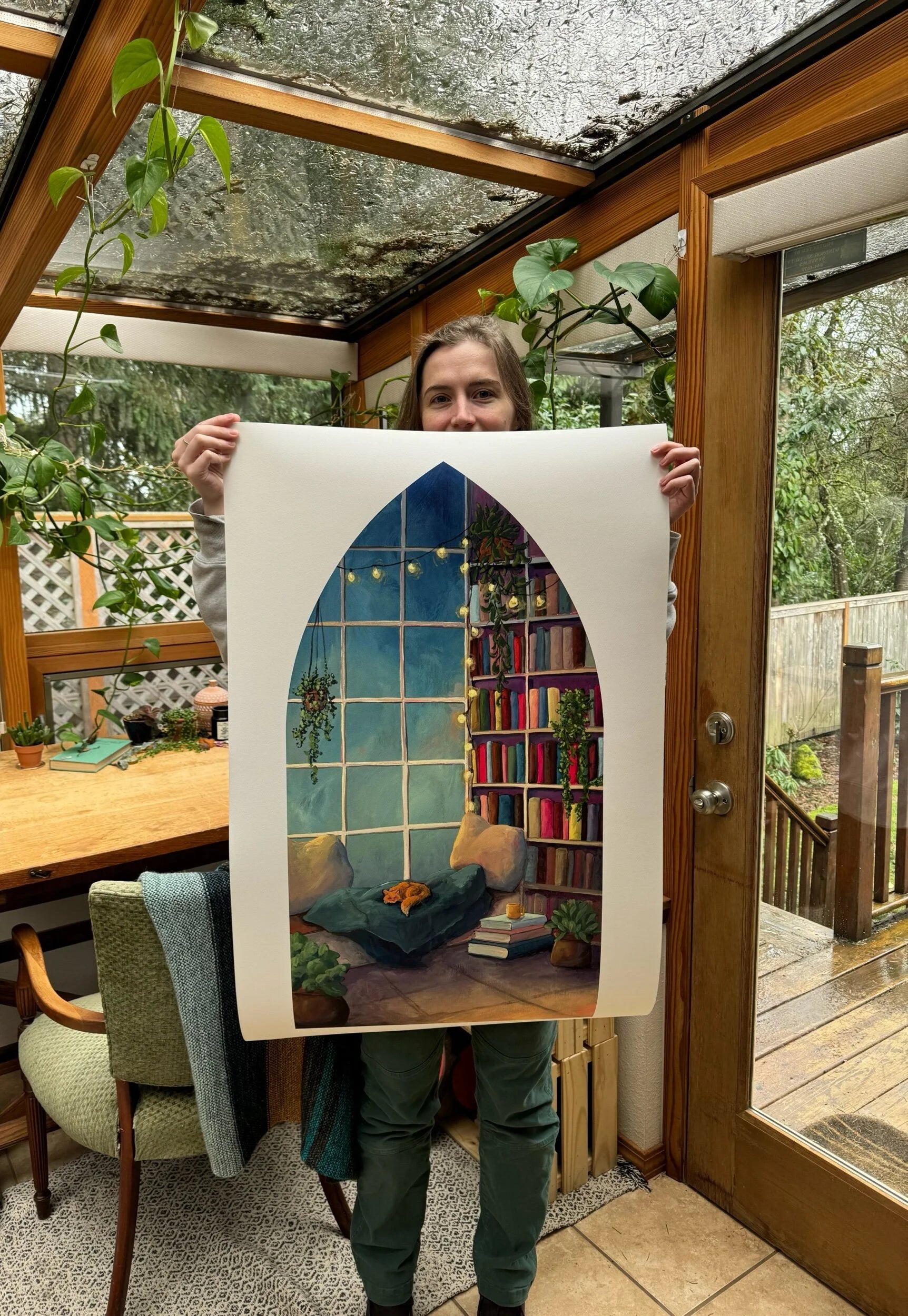 Giclée fine art print of my original hand-painted acryla gouache illustration of the magic of books, inspired by a childhood spent reading books by a cozy fire. This print depicts an orange cat napping on a welcoming window seat in the sunshine, surrounded by endless bookshelves and potted plants.