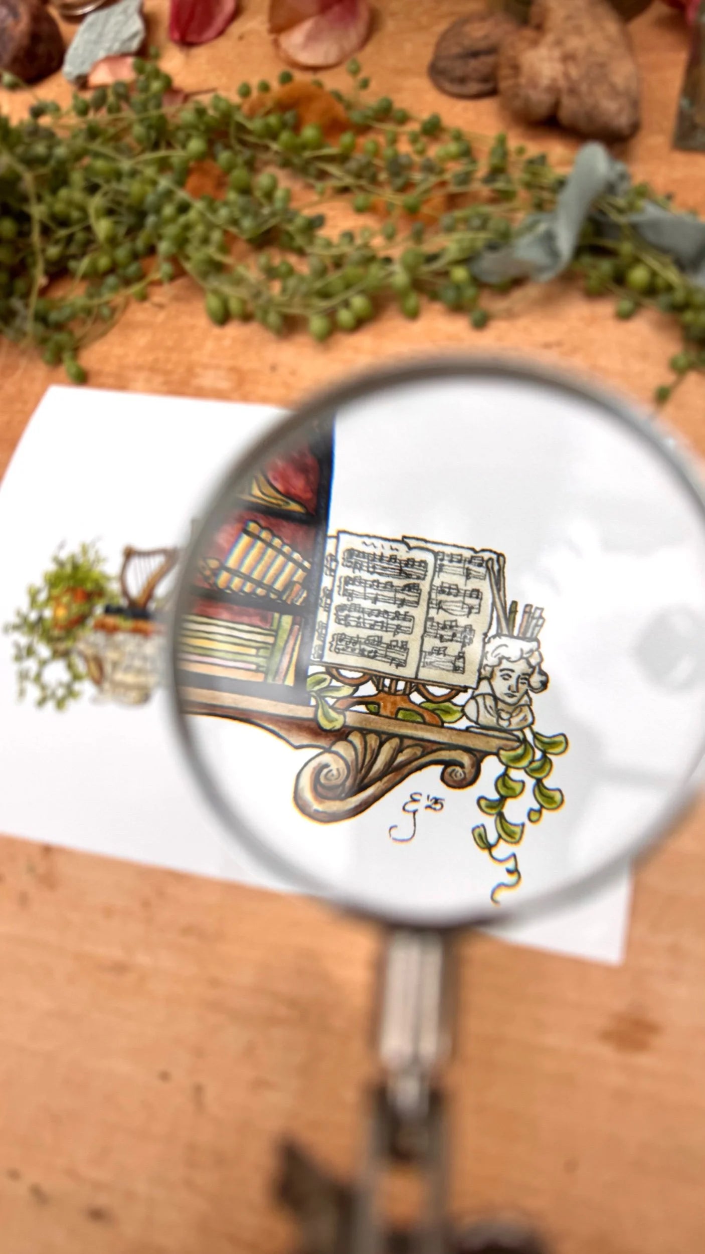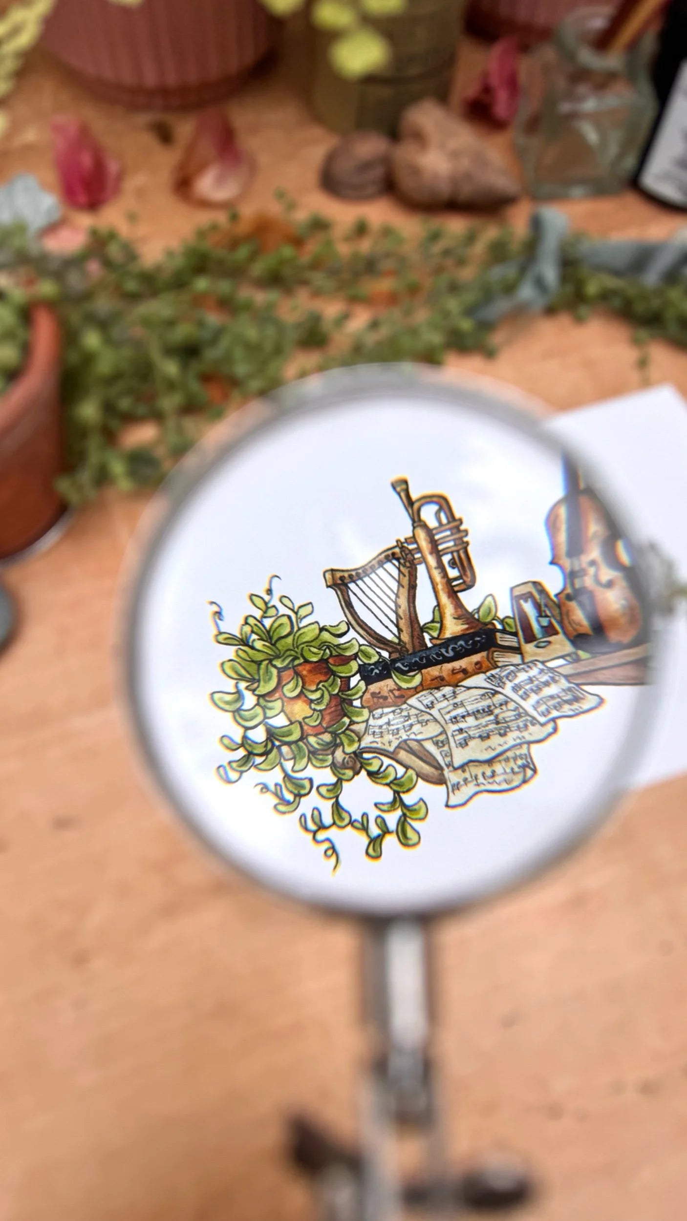 Giclée print featuring my original watercolor and ink illustration of the various instruments, trinkets, and stacks of sheet music one might find on the shelf of a vintage musician, including a violin, sheets of handwritten music, and a sprawling vine.