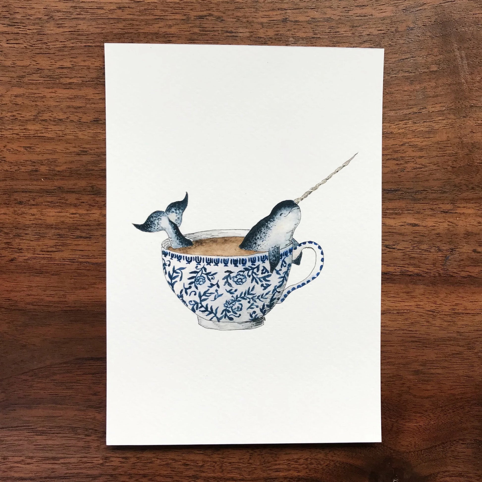 Giclée print of my original watercolor and ink natural history illustration, inspired by my love of the ocean and tea. I often drink tea while I paint, and I love the idea of a happy little narwhal swimming in a vintage china teacup.
