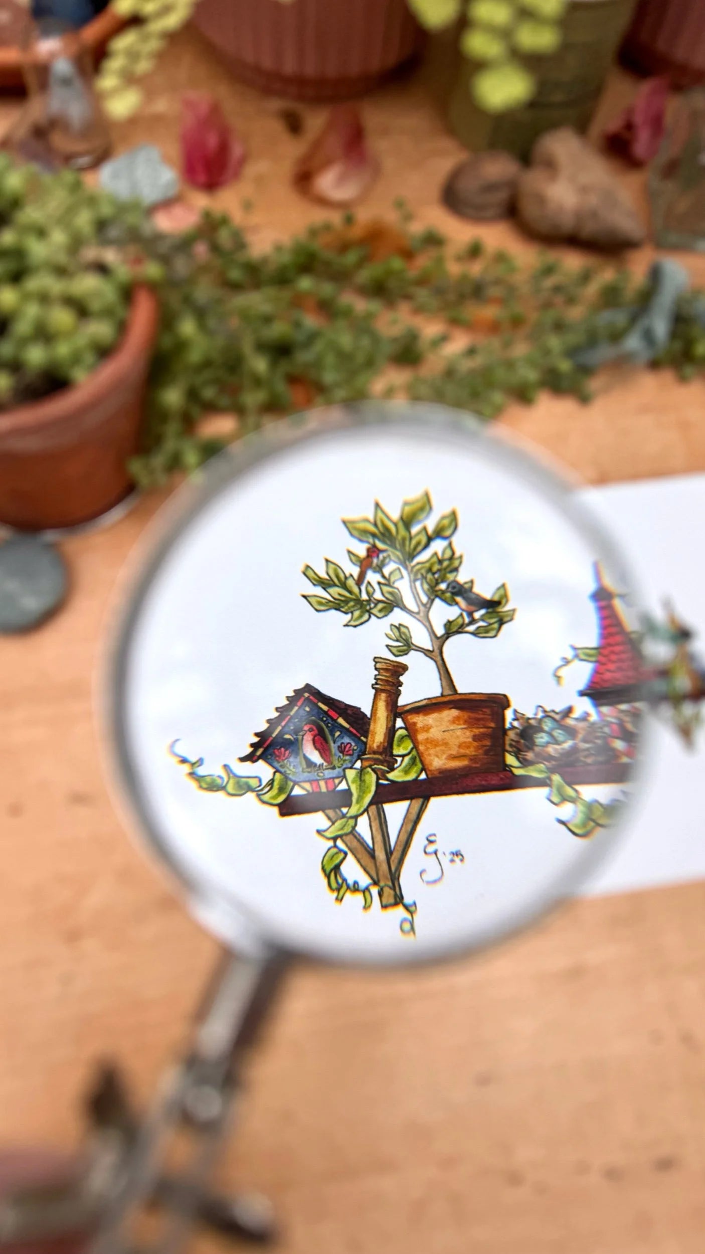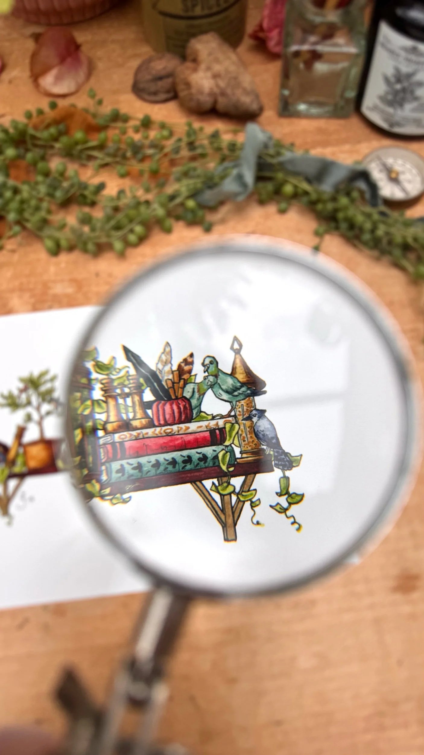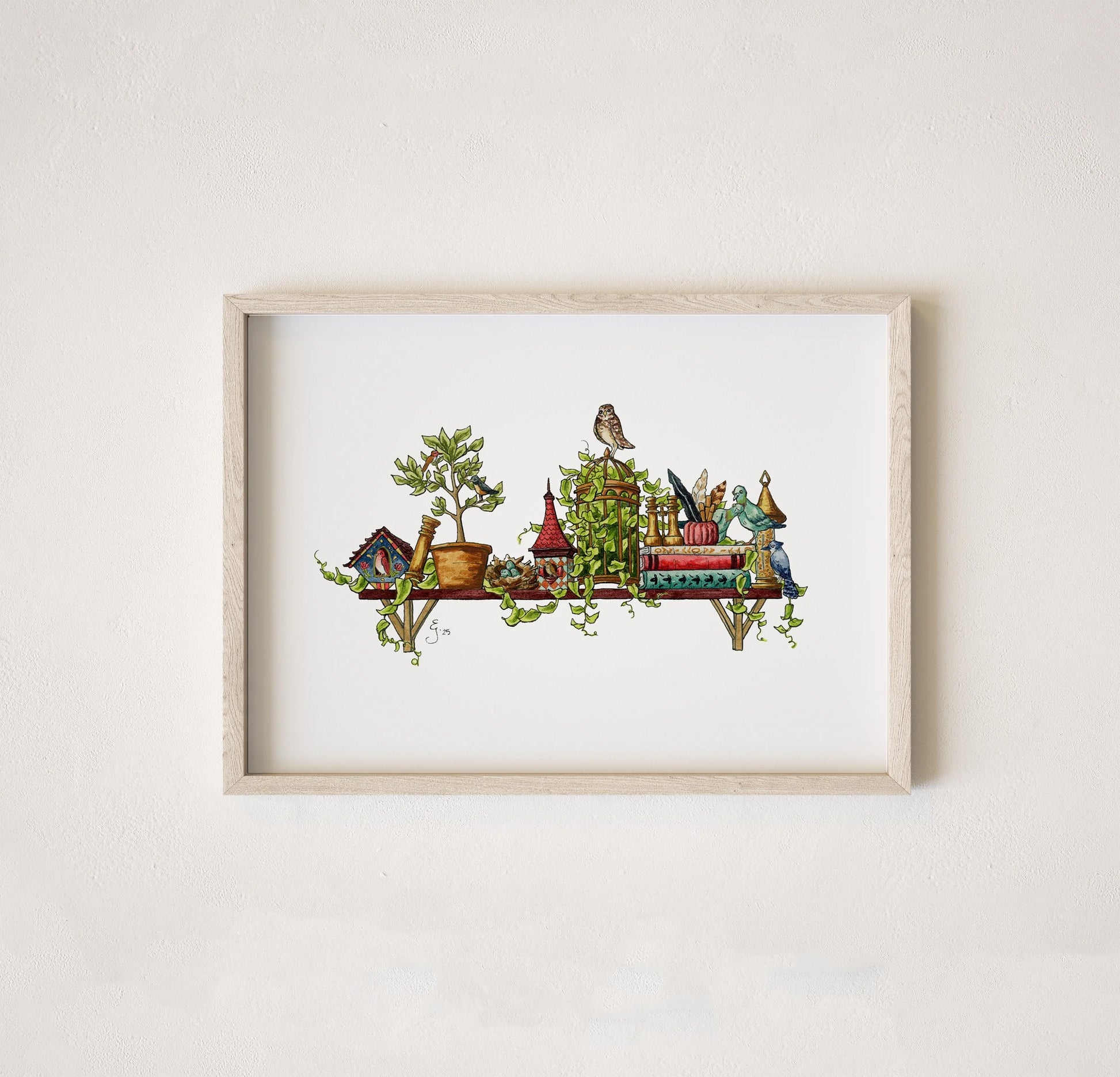 Giclée print featuring my original watercolor and ink illustration of the tiny and mischievous birds, assorted trinkets, and bird accoutrements one might find on the shelf of a vintage ornithologist.