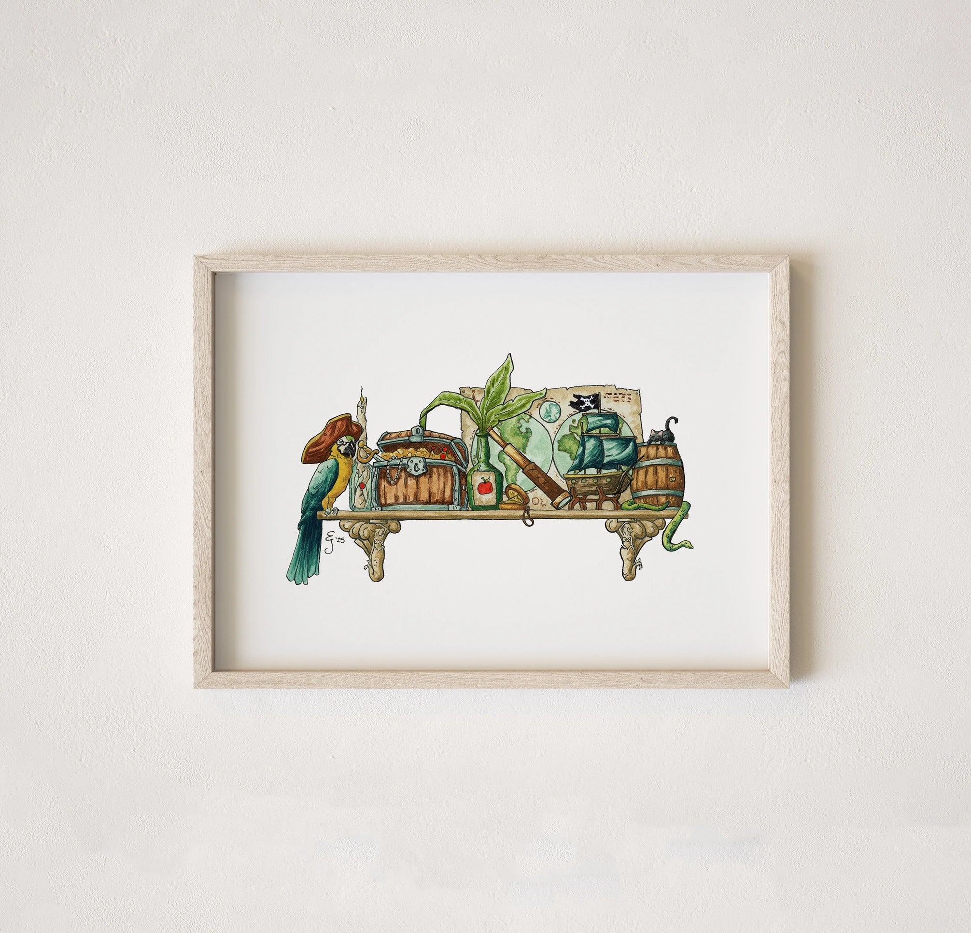 Giclée print featuring my original watercolor and ink illustration of the mischievous creatures, nautical tools, and assorted treasures one might find on the shelf of a pirate, including a brightly colored parrot, a model pirate ship, and a precocious cat.