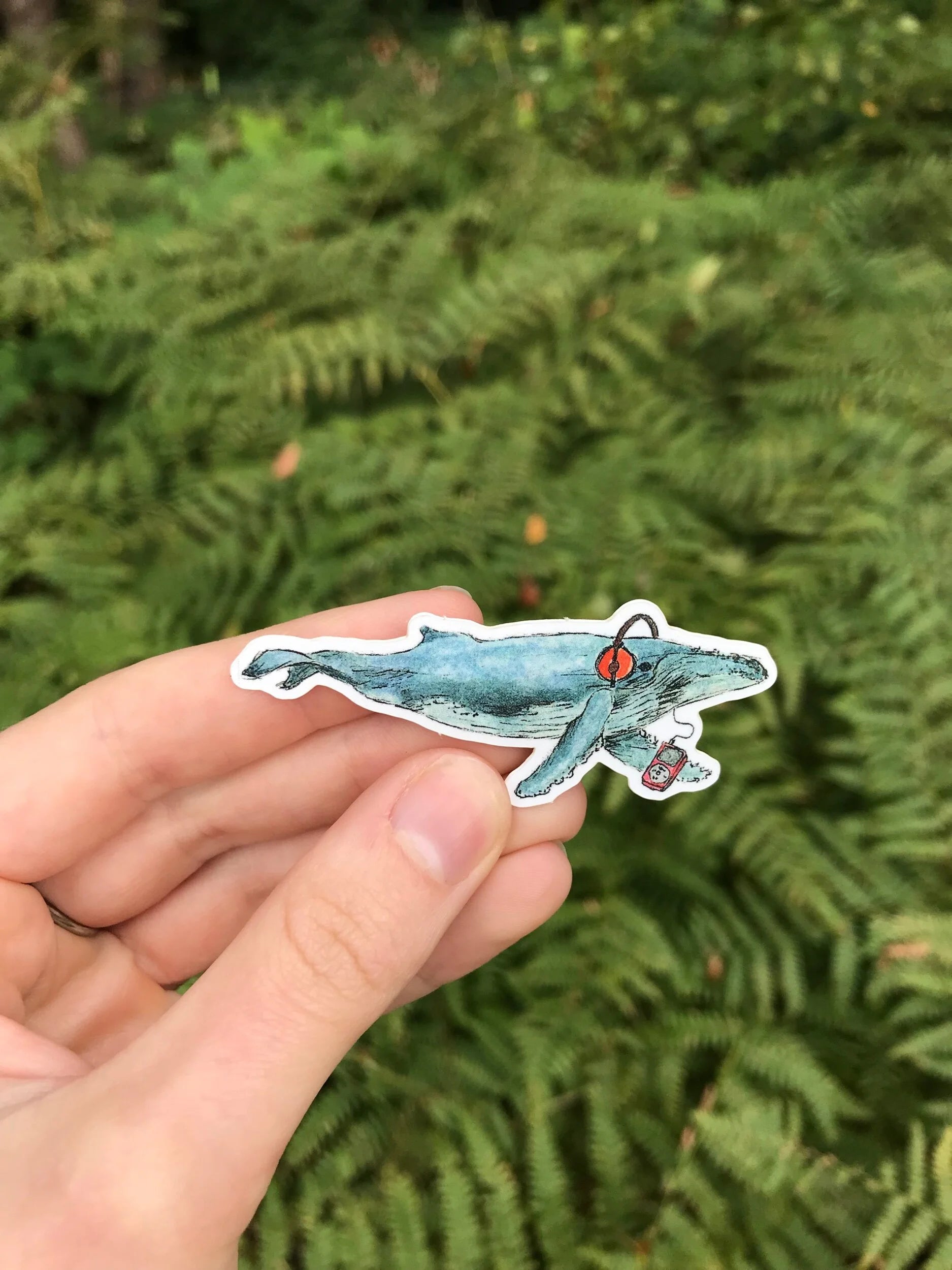 Vinyl sticker featuring my original watercolor and ink illustration of Edwin the musical whale.