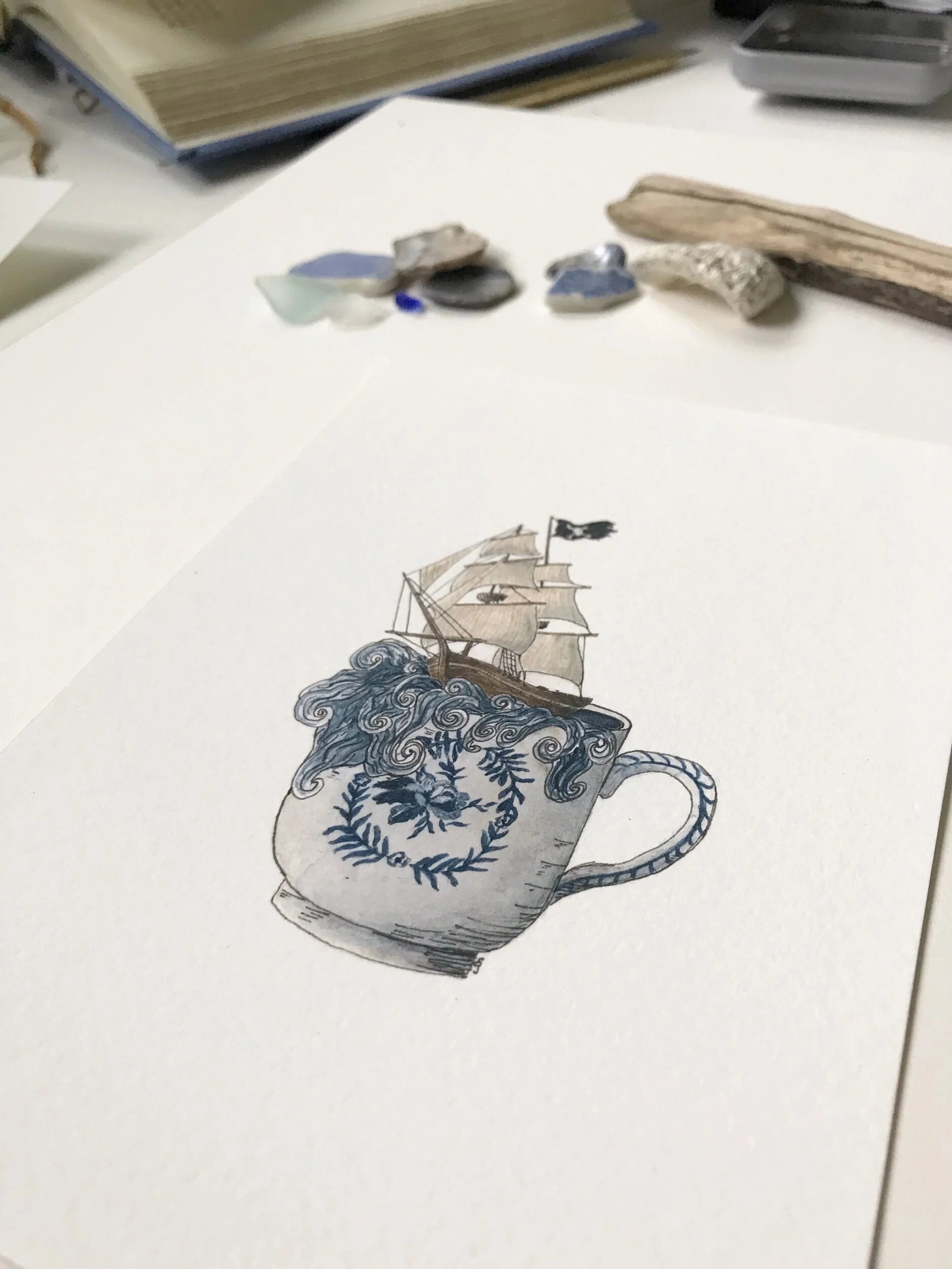Giclée print of my original watercolor and ink natural history illustration, inspired by my love of the ocean, pirate stories, and tea. I often drink tea while I paint, and I love the idea of a tiny pirate ship sailing in a vintage china teacup.