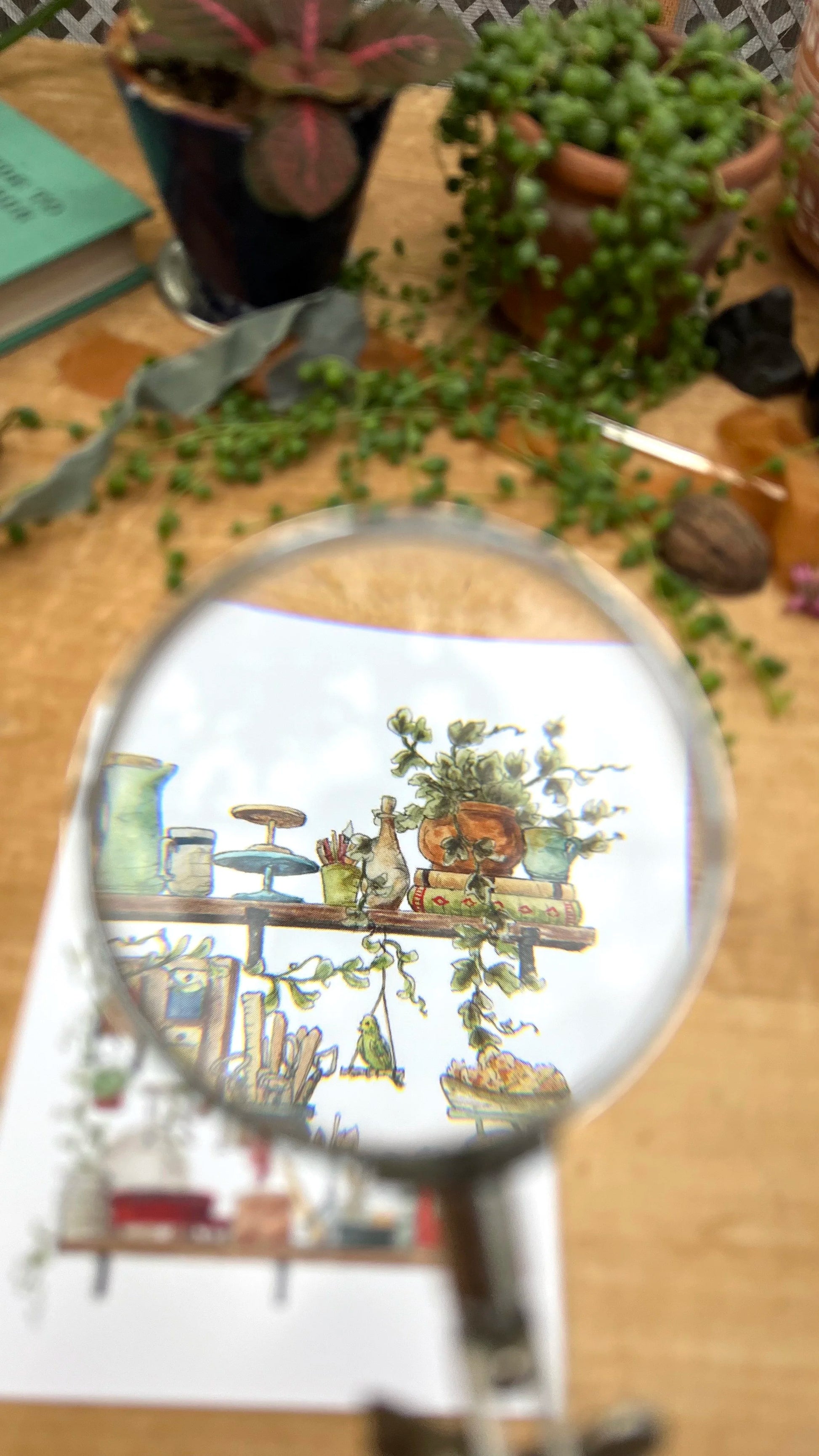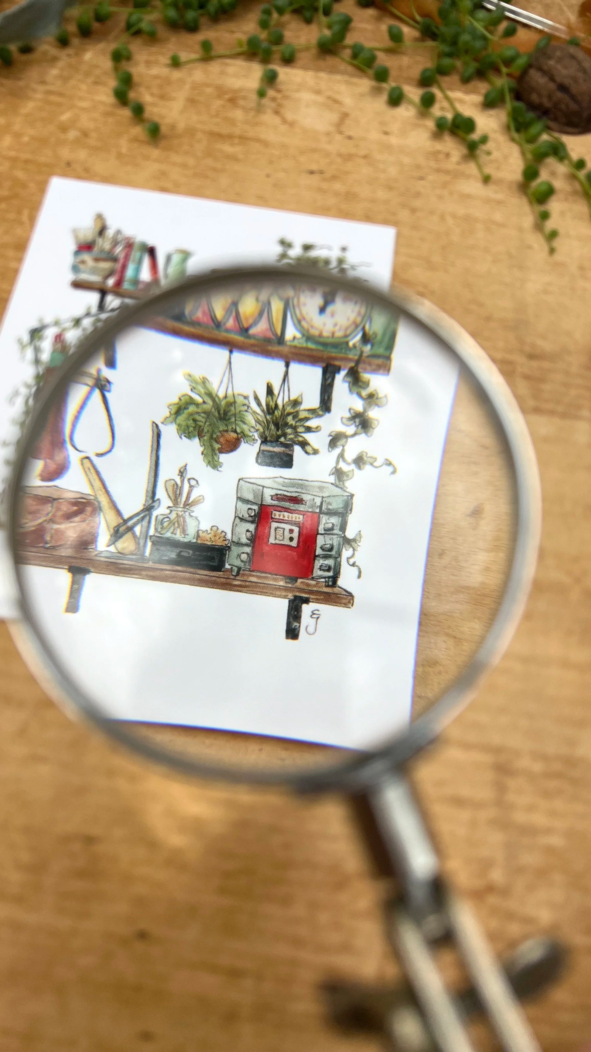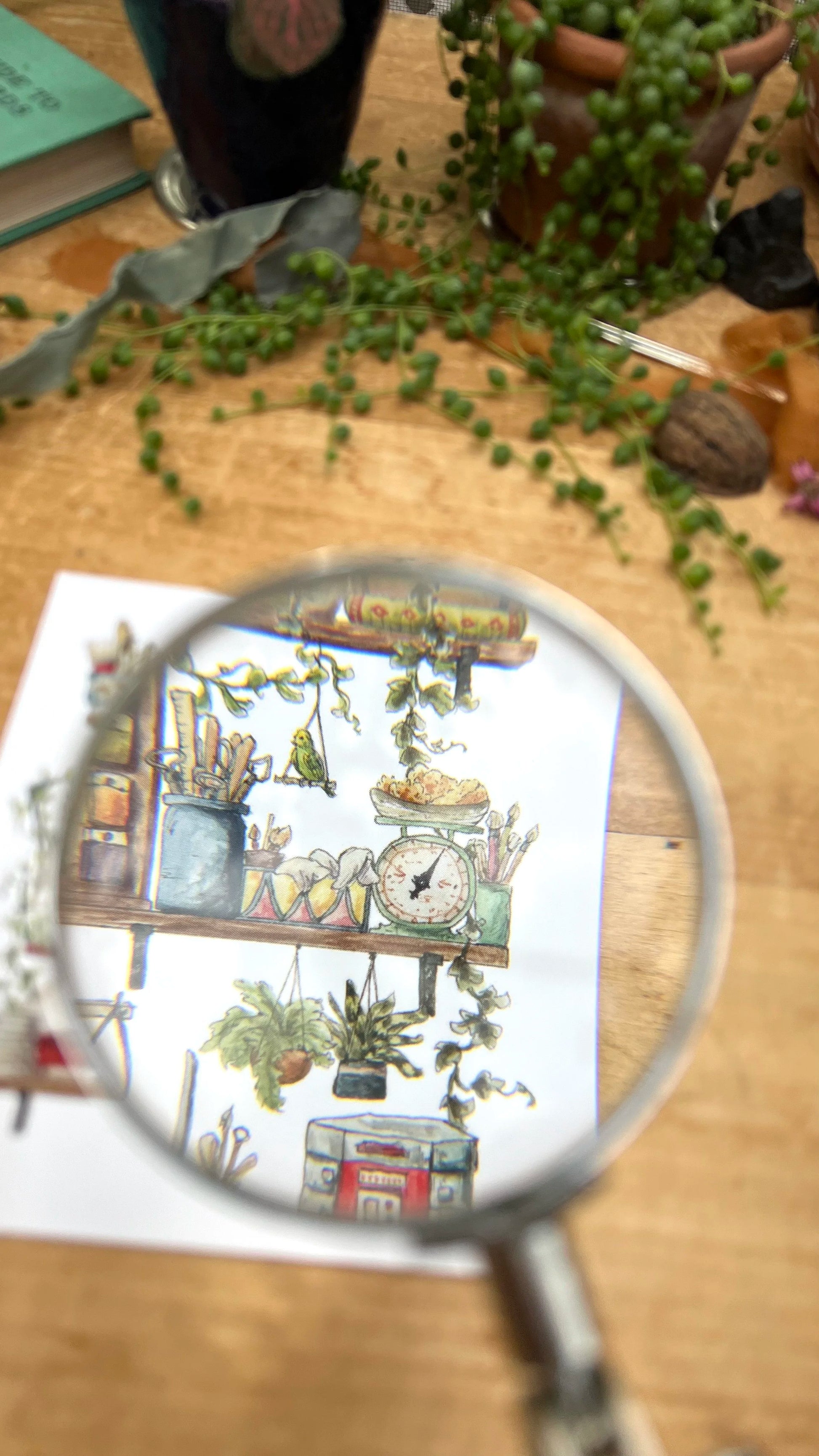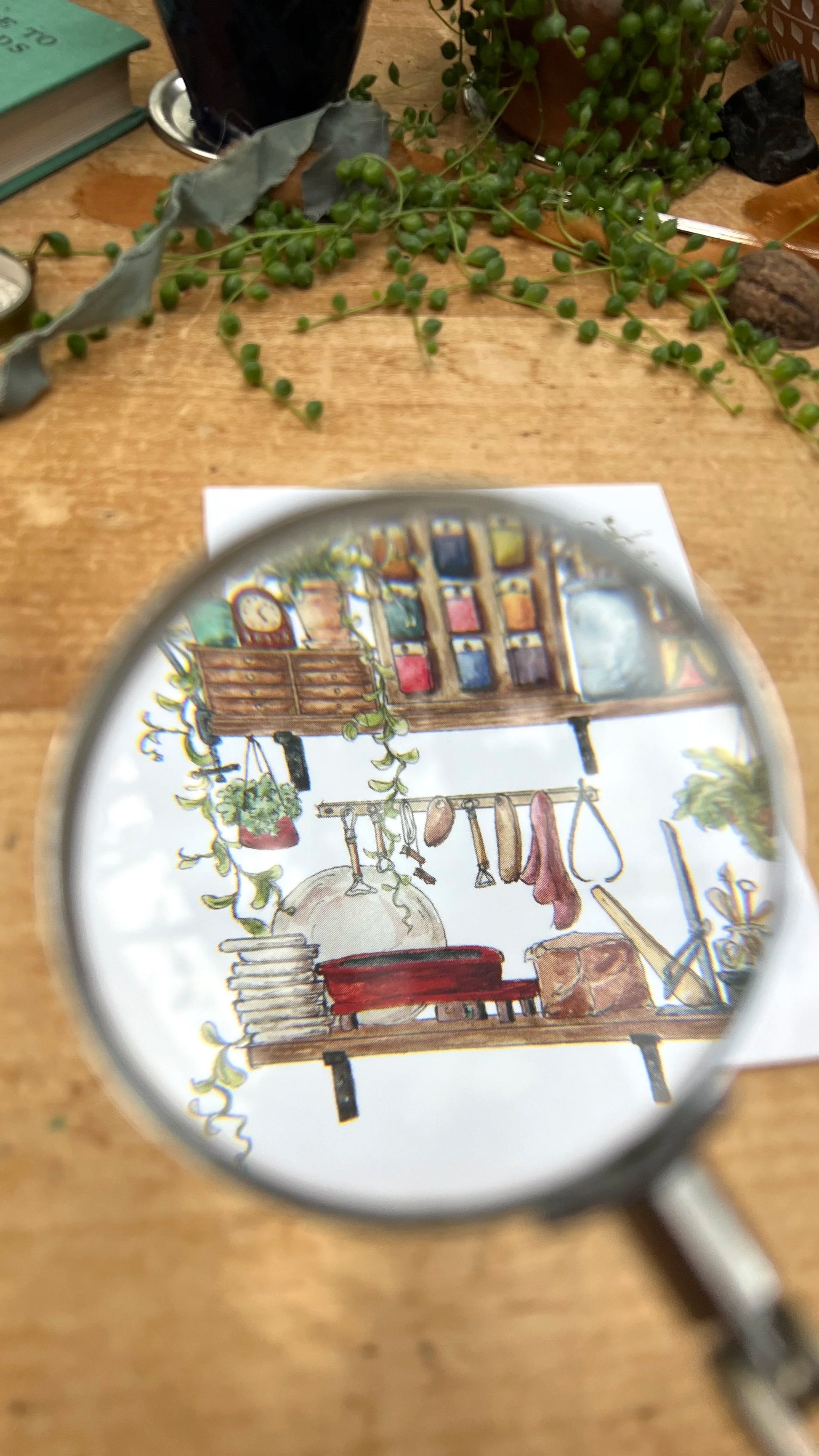 Postcard featuring my original watercolor and ink illustration of the vintage oddities and books tucked away in the shelves of a potter, including glaze test tiles, a tiny kiln, and a bowl of sponges