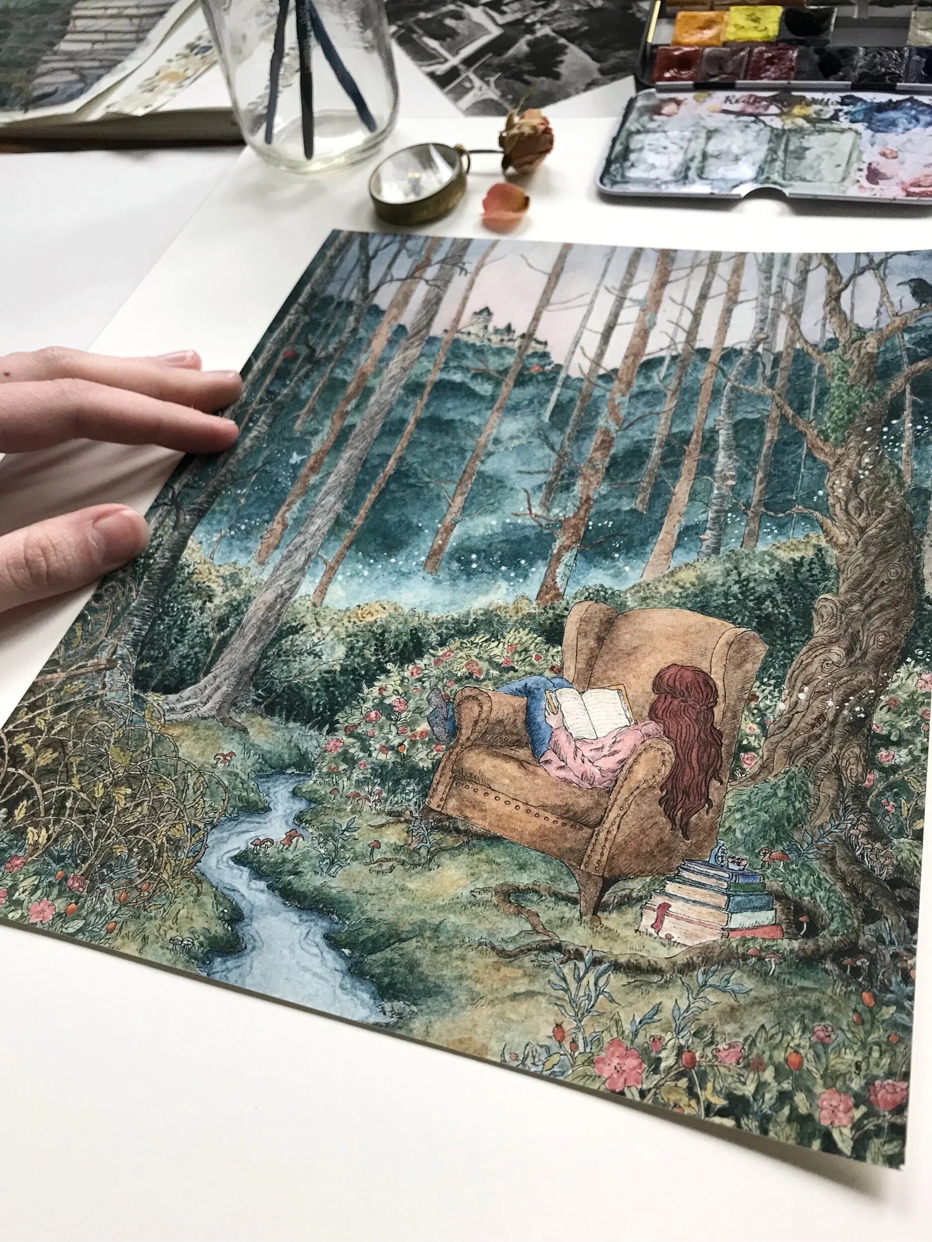 Giclée fine art print of my original watercolor and ink illustration of a girl curled up in a cozy armchair with a stack of books, reading her favorite fairytales. This piece is inspired by my love of mythology and fantasy stories, where reading transports you to another world, full of intrigue, magic, and possibility. This painting is full of tiny fairytale details, including thorn bushes and a spindle for Sleeping Beauty (Little Briar Rose), roses for Beauty and the Beast, Cinderella's castle and pumpkin carriage, Snow White's apple, a potion and a cake from Alice in Wonderland, tiny mushrooms, a fairy, a raven, and tiny lights guiding the path. I hope it conveys the magic and wonder of a reading your favorite books.