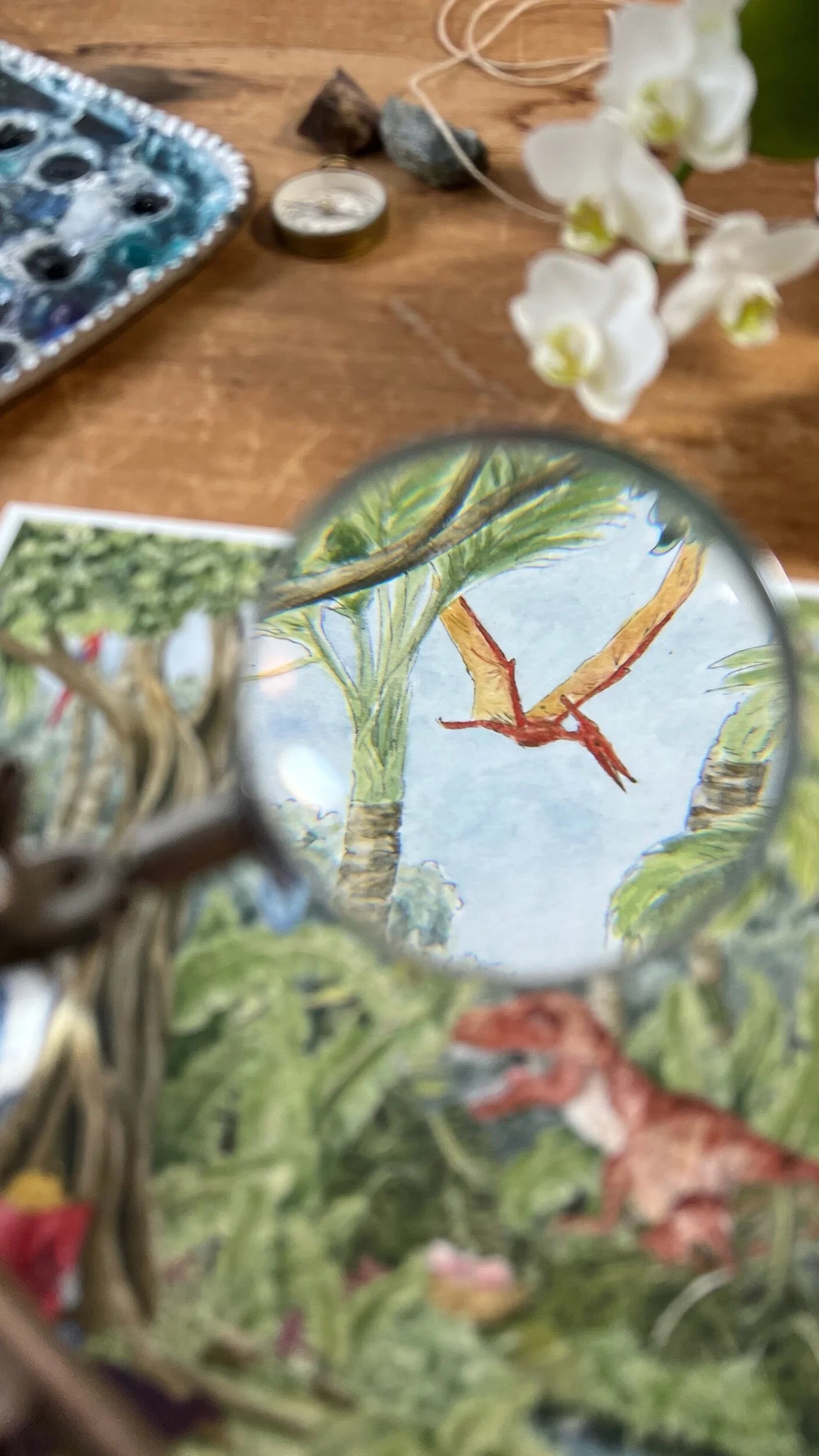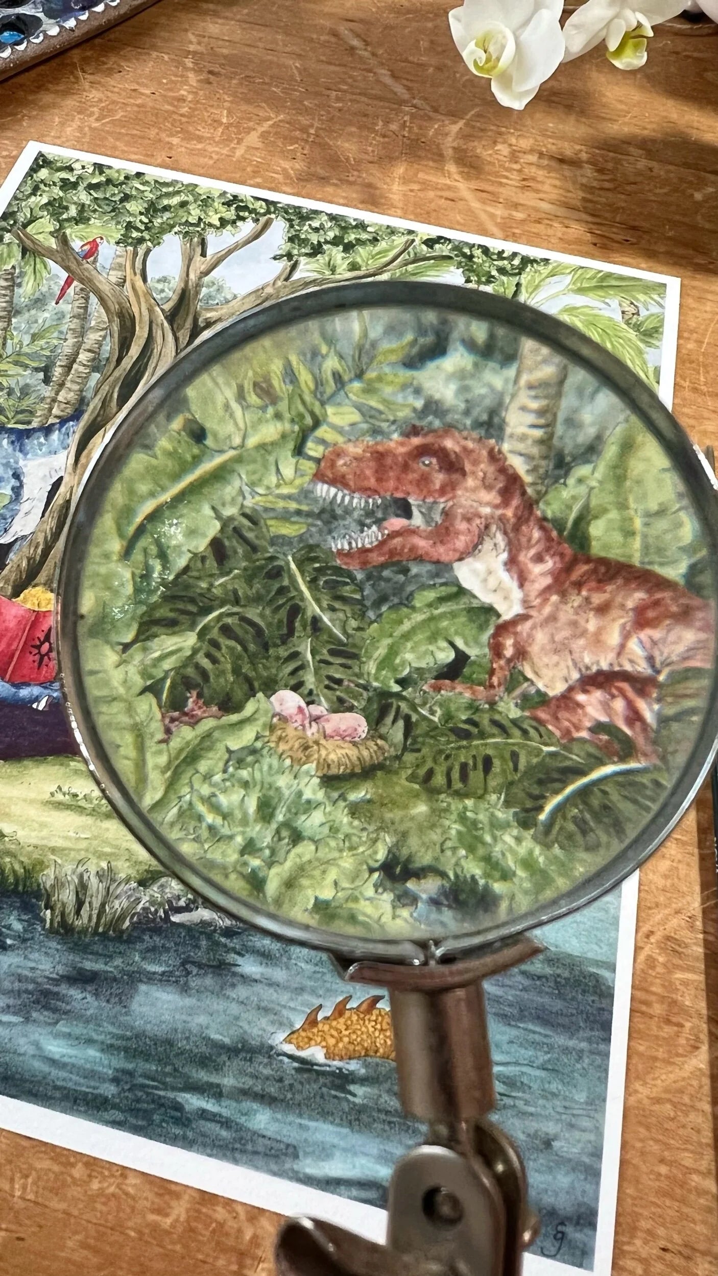Giclée fine art print of my original watercolor and ink illustration of a young child reading a book which has transported them to a land full of friendly dinosaurs and talkative birds. This piece is inspired by my love of mythology and adventure stories, where reading transports you to another world, full of intrigue, magic, and possibility. This painting is full of tiny details, and I hope it conveys the magic and wonder of a reading your favorite books.