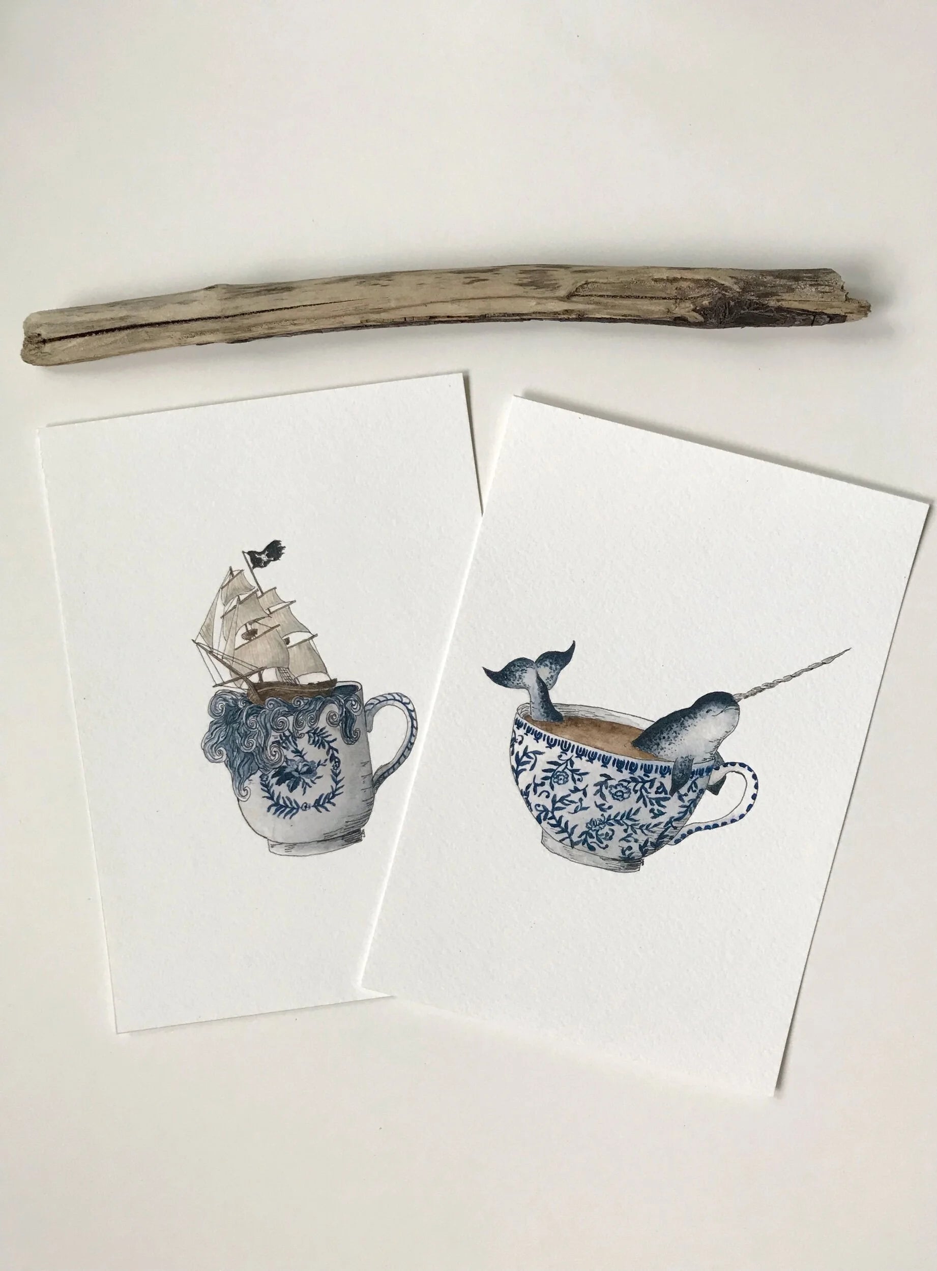 Pair of two giclée fine art prints of my original watercolor and ink natural history illustrations, inspired by my love of the ocean and tea. I often drink tea while I paint, and I love the idea of a happy little narwhal swimming in a vintage china teacup, and a fearsome pirate ship sailing in a tiny teacup storm.