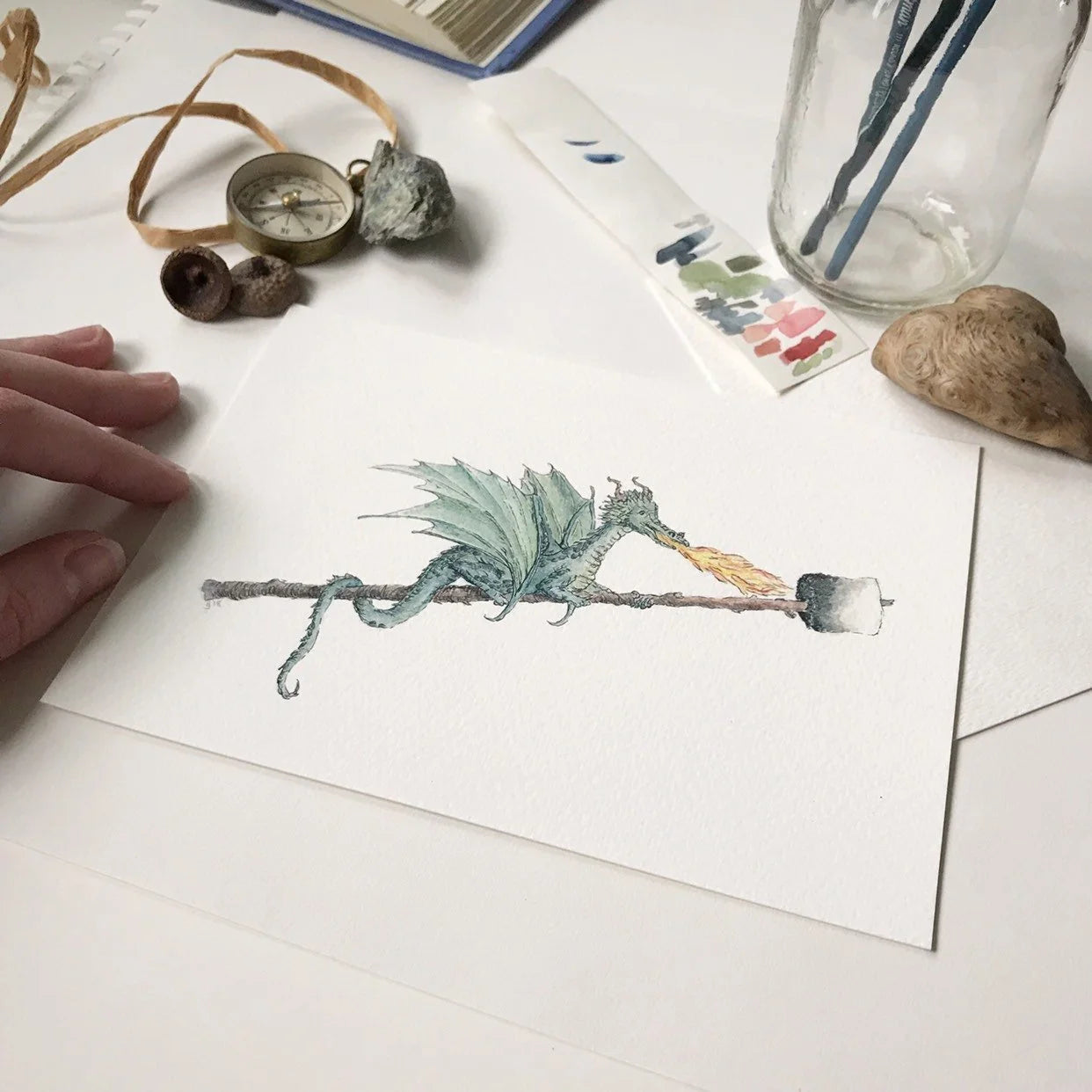 Giclée fine art print of my original watercolor and ink illustration, inspired by wonderful summers spent making s'mores and reading books by the campfire. It's always good to have an adventure buddy, and this little dragon is the ideal one, since there are always delicious s'mores to share! This print is the perfect way to bring some of the magic of summer adventures into your home, to enjoy and dream about all year long.