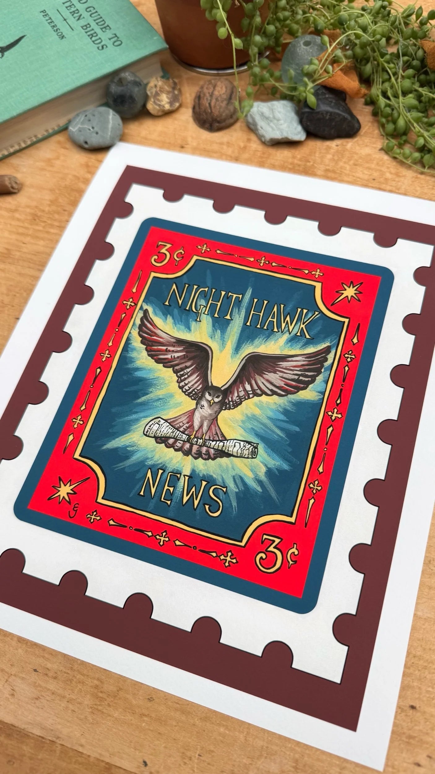 Bundle of four giclée fine art prints of whimsical stamp illustrations from a fantasy realm where you choose your stamp based on the type of letter and how fast you’d like it delivered.