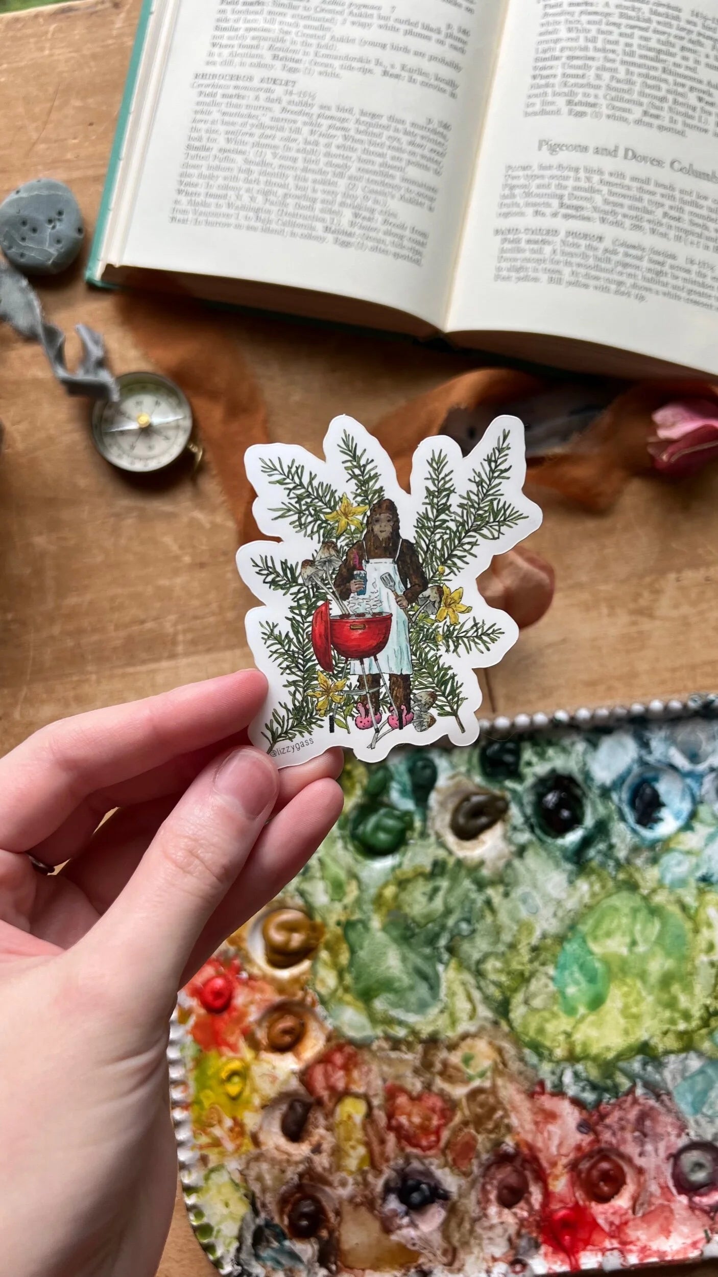 Matte vinyl sticker of my original watercolor and ink field report of Sasquatch in the summer, grilling up some burgers.