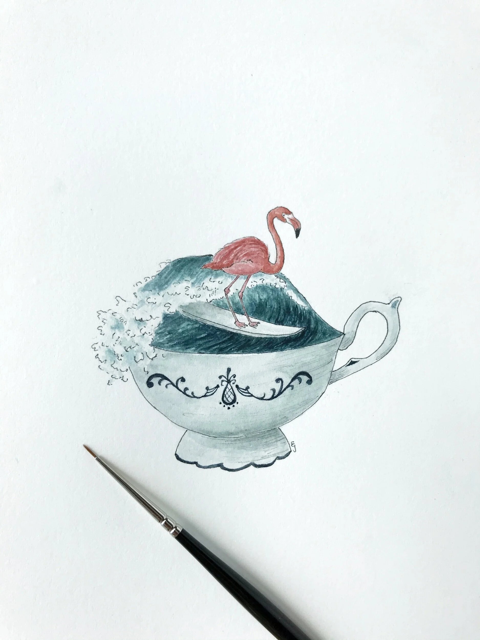 Giclée print of my original watercolor and ink natural history illustration, inspired by my love of the ocean and tea. I often drink tea while I paint, and I love the idea of a super cool flamingo surfing happily in a vintage china teacup.