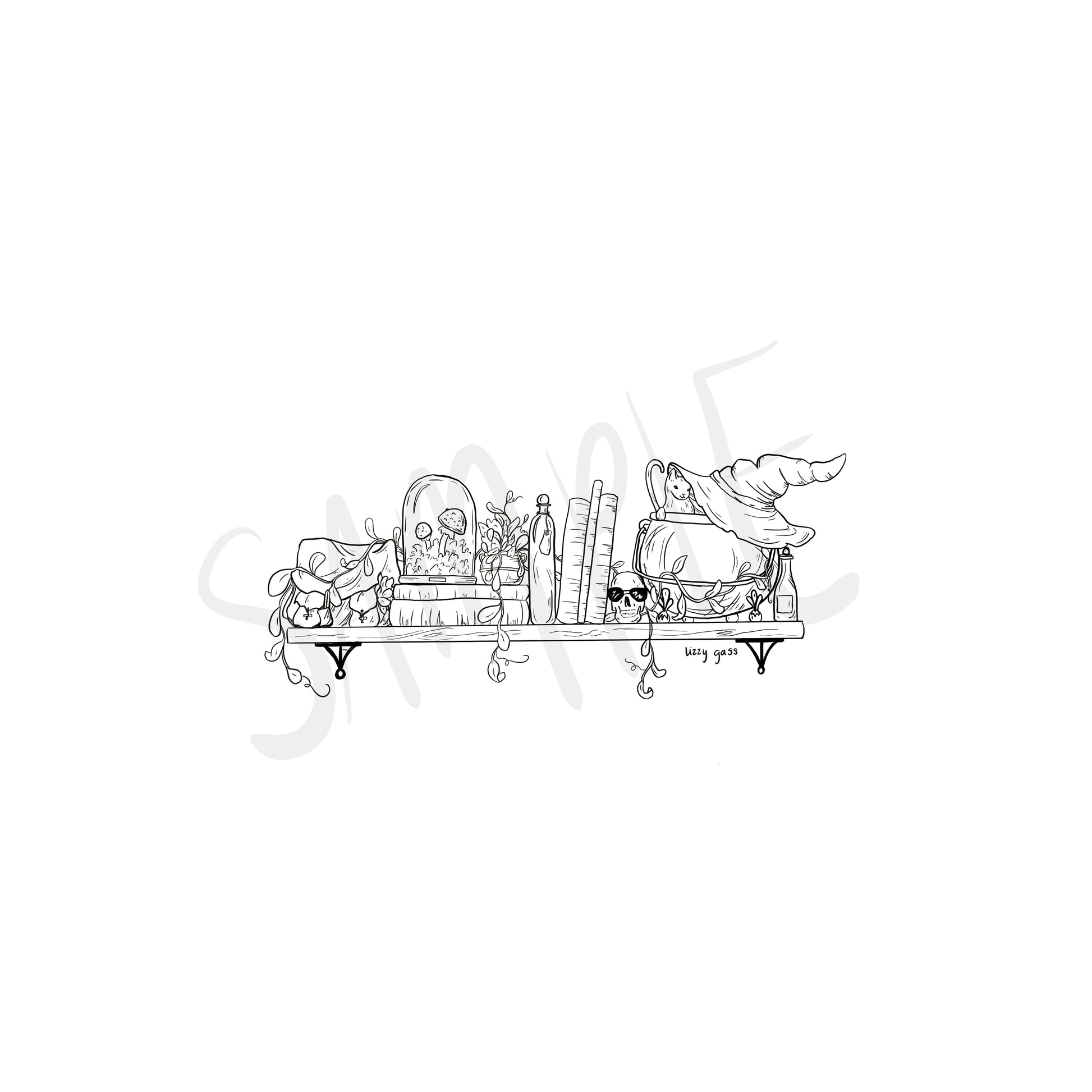 This whimsical, hand-drawn coloring book page shows the magical odds and ends that can be found on the shelf of a friendly witch.