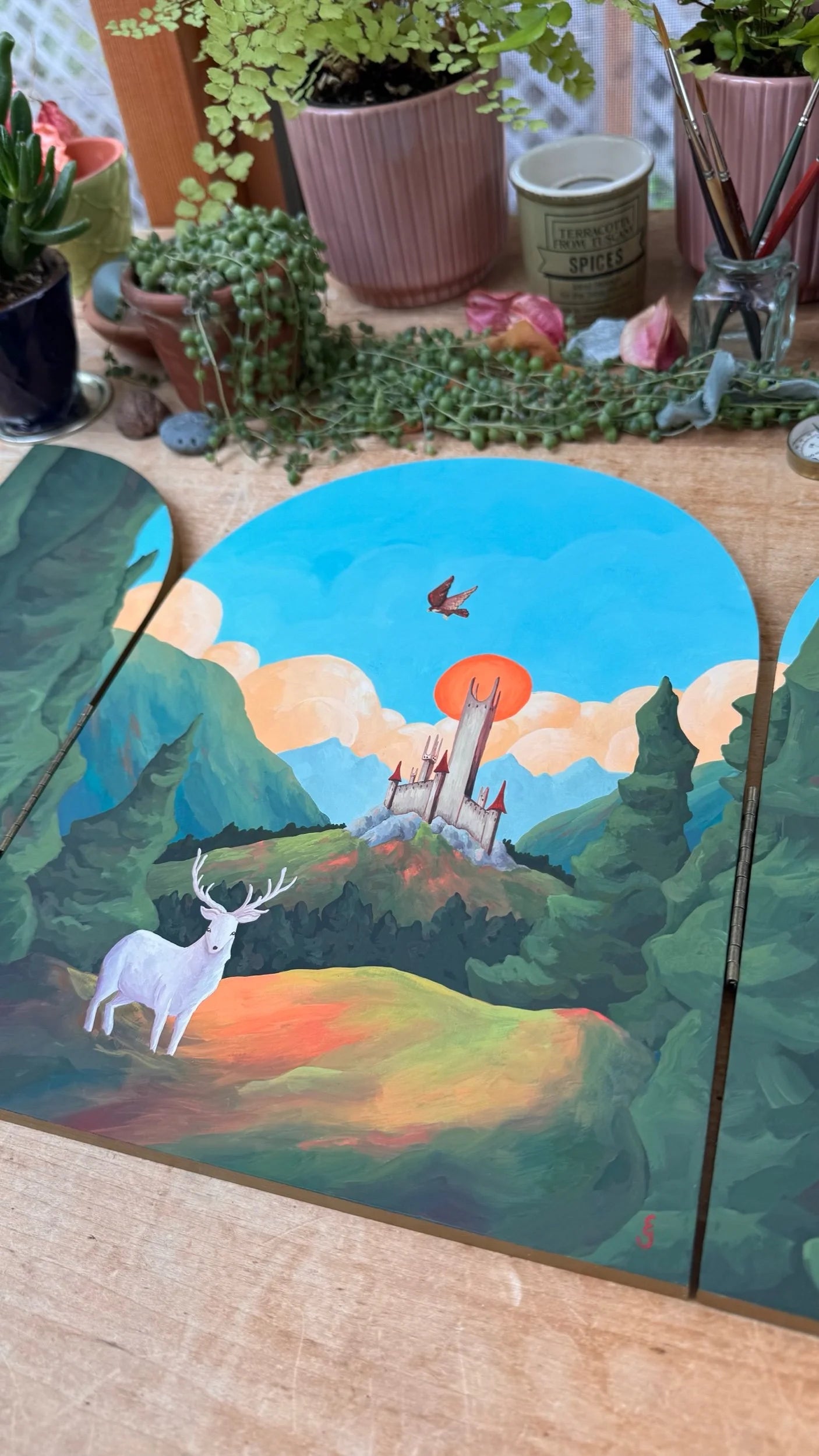 Original hand-painted illustration inspired by the Throne of Glass series. This unique folding panel includes two paintings - on the outside, you’ll find Aelin looking out over the Glass Palace in Rifthold, from the beginning of the first book, and on the inside, you’ll see the city of Orynth in Terrasen, along with the iconic white stag and Rowan flying in the sky. The illustration is bright and colorful, inspired by descriptions of Aelin.