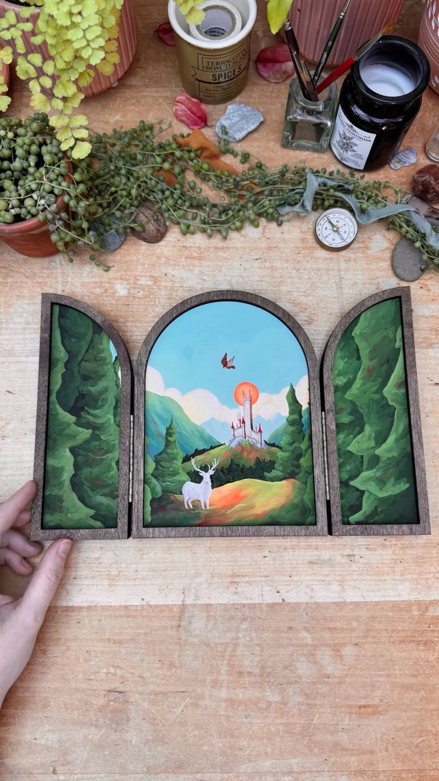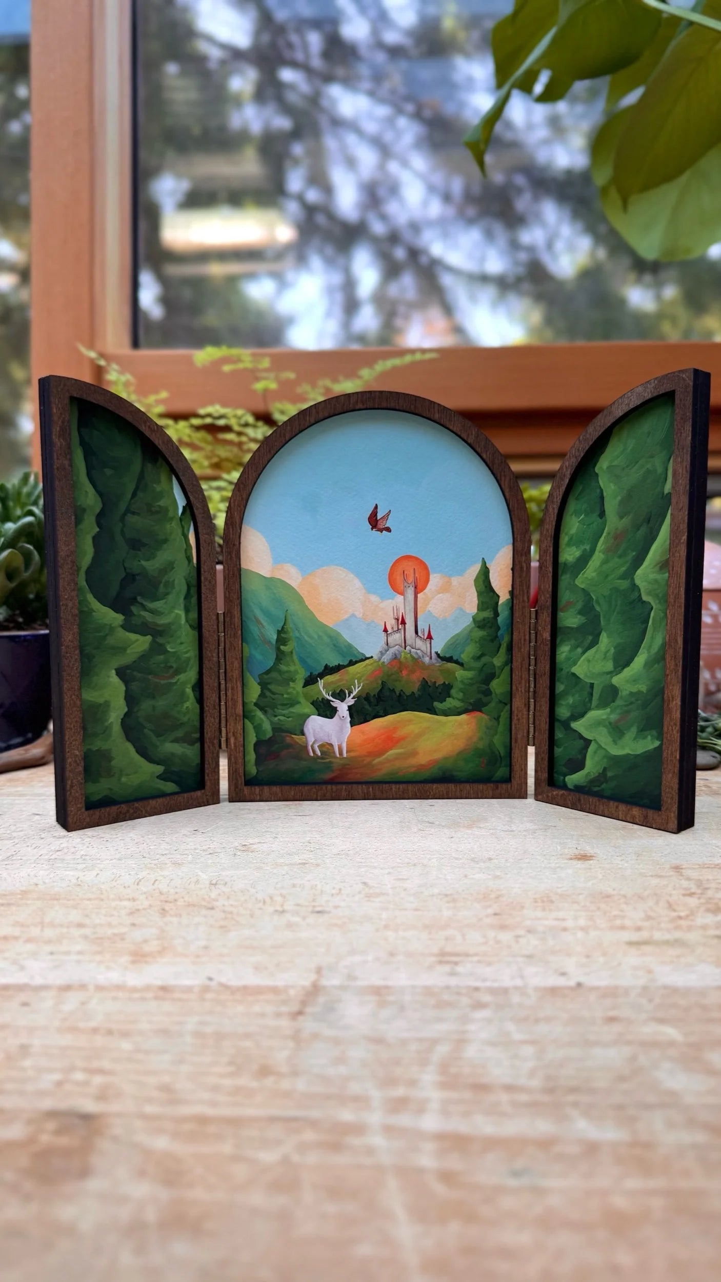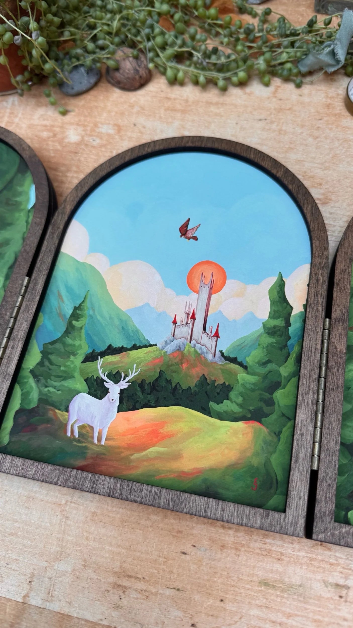 This unique framed, folding print is made from my original hand-painted illustration inspired by the Throne of Glass series. This folding print includes two illustrations - on the outside, you’ll find Aelin looking out over the Glass Palace in Rifthold, from the beginning of the first book. On the inside, you’ll see the city of Orynth in Terrasen, along with the iconic white stag and Rowan flying in the sky. The illustrations are bright and colorful, inspired by descriptions of Aelin.