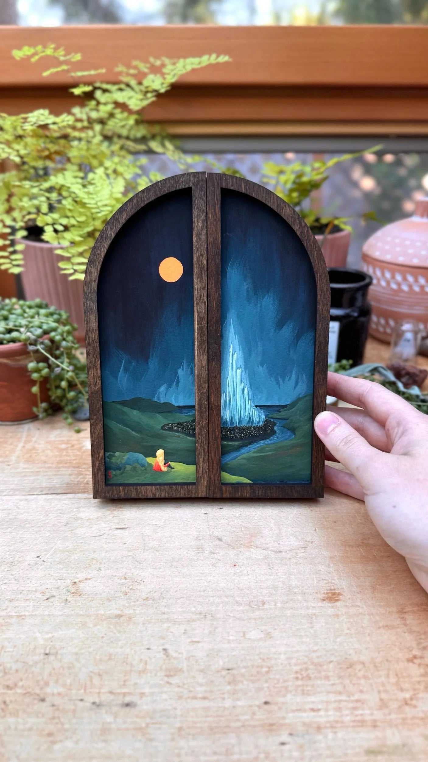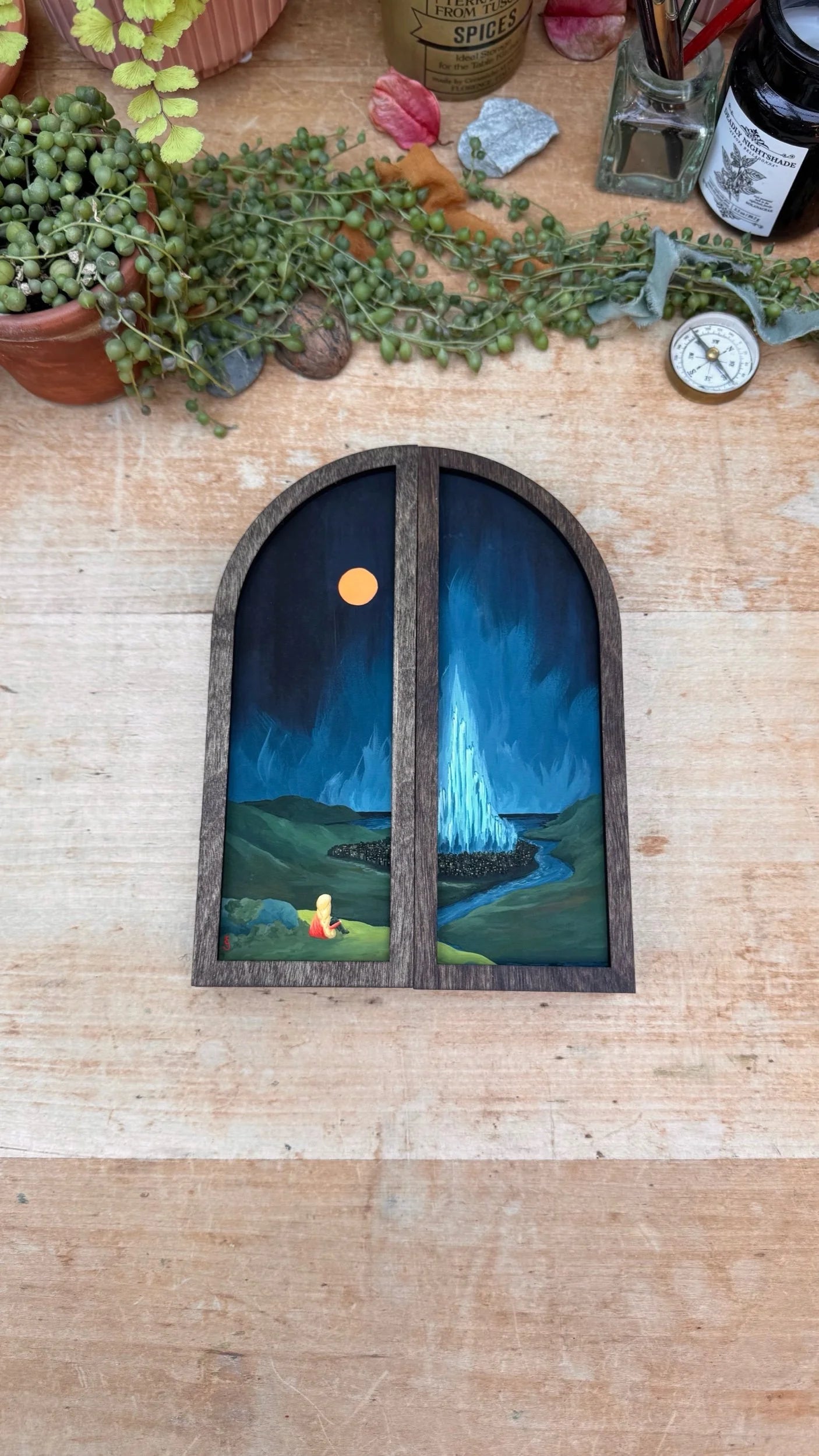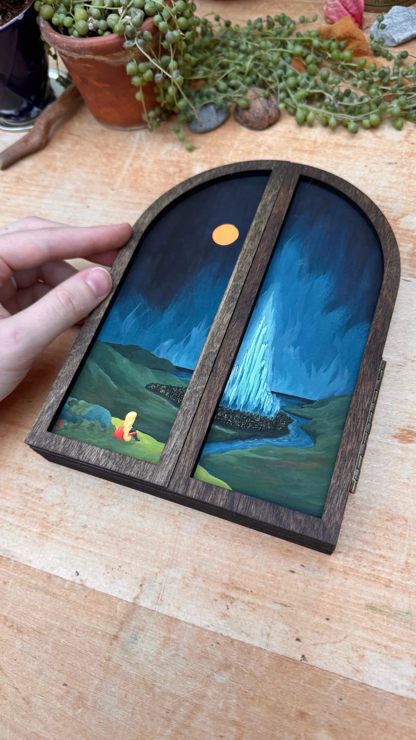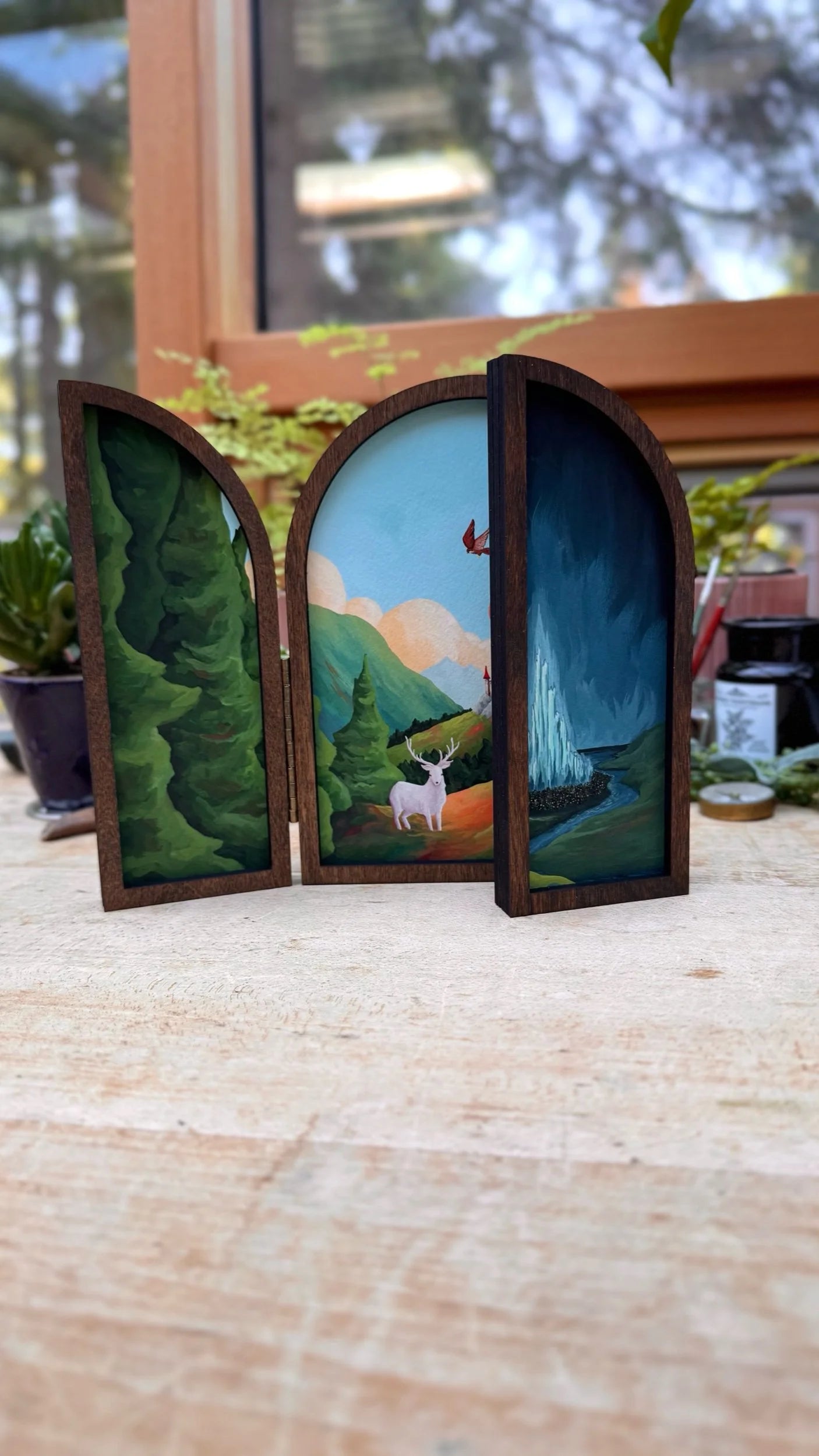 This unique framed, folding print is made from my original hand-painted illustration inspired by the Throne of Glass series. This folding print includes two illustrations - on the outside, you’ll find Aelin looking out over the Glass Palace in Rifthold, from the beginning of the first book. On the inside, you’ll see the city of Orynth in Terrasen, along with the iconic white stag and Rowan flying in the sky. The illustrations are bright and colorful, inspired by descriptions of Aelin.