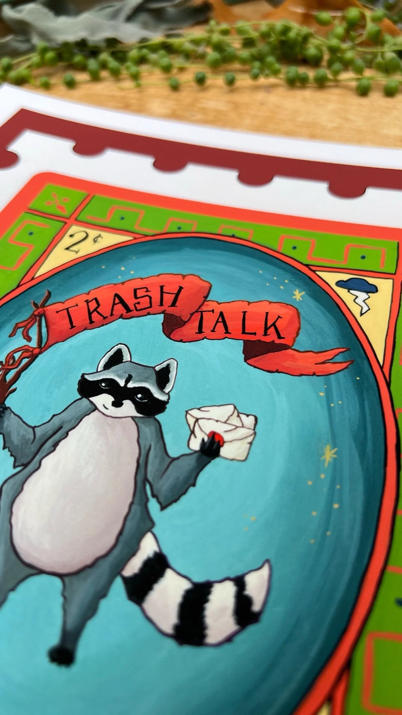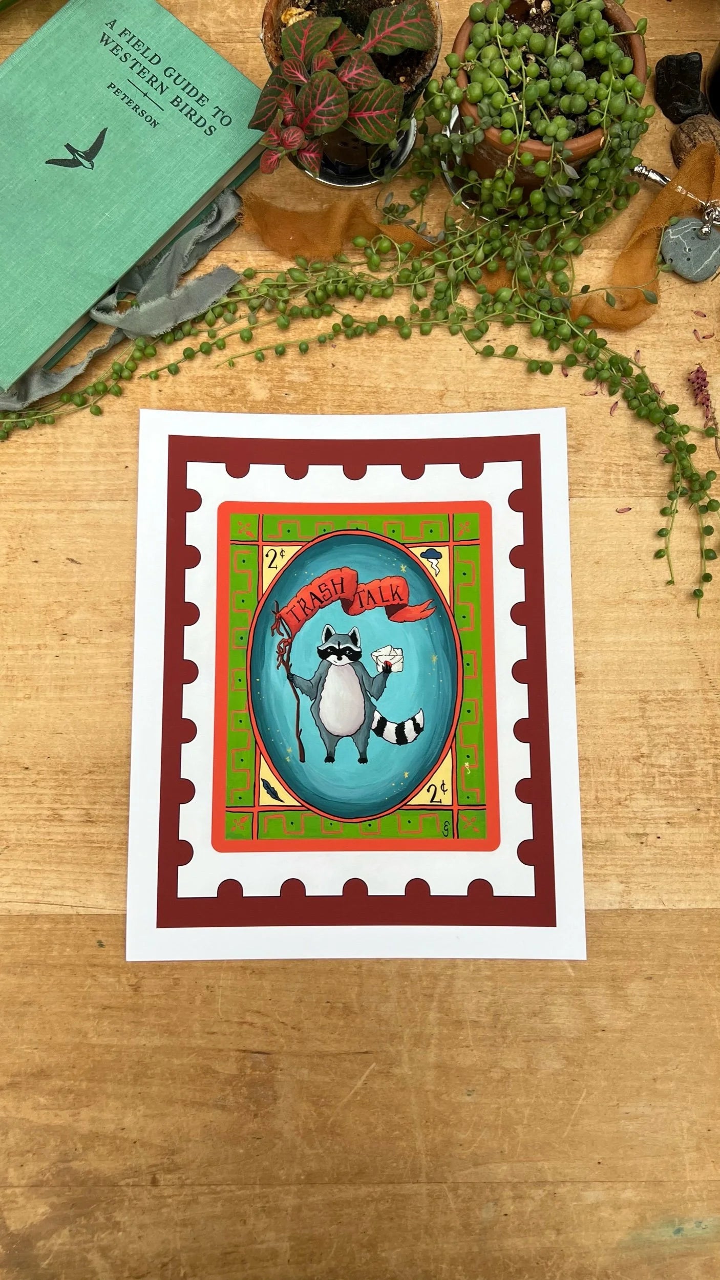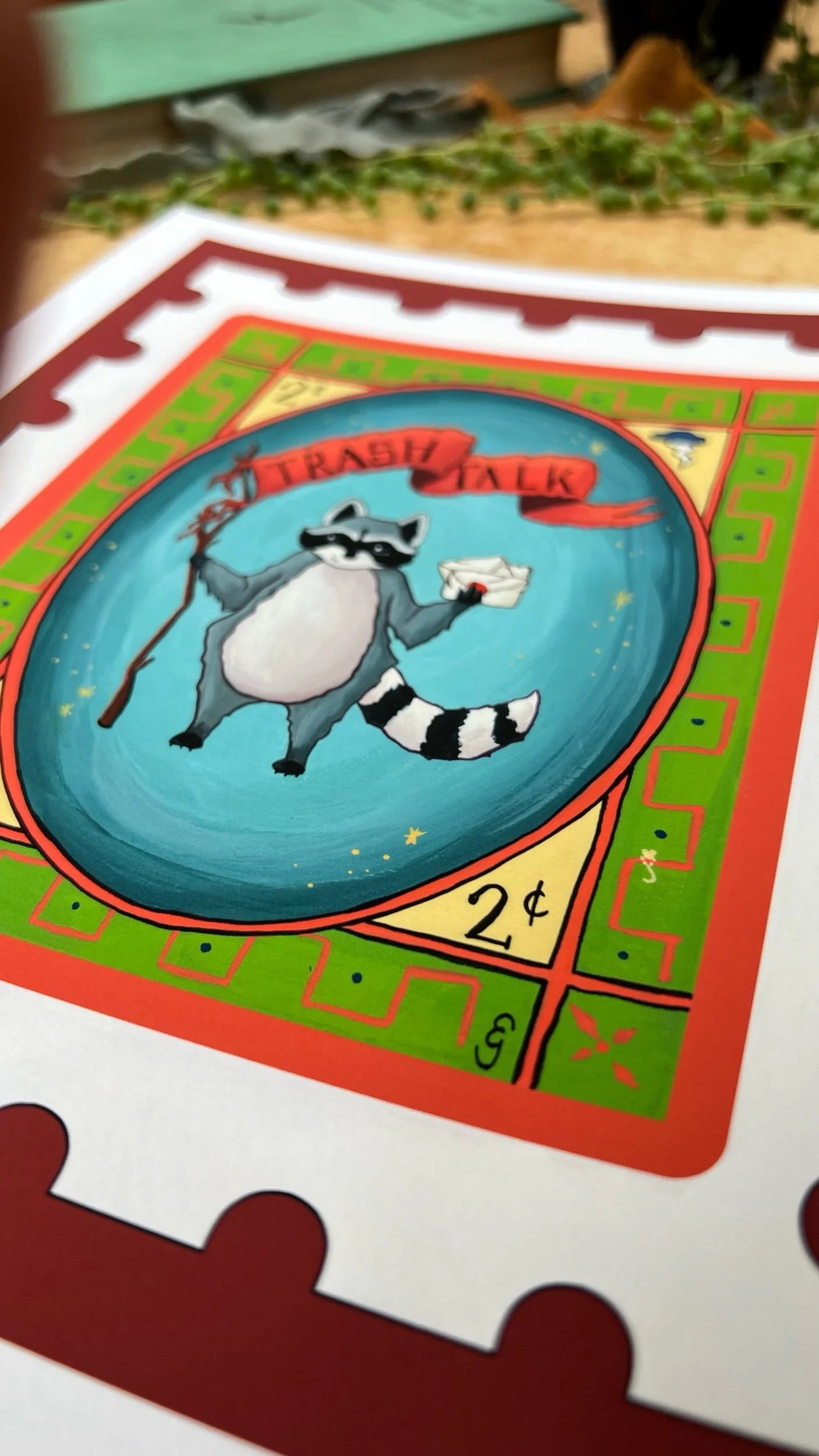 Fine art print of my original, hand-painted “Trash Talk” stamp illustration depicting a delightful little raccoon, who is the perfect choice to deliver all your trash talk, because you never know when you might need to give someone your 2¢. This stamp is part of a series depicting the classes of mail in a fantasy realm where you choose the class of postage based on how fast you’d like your letter to arrive, and it’s then delivered by a delightful assortment of fantastical creatures.