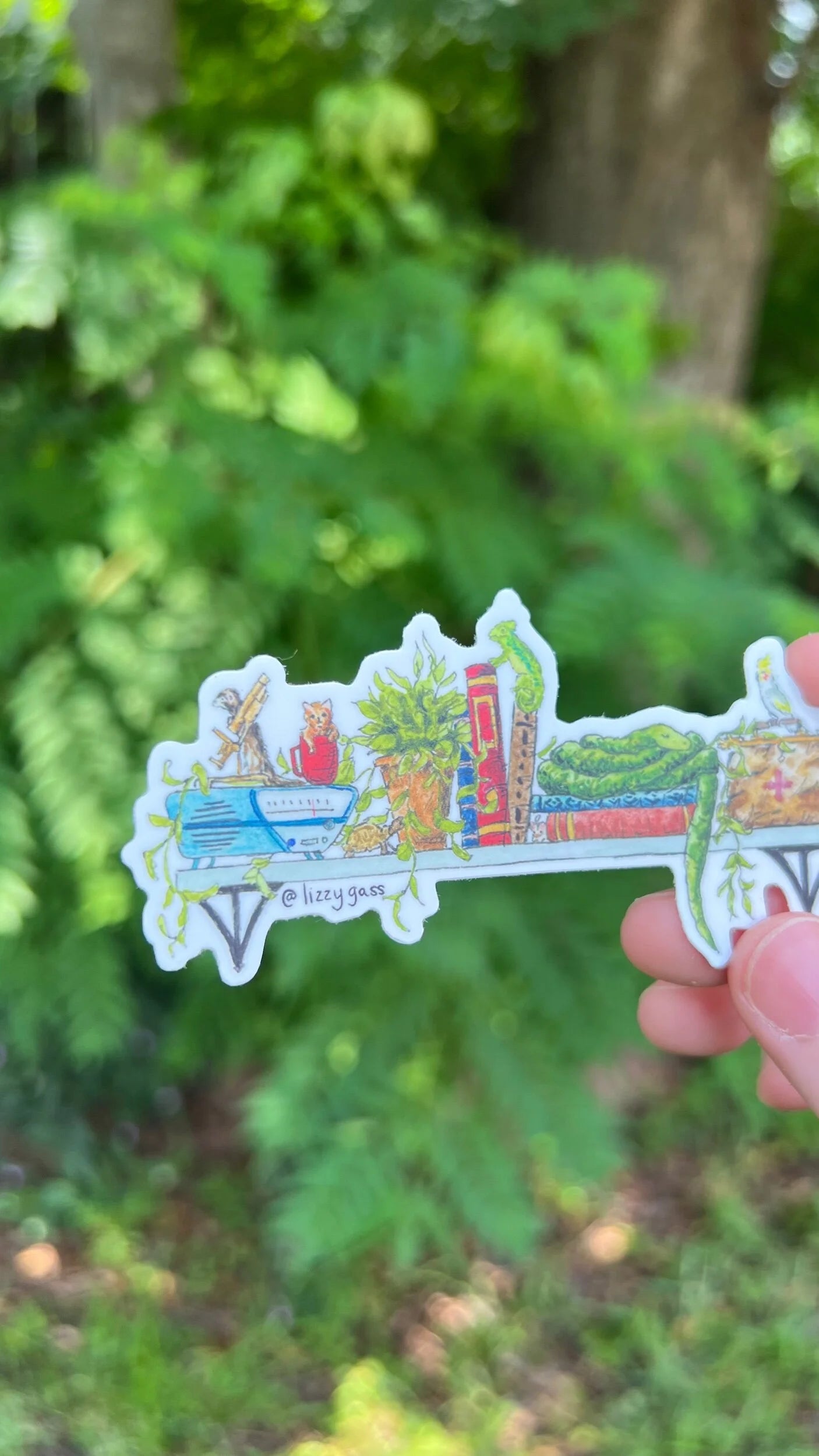 Matte vinyl sticker featuring my original watercolor and ink illustration of the vintage oddities, books, and tools tucked away in the shelves of a veterinarian, including a friendly turtle, an inquisitive ferrets, and a talkative cockatiel.