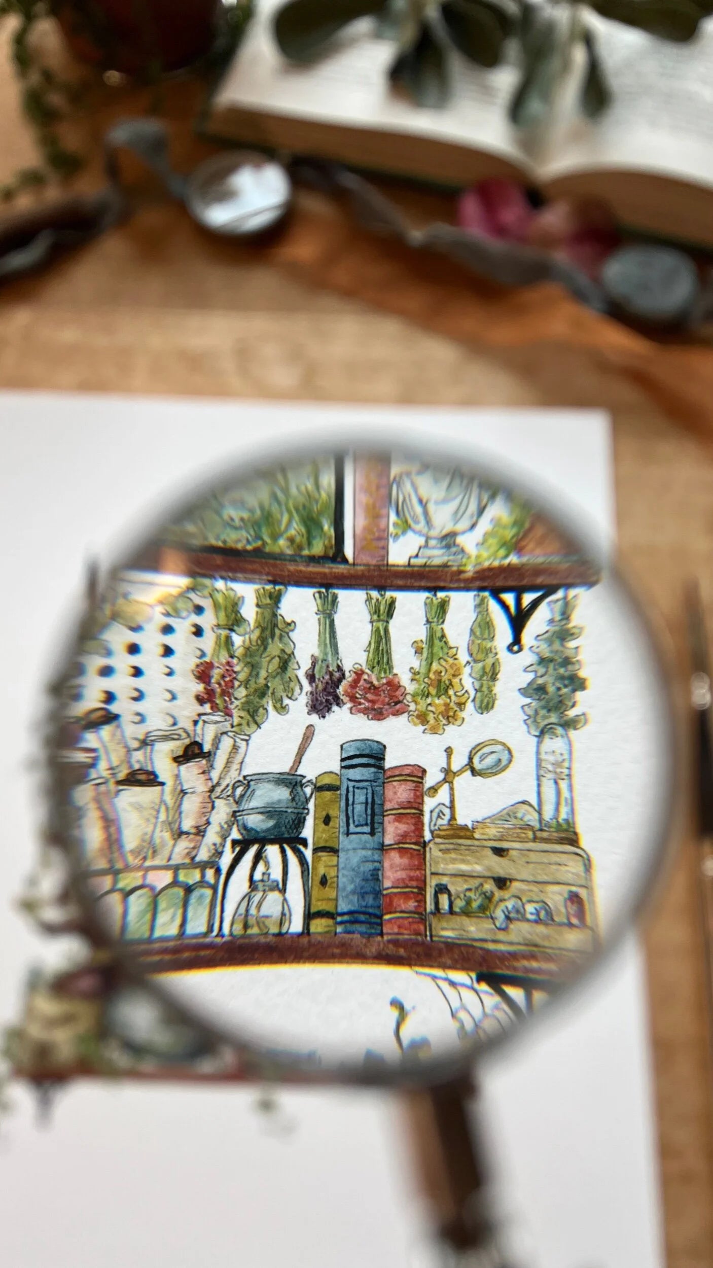 Giclée print featuring my original watercolor and ink illustration of the oddities, books, tools, and trinkets tucked away in the shelves of a witch, including a sunglasses-wearing spirit in a skull, a crystal ball that knows exactly what groceries you need this week, and a black cat.