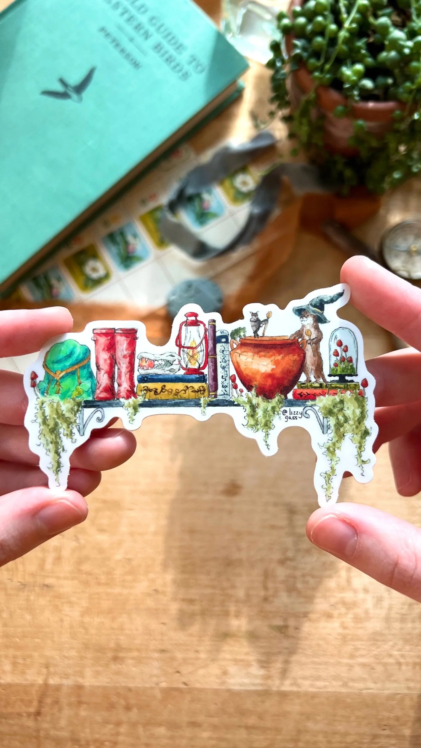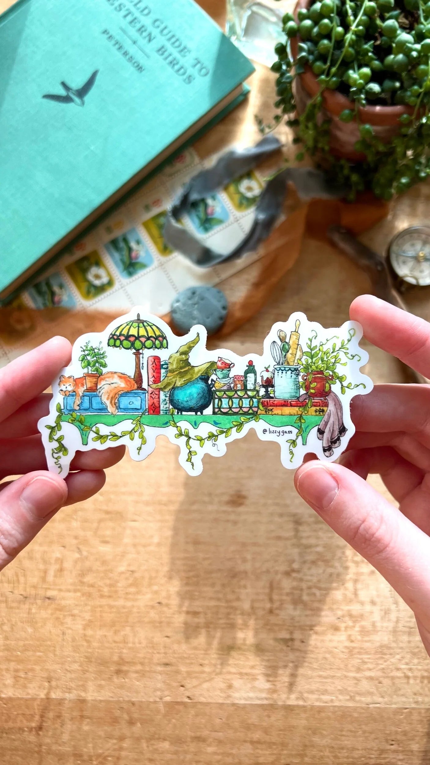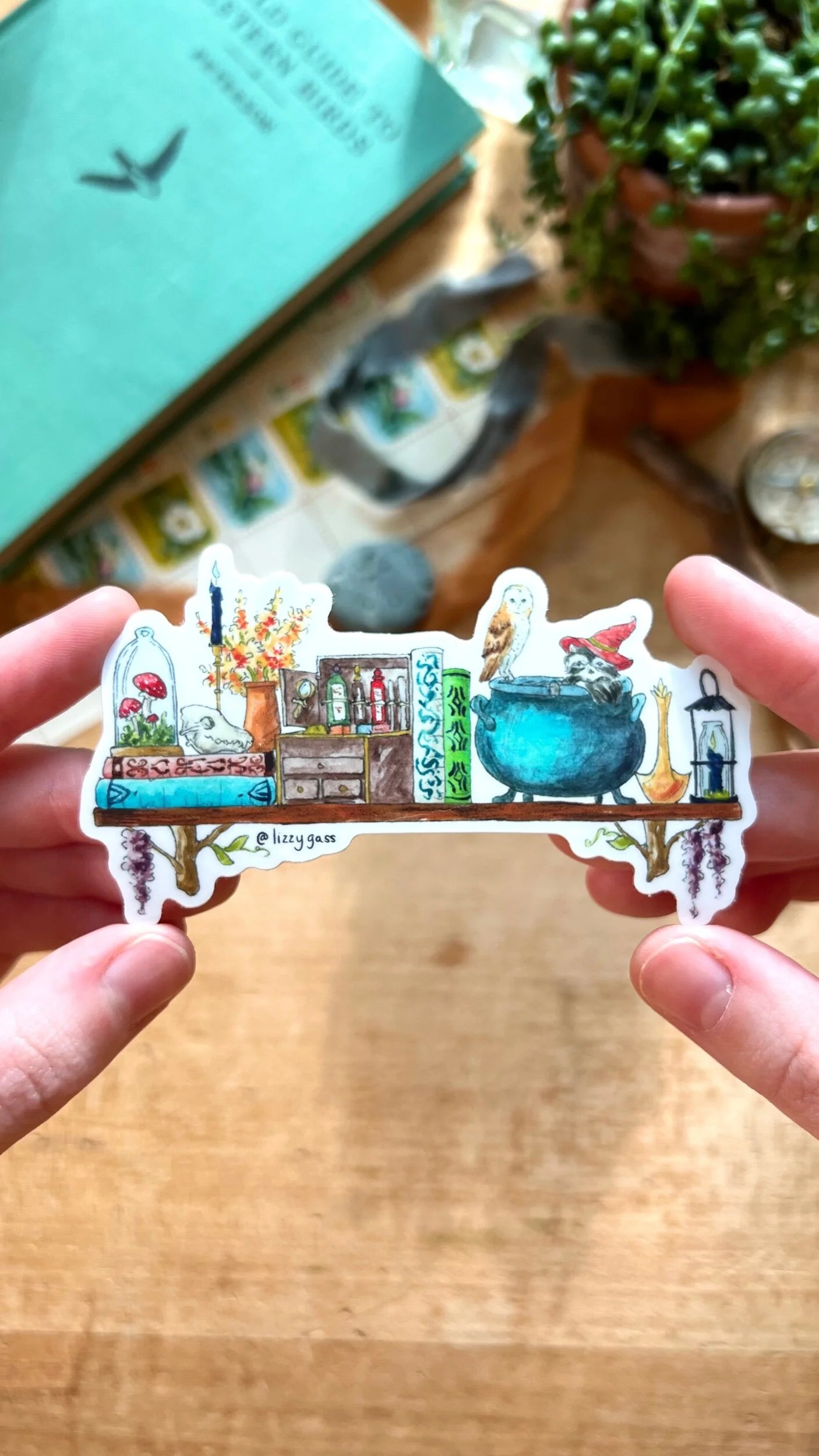 Set of five matte vinyl stickers (one of each design) featuring my original watercolor and ink illustrations of the oddities, books, and trinkets tucked away in the shelves of five witches: a sea witch, swamp witch, forest witch, traditional witch, and kitchen witch.